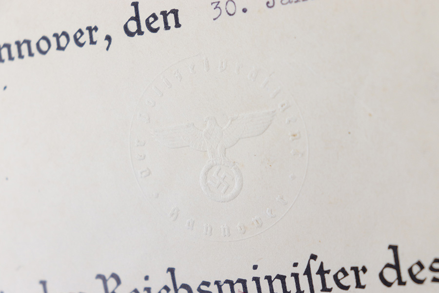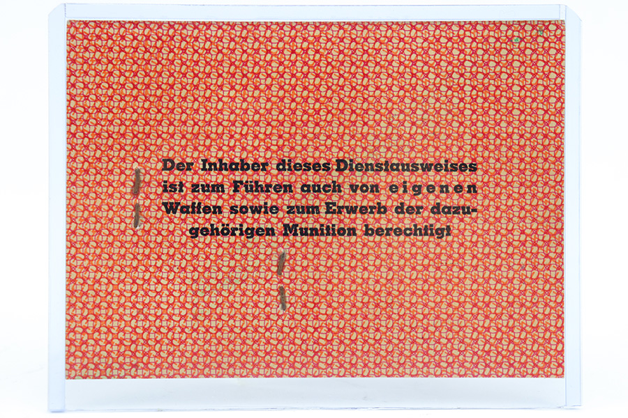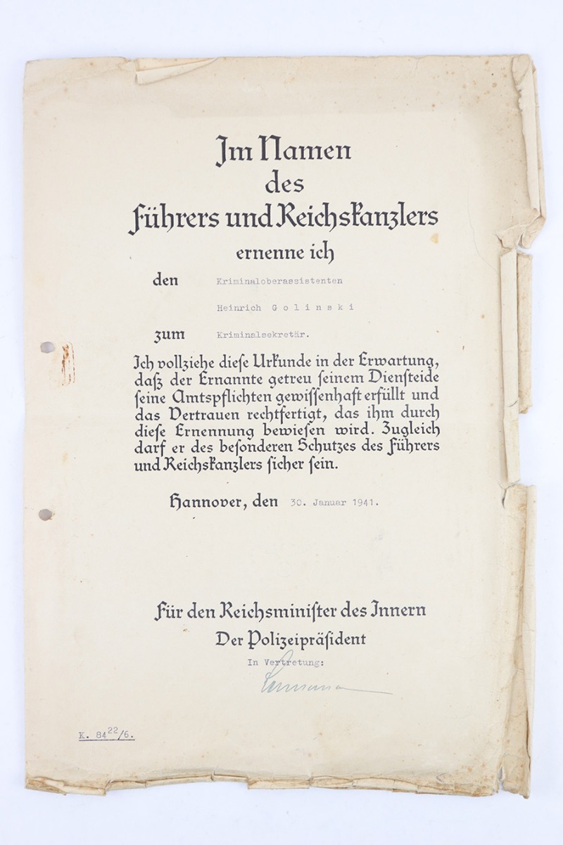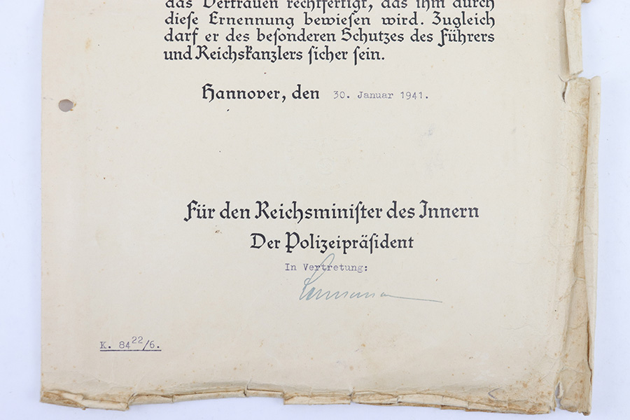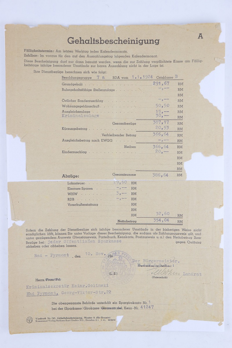4/3/23 – This is an original WW2 German Criminal Police Warrant Disc with Documentation. The documents are attributed to a German inspector stationed in Bad, Pyrmont Germany. The warrant disc badge number “9945” corresponds to the “service card number” on Heinrich Golinski’s original I.D. card. We also have this person’s original Police “Kriminalskretar” (Criminal Police Secretary) certification document from 1941, and a copy of an original pay statement dated November 10, 1944. The pay statement shows that this Police inspector had children, and the document is signed by the mayor of Bad, Pyrmont. The pay statement is torn at the center-fold, but the other documents are intact and in great condition. Only a handful of warrant discs have been attributed to an actual Police investigator, making this example an extremely rare find. The disc is in great condition as shown. More information can be found on our YouTube channel, where we’ve published a video on this particular offering.