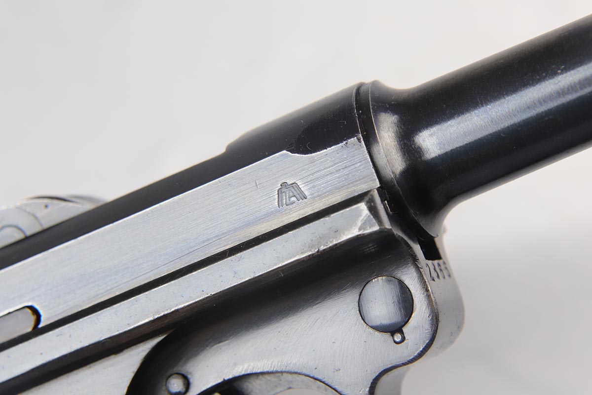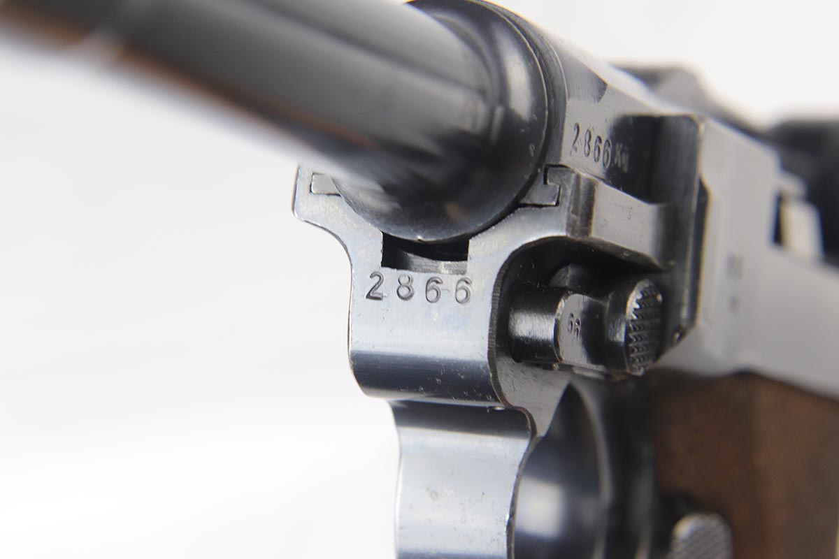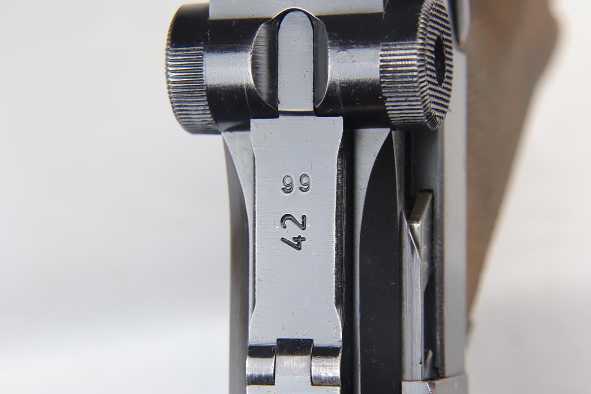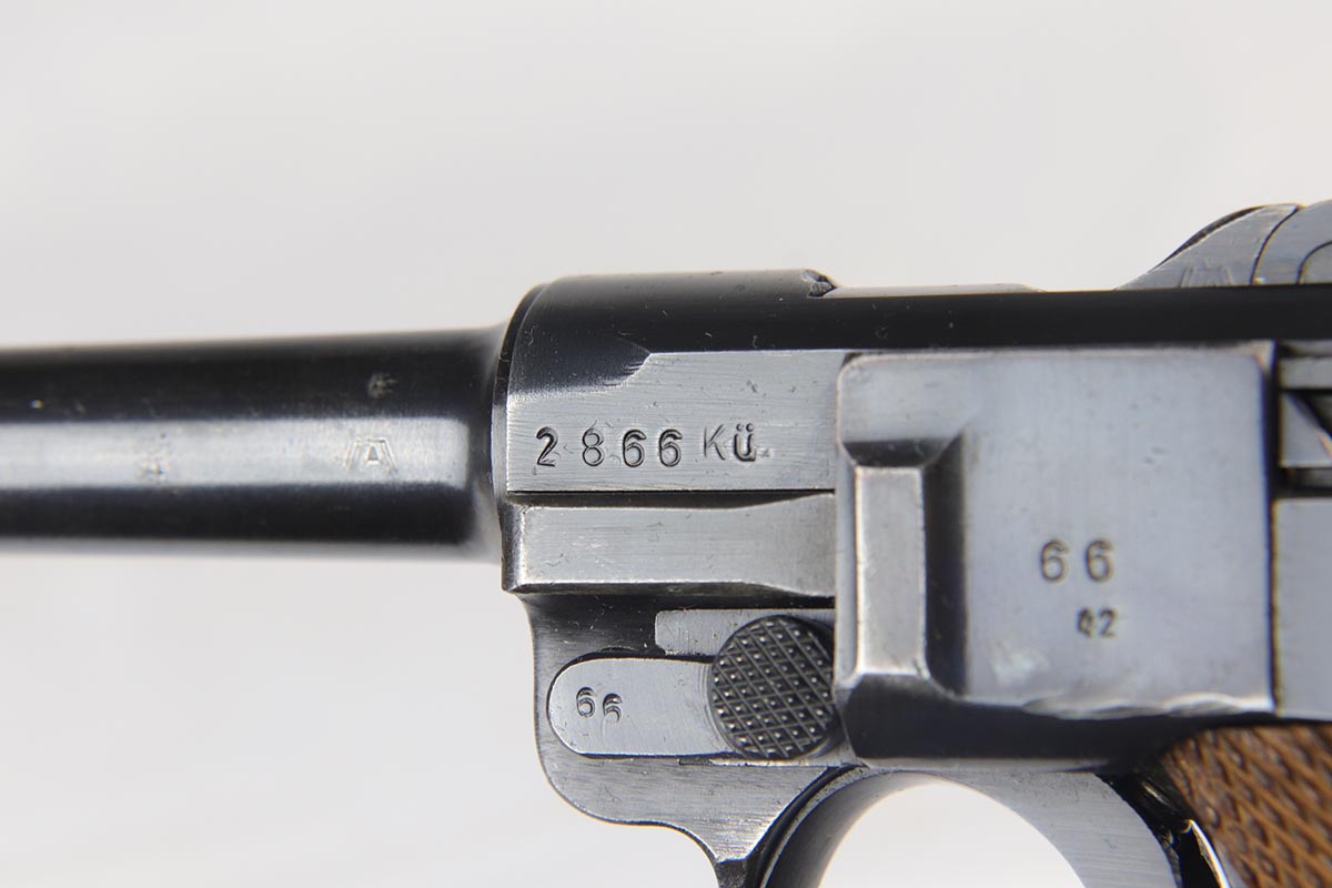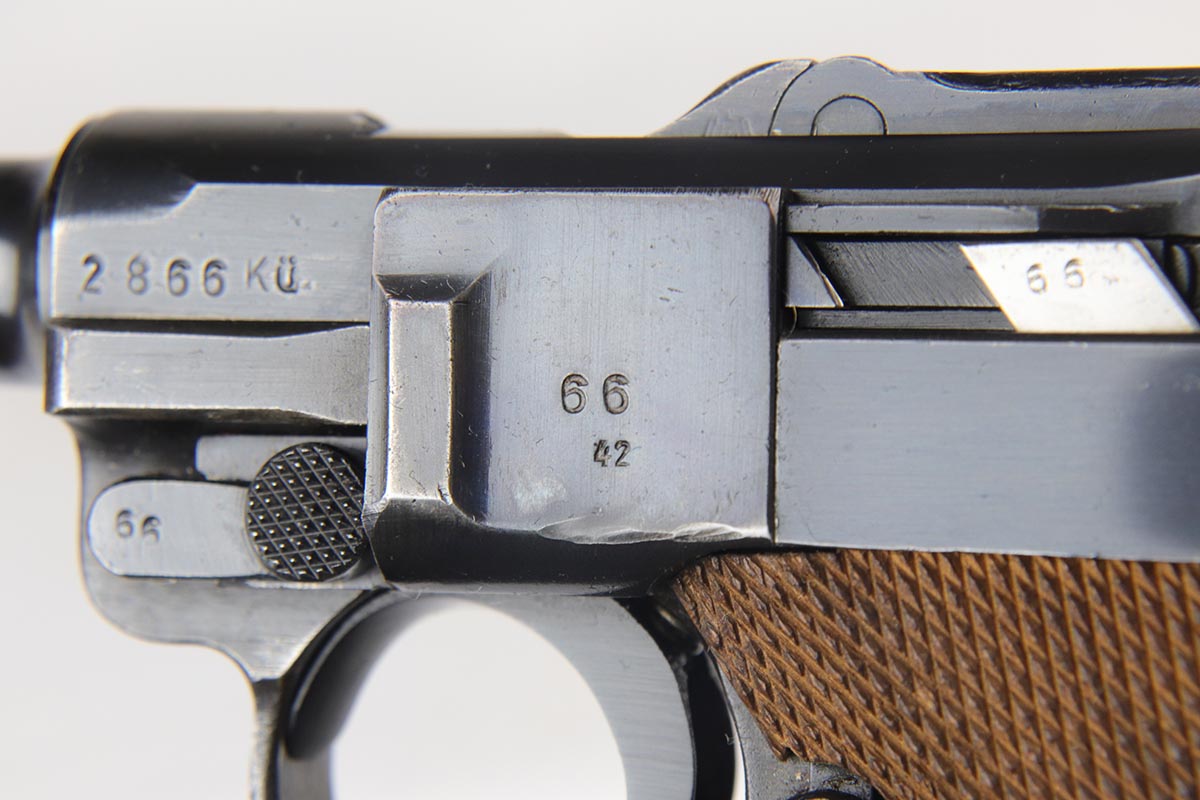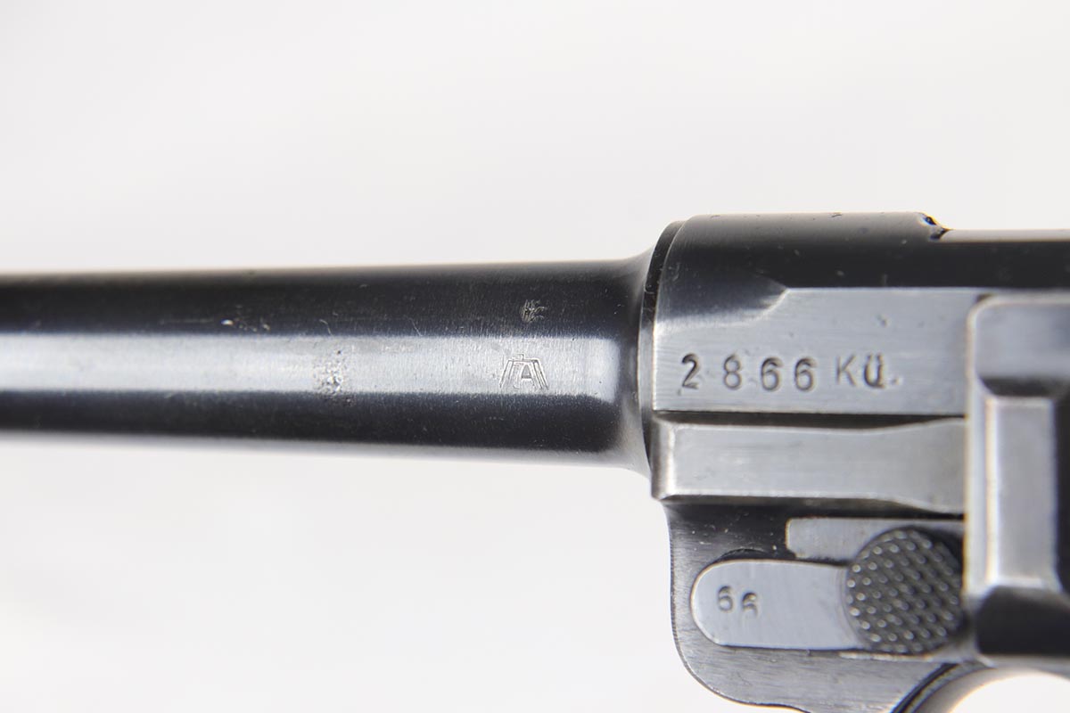 6/20/18 – Listed here is an excellent example of the very well known and highly sought after Luftwaffe Inspected Ku marked Luger.  This particular pistol comes from Jan Still’s collection and is documented in both Axis Pistols and Third Reich Lugers, pages 142 and 103, respectively.  This is one of the approx 5,000 that were produced with the Ku suffix.  The pistol is completely matching to include the aluminum bottom fxo coded magazine, and the gun comes with a spare Black Widow magazine.  The chamber is 41 dated with a ’42’ code toggle.  Barrel and receiver are Luftwaffe eagle marked.  The finish on the gun rates at about 96-97%, with minor edge wear on muzzle, sideplate and stock lug.  The bore is excellent.  The grips are matching to the gun with full four-digit serial, which is proper for this variation.  Three Luftwaffe inspection stamps and the use of replacement parts and a blue finish that was not as well done as Mauser production are all the classic signs of the Ku luger.  There has been more speculation about the origin and circumstances surrounding these Lugers than any other WW2 Variant Luger.  The prevailing theory is that they were assembled in very early 1943 for the Luftwaffe out of leftover Mauser parts by an unknown contractor that the code Ku stands for.  This has been assumed to be the firm of  Adolph Kurschner – Metalwaffenfabrik in Bavaria, but this may never be definitively verified.