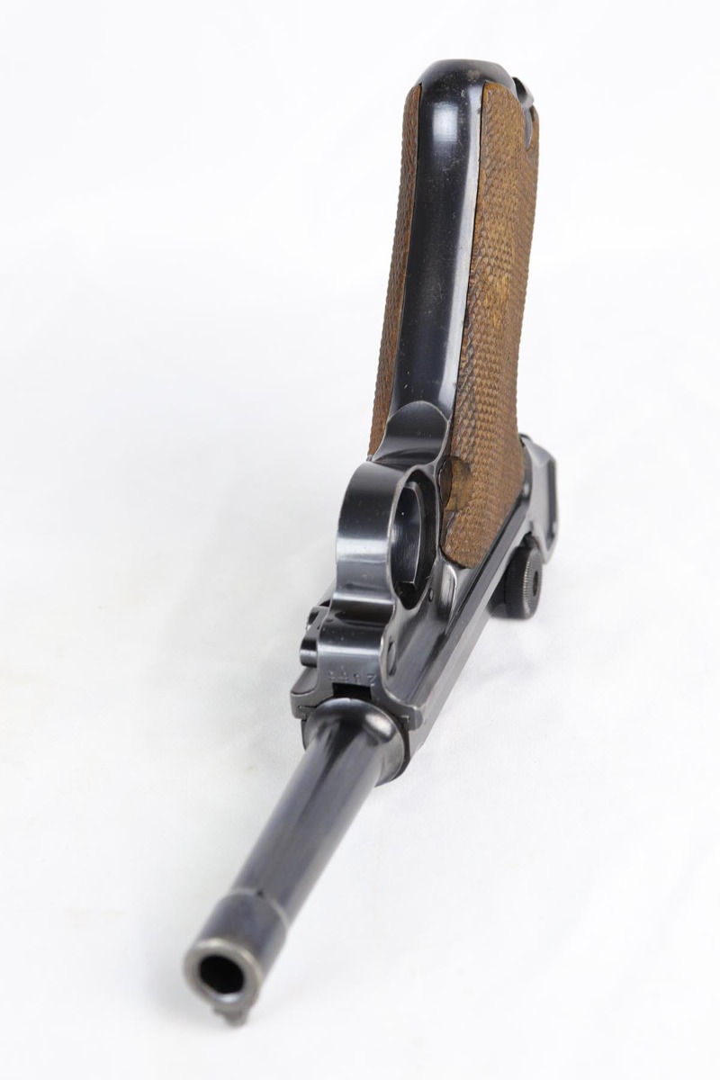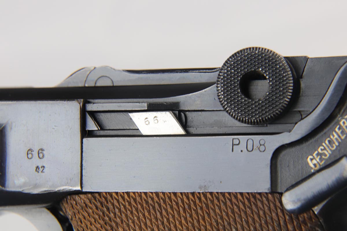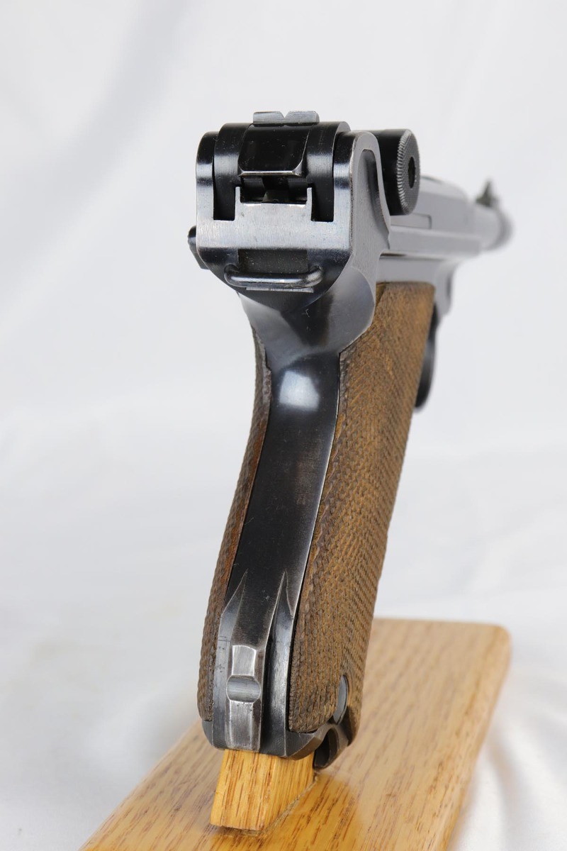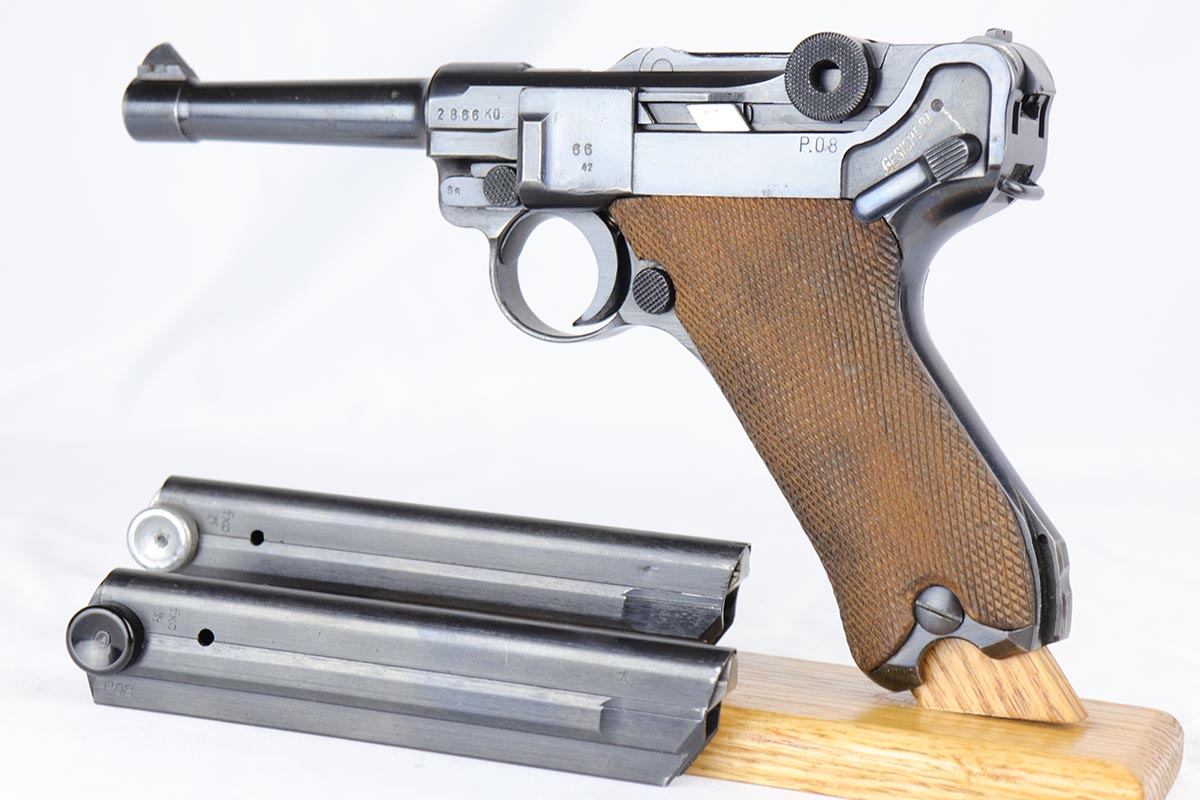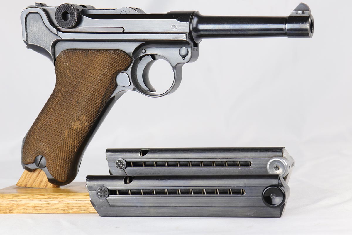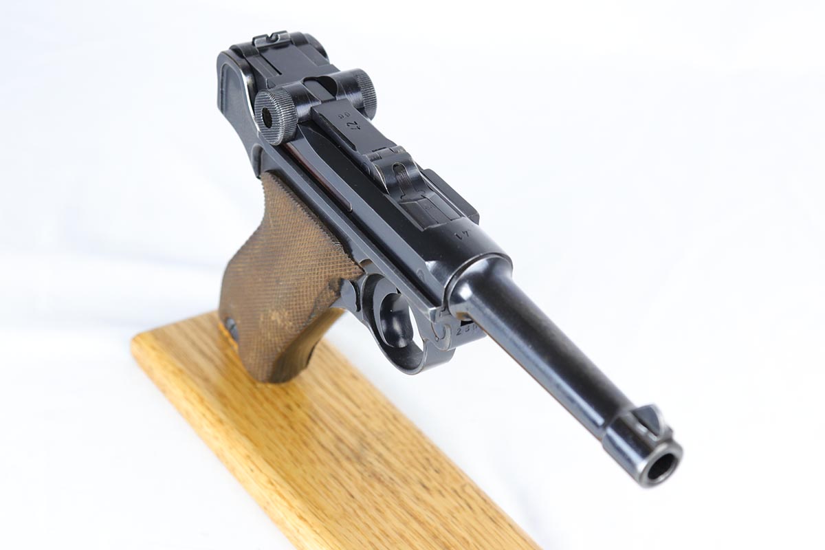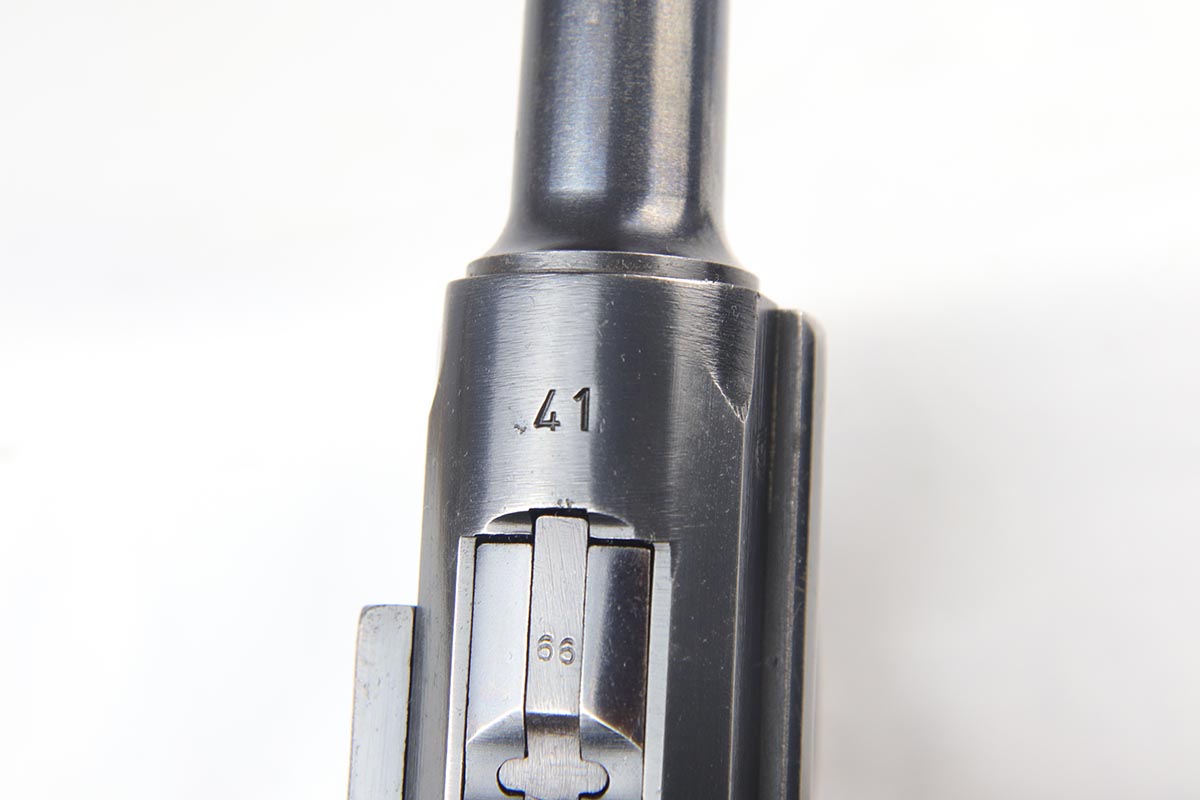 6/20/18 – Listed here is an excellent example of the very well known and highly sought after Luftwaffe Inspected Ku marked Luger.  This particular pistol comes from Jan Still’s collection and is documented in both Axis Pistols and Third Reich Lugers, pages 142 and 103, respectively.  This is one of the approx 5,000 that were produced with the Ku suffix.  The pistol is completely matching to include the aluminum bottom fxo coded magazine, and the gun comes with a spare Black Widow magazine.  The chamber is 41 dated with a ’42’ code toggle.  Barrel and receiver are Luftwaffe eagle marked.  The finish on the gun rates at about 96-97%, with minor edge wear on muzzle, sideplate and stock lug.  The bore is excellent.  The grips are matching to the gun with full four-digit serial, which is proper for this variation.  Three Luftwaffe inspection stamps and the use of replacement parts and a blue finish that was not as well done as Mauser production are all the classic signs of the Ku luger.  There has been more speculation about the origin and circumstances surrounding these Lugers than any other WW2 Variant Luger.  The prevailing theory is that they were assembled in very early 1943 for the Luftwaffe out of leftover Mauser parts by an unknown contractor that the code Ku stands for.  This has been assumed to be the firm of  Adolph Kurschner – Metalwaffenfabrik in Bavaria, but this may never be definitively verified.