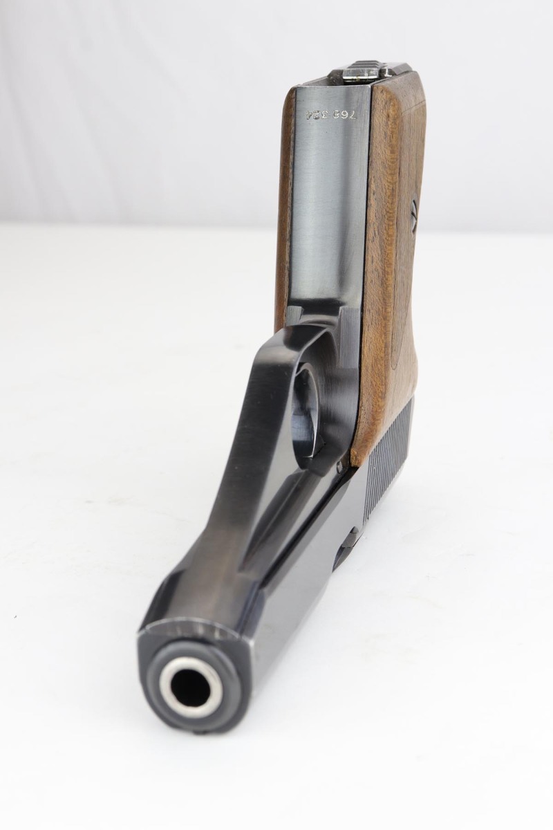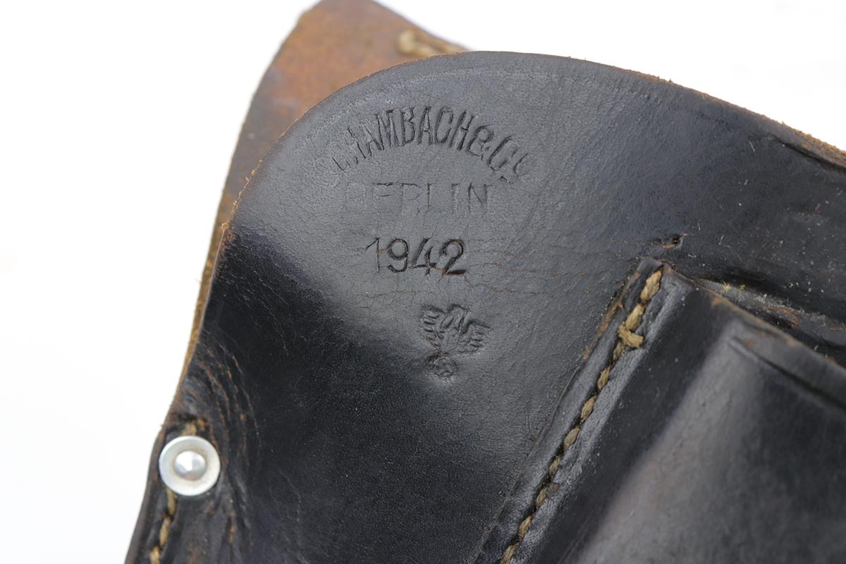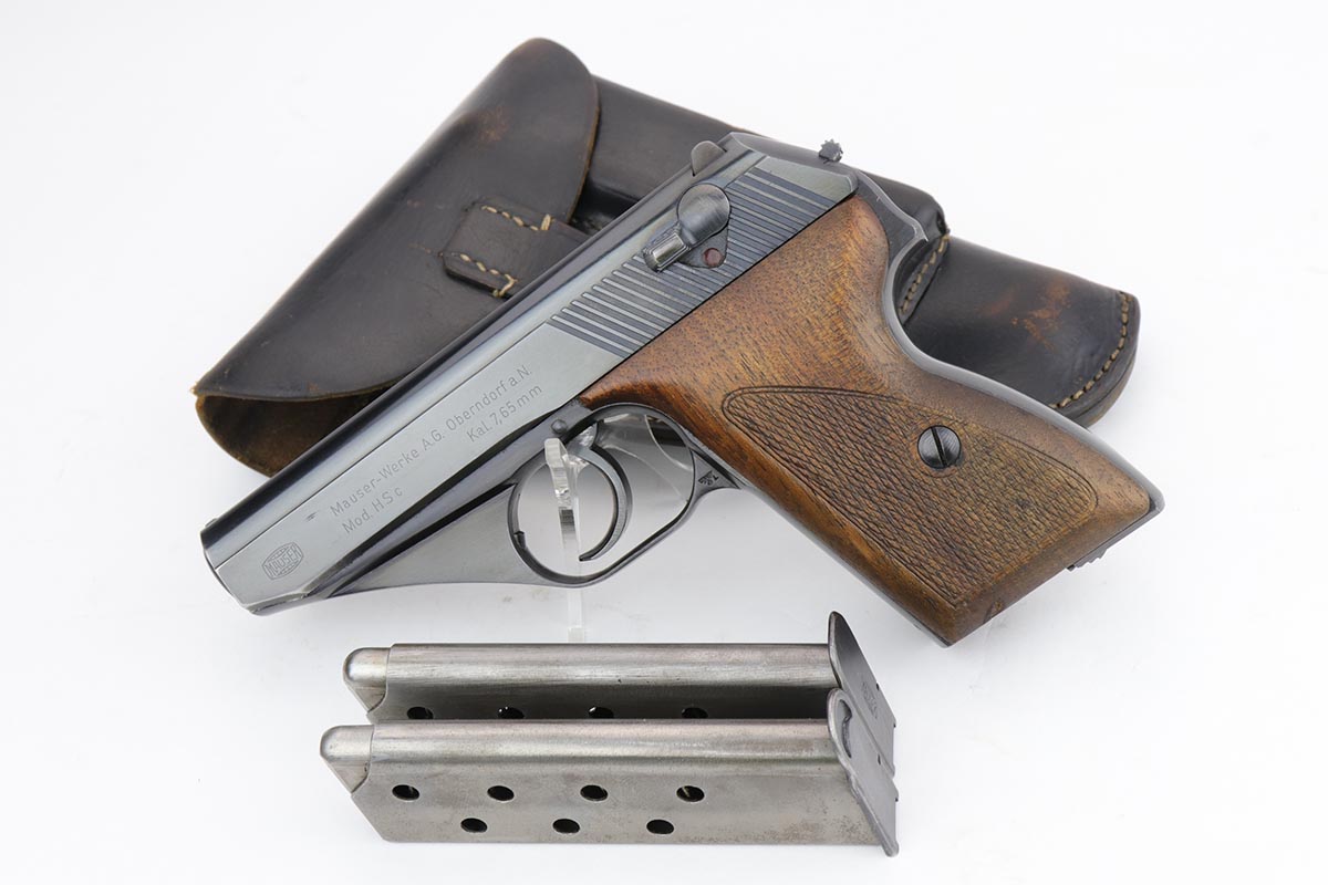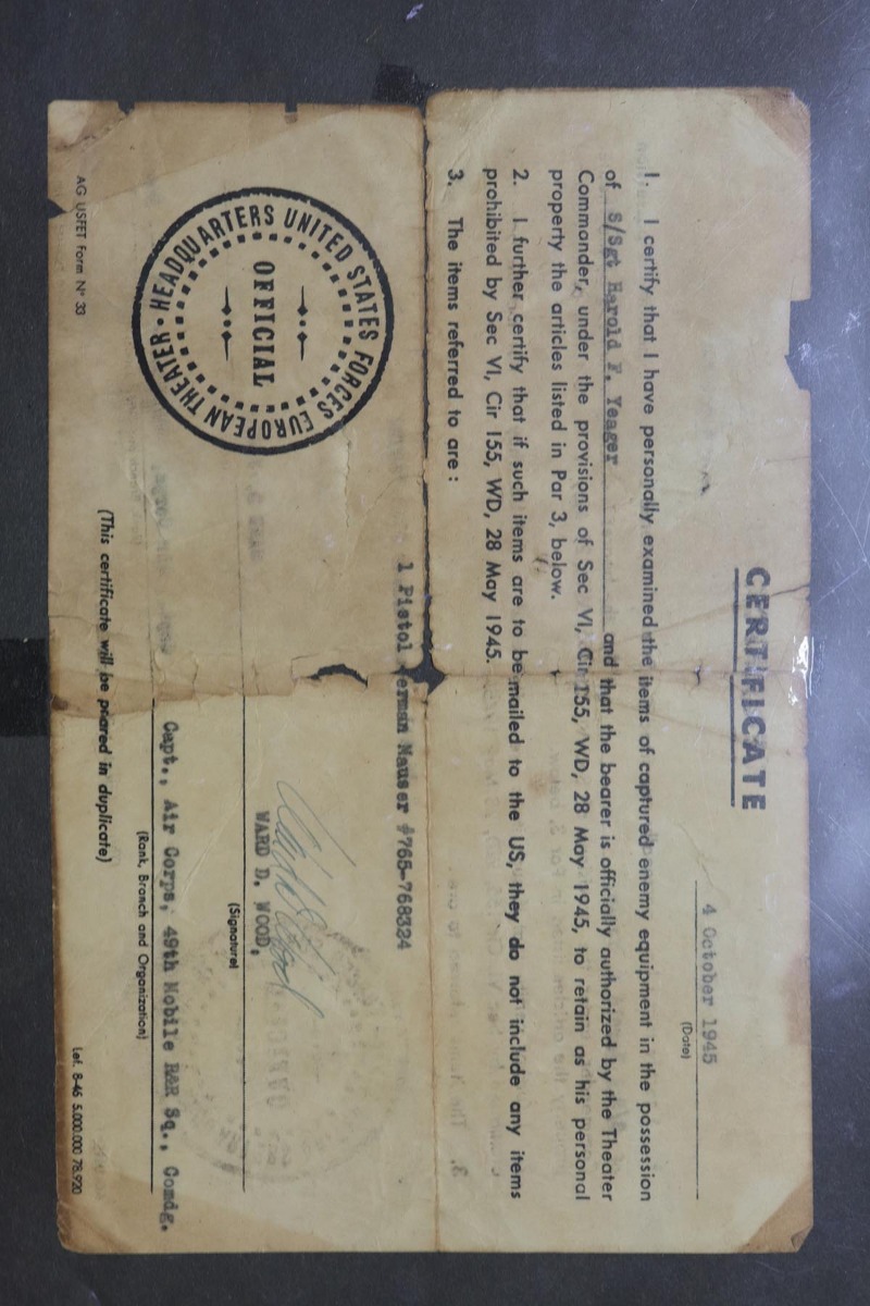2/21/20 – This is a beautiful Police issued Mauser HSc rig that was manufactured in 1942, then captured and brought back to the states by S/Sgt Harold Yeager in October of 1945. This listing comes with the original capture document, holster, spare magazine, and a binder of photos of Yeager that help to detail his time in the Air Corps during the war, as well as some of his personal life back in the states. The gun itself has about 98% of the original, high-polish blue, with most of the finish loss on the back strap. Mint bore and excellent grips. Rig includes a banner magazine and a half-moon magazine. The holster is 1942 dated and Berlin marked. It’s in very good condition with minor signs of age and handling wear. We recently posted a Youtube video on this particular gun, which can be found in the last image file for this listing.
