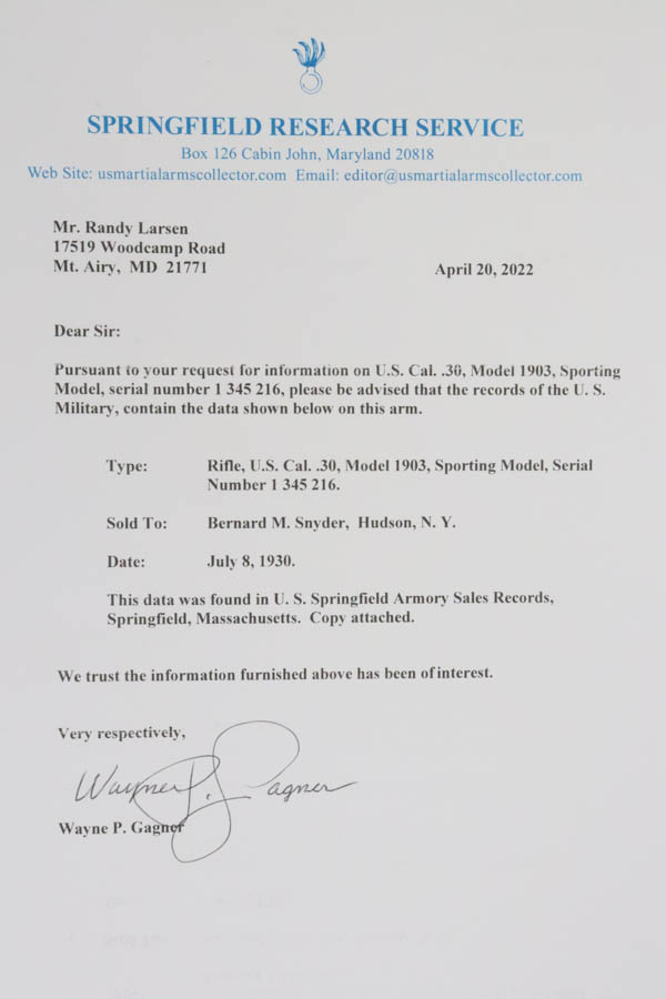 SOLD – Documented Springfield 1903 Sporting Model – 1930 mfg