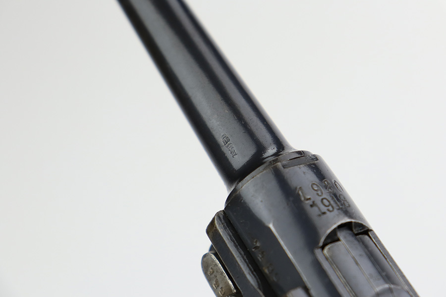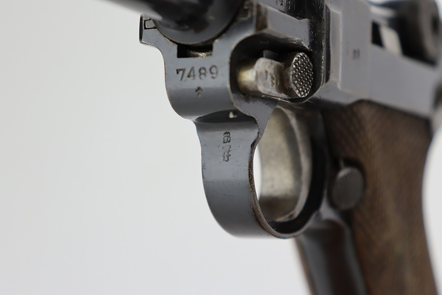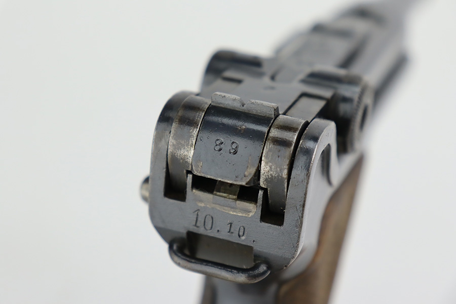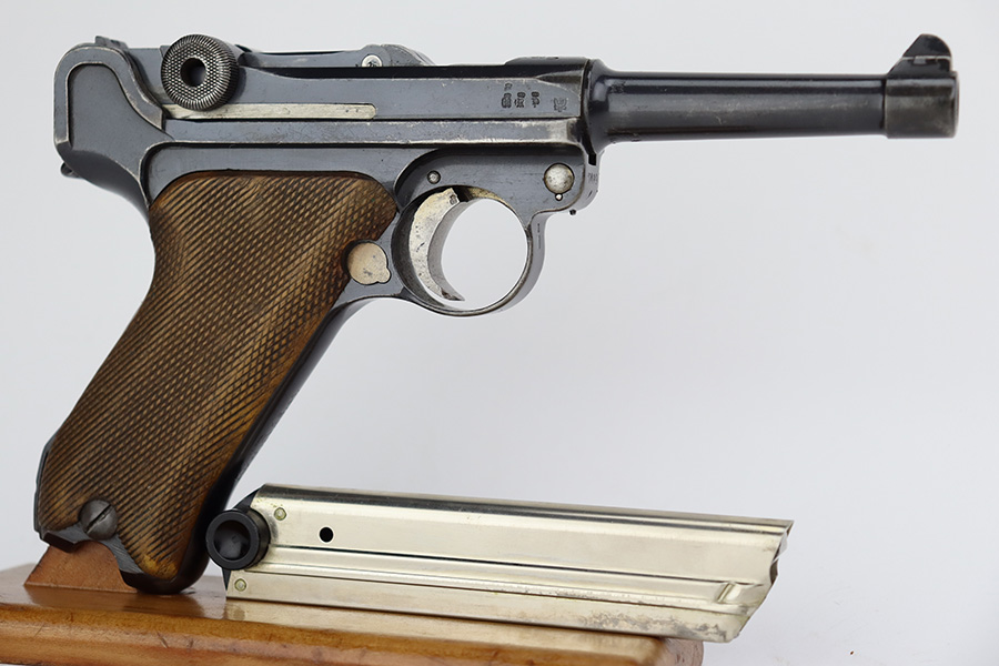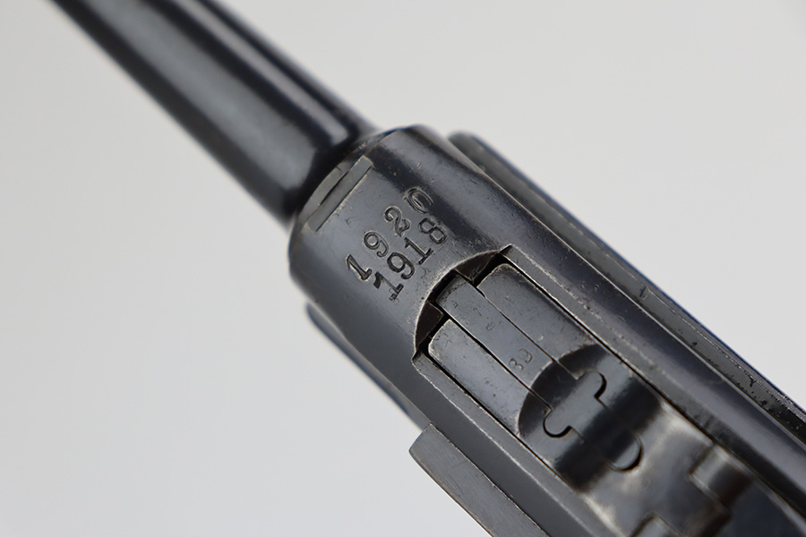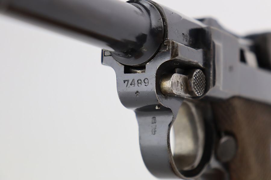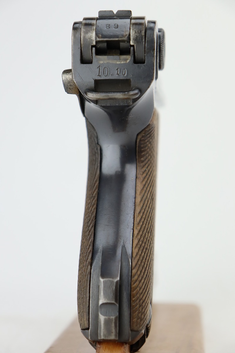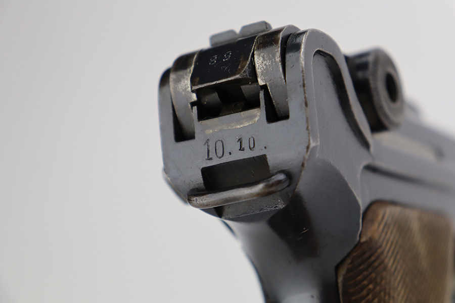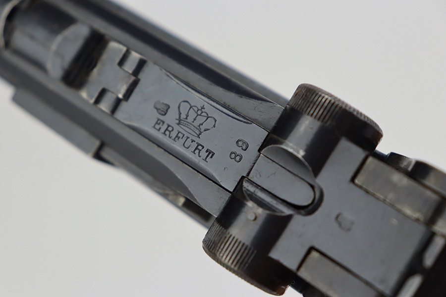 8/25/23 – This is a very nice example of an Erfurt Luger issued to the Imperial German military in 1918. It is all matching and has the proper Imperial and Erfurt proofs throughout. There is a “10./J.R.15.10.” unit marking on the front strap. “Crown RC” markings on the barrel, slide, and frame. There is a “1920” government property on the chamber, indicating it remained in government service following WW1. It has retained about 90% of its bluing with areas of wear along the barrel, on the side plate, and on the side rails. Some discoloration on the side plate as well. There are tiny handling marks throughout. Fitted with fairly worn matching-numbered and Erfurt-proofed wood grips. Comes with a reproduction magazine. The bore has decent rifling, but there is pitting in the grooves.