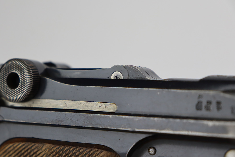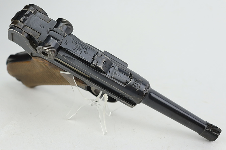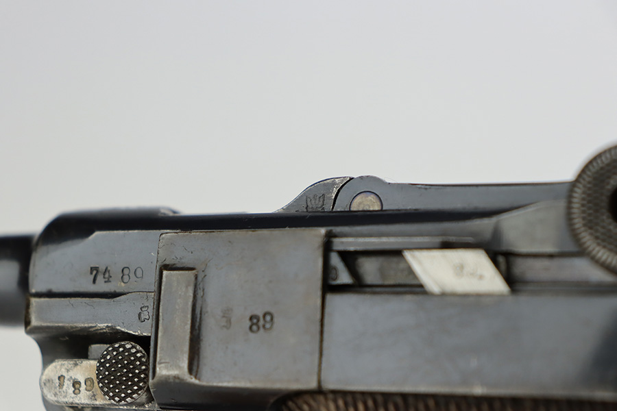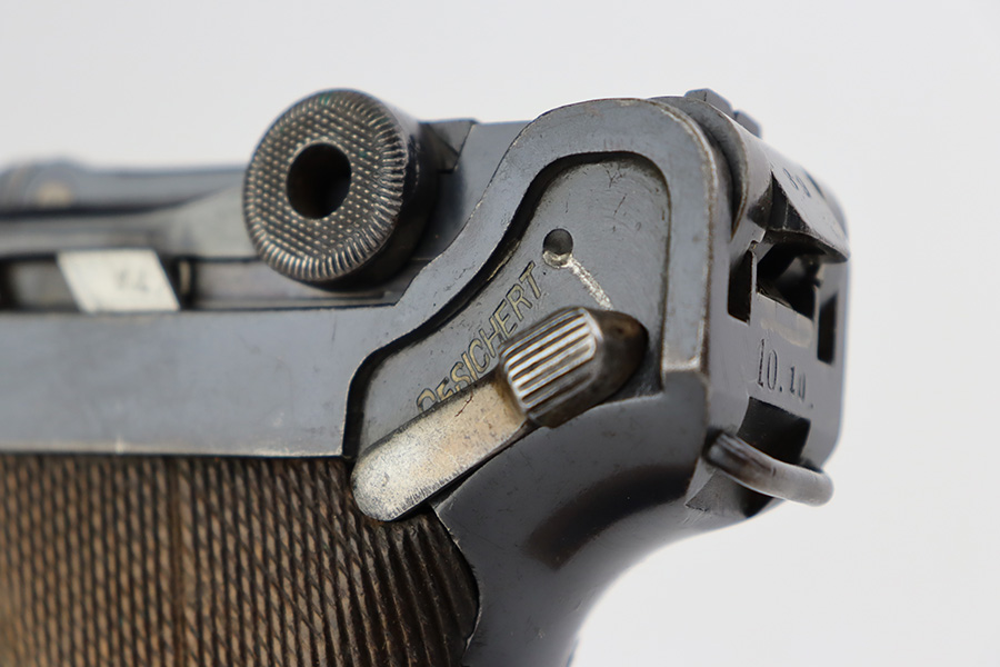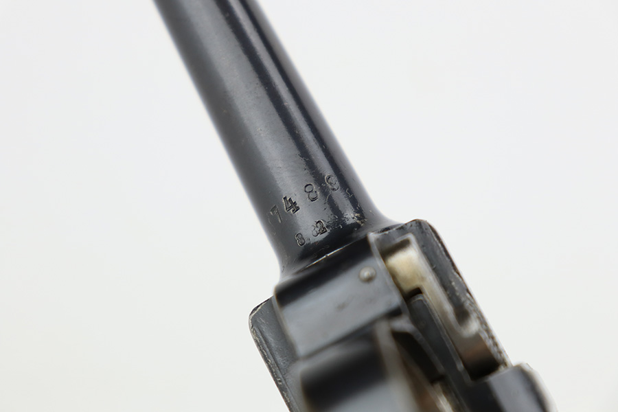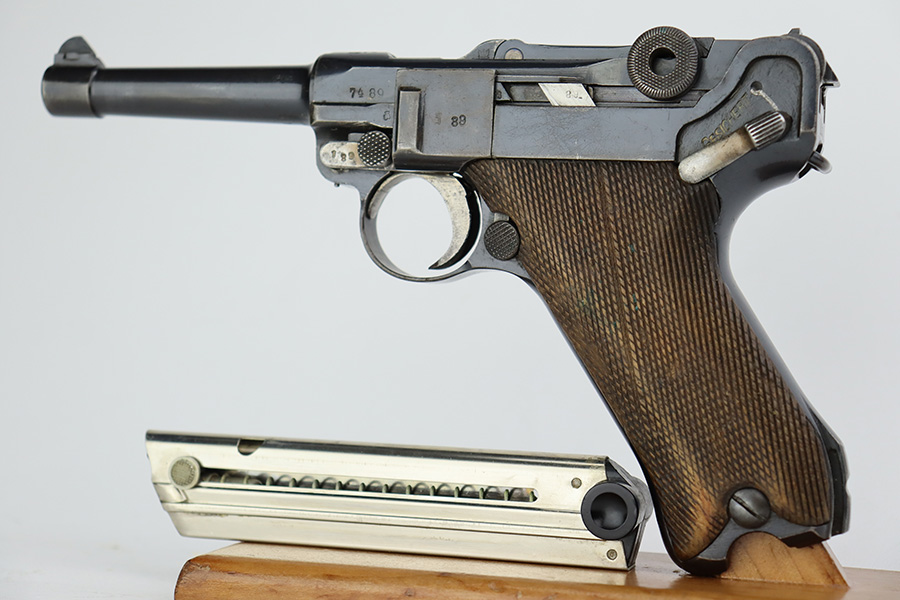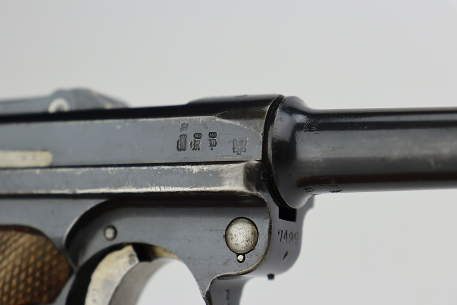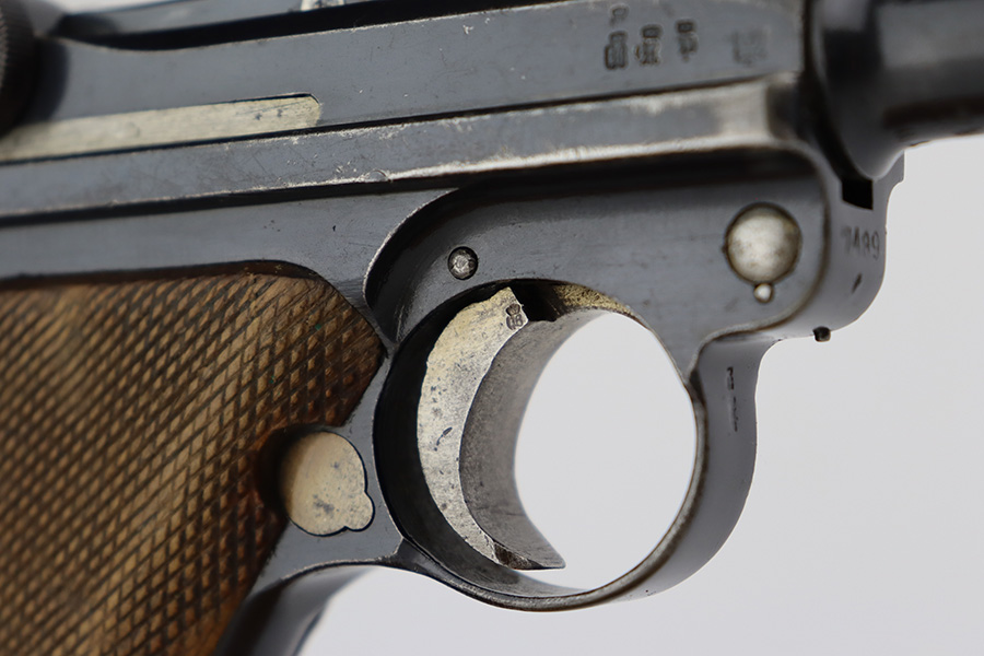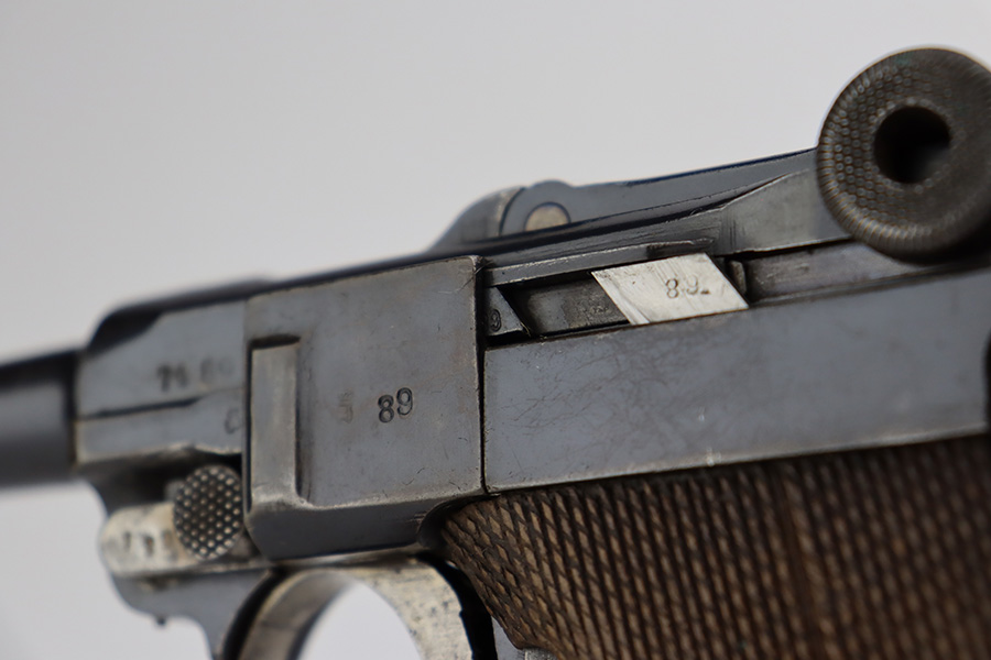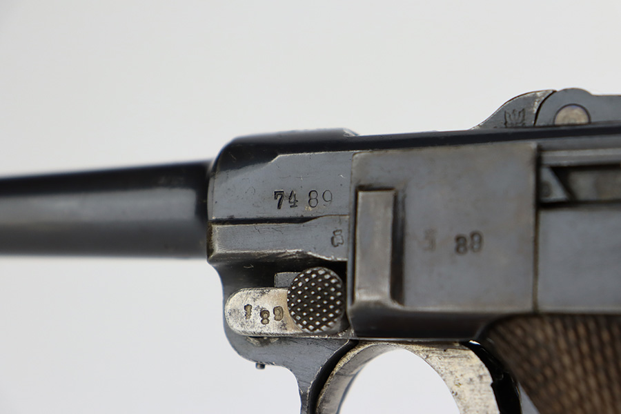 8/25/23 – This is a very nice example of an Erfurt Luger issued to the Imperial German military in 1918. It is all matching and has the proper Imperial and Erfurt proofs throughout. There is a “10./J.R.15.10.” unit marking on the front strap. “Crown RC” markings on the barrel, slide, and frame. There is a “1920” government property on the chamber, indicating it remained in government service following WW1. It has retained about 90% of its bluing with areas of wear along the barrel, on the side plate, and on the side rails. Some discoloration on the side plate as well. There are tiny handling marks throughout. Fitted with fairly worn matching-numbered and Erfurt-proofed wood grips. Comes with a reproduction magazine. The bore has decent rifling, but there is pitting in the grooves.