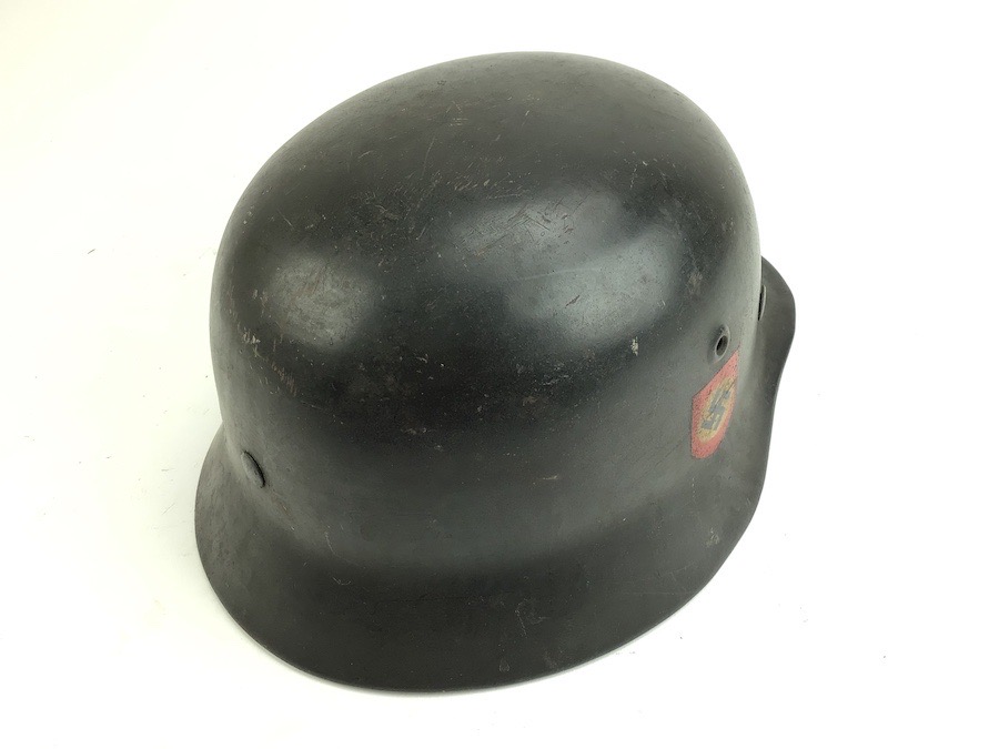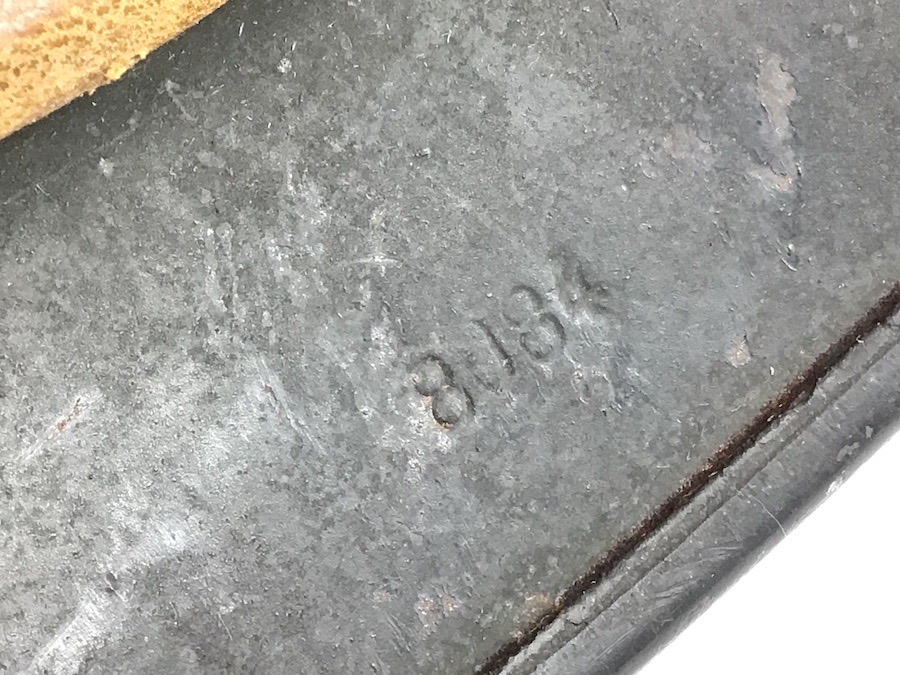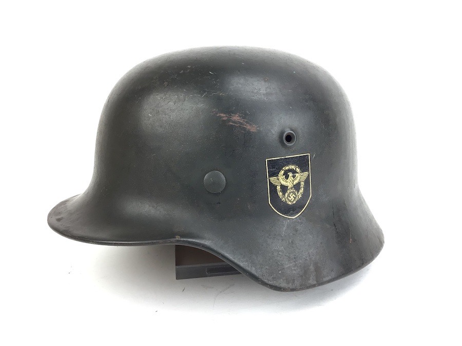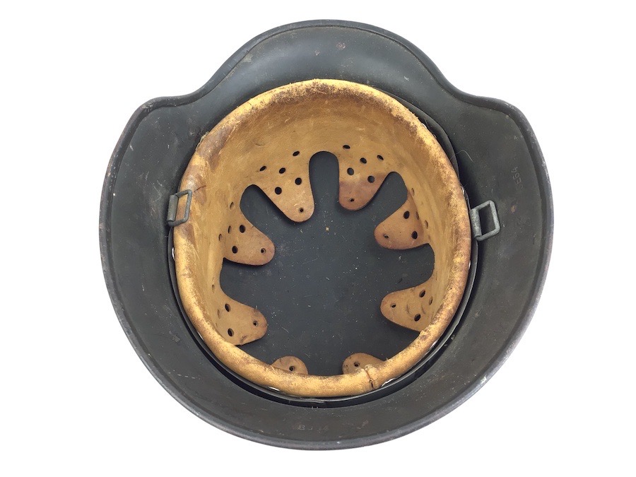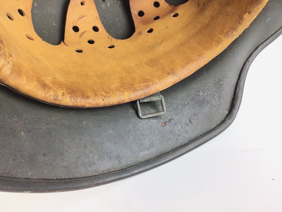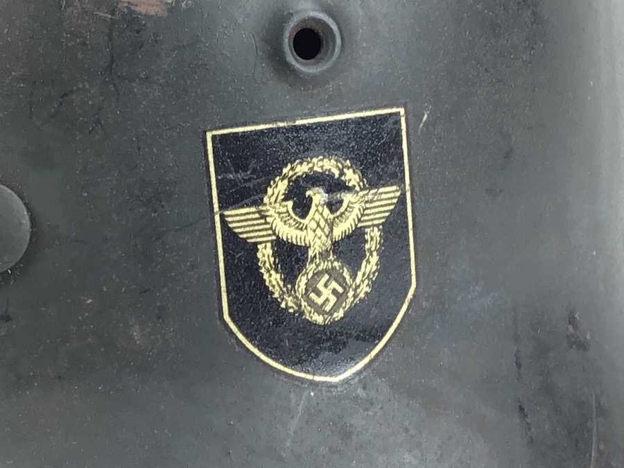 6/5/24 – This is an original German Police Double Decal helmet from WW2. The helmet has light surface wear and patina throughout the exterior but no major dents or issues. Both decals are visible and about 80-90% condition each. The interior leather liner is still present and ink stamped with a “56”, but is missing the cord and chin strap. Helmet interior rim is stamped with “SE64” and “8J84”.