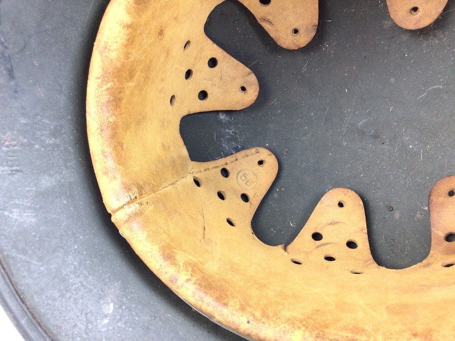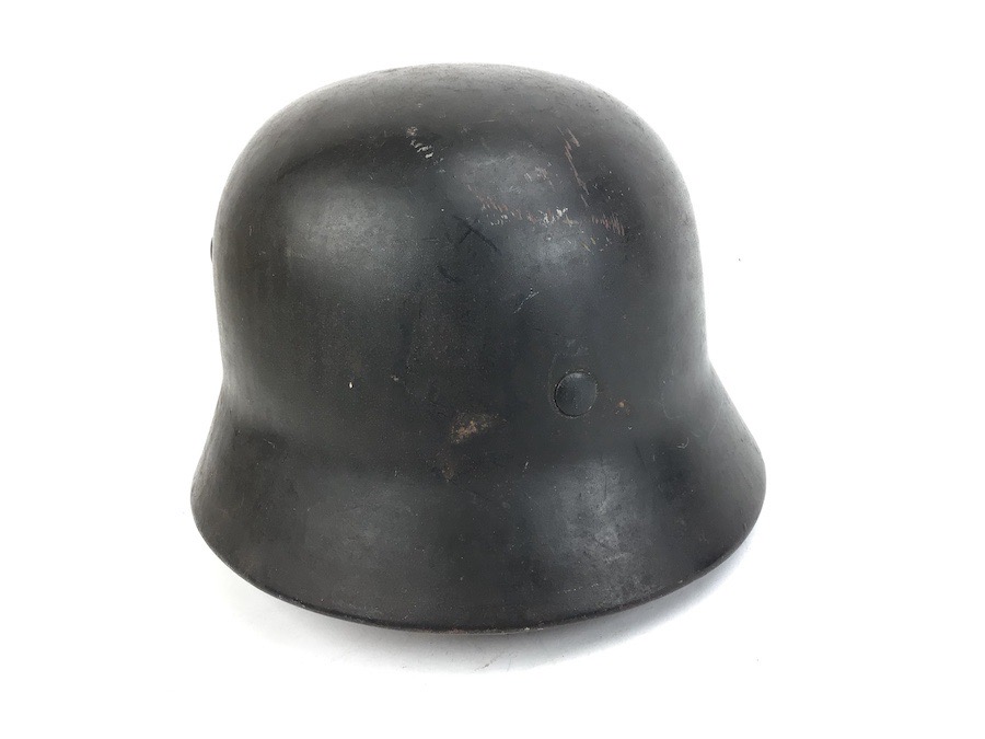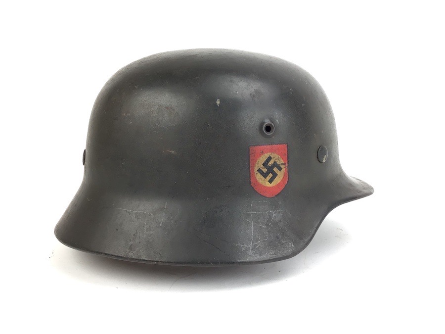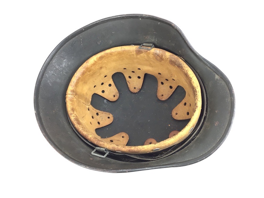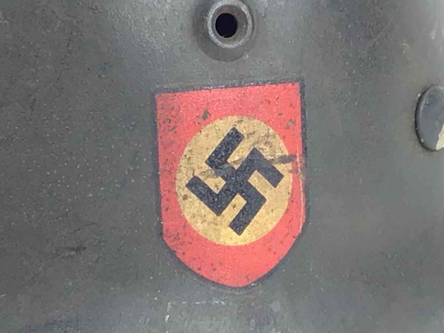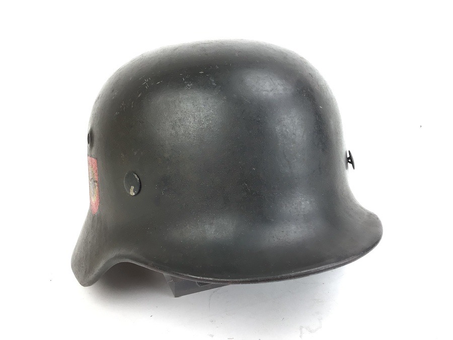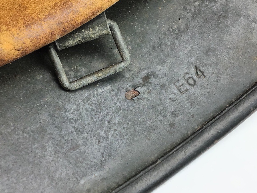 6/5/24 – This is an original German Police Double Decal helmet from WW2. The helmet has light surface wear and patina throughout the exterior but no major dents or issues. Both decals are visible and about 80-90% condition each. The interior leather liner is still present and ink stamped with a “56”, but is missing the cord and chin strap. Helmet interior rim is stamped with “SE64” and “8J84”.