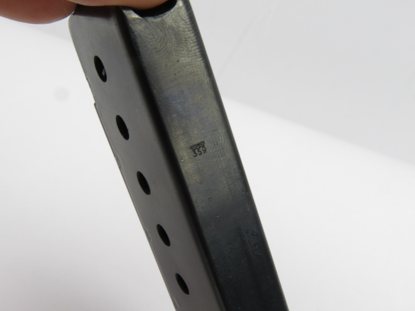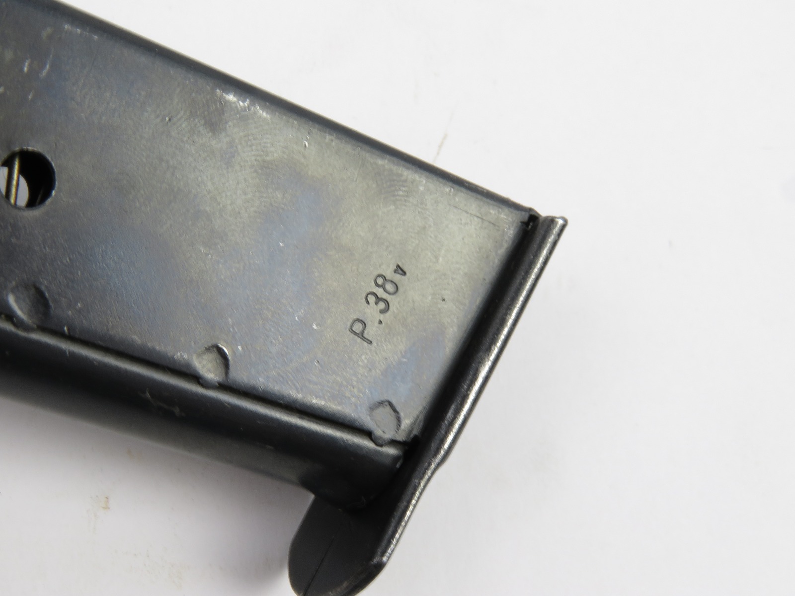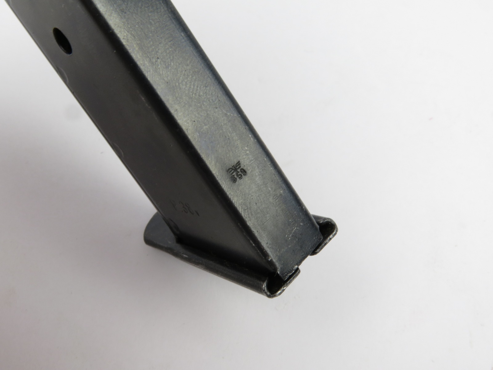 12/26/17 – This is an original Walther P.38 magazine from early WW2. The magazine is stamped on the spine with two eagle/359 military proofs which is an early production feature. The odd thing about this magazine is the frame is also stamped “P.38v”, which is a later wartime production feature. My guess is that this was either double stamped by mistake, or it was made during a transitional time in the factory. The spring is strong and fully functional. Guaranteed original.