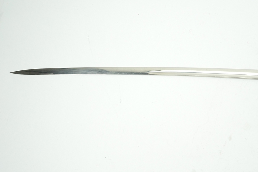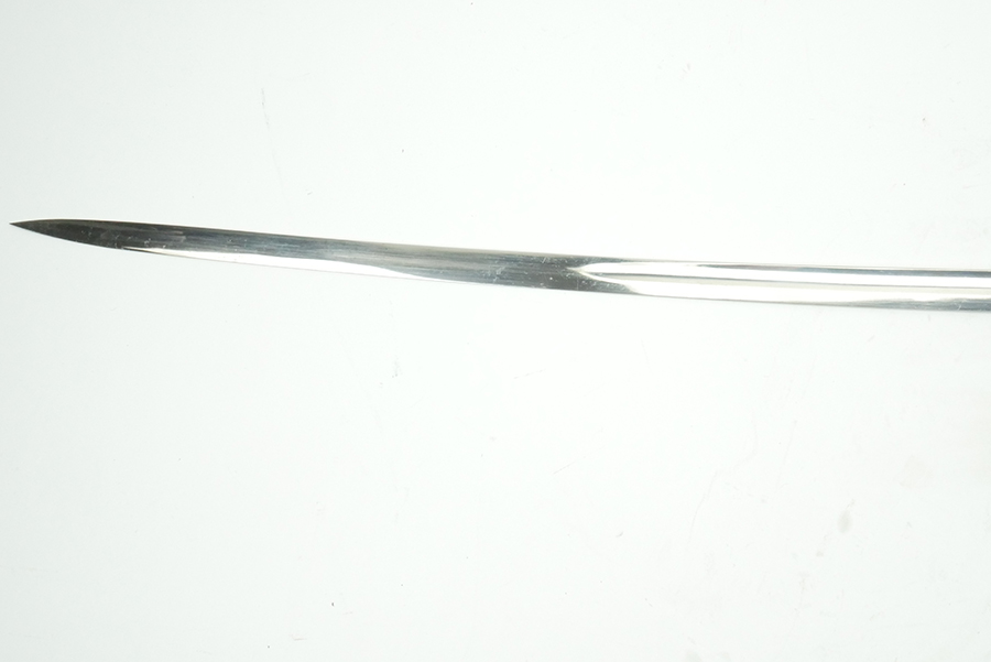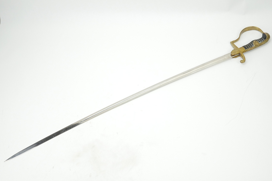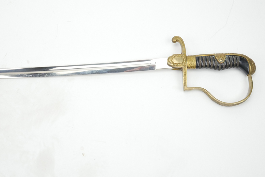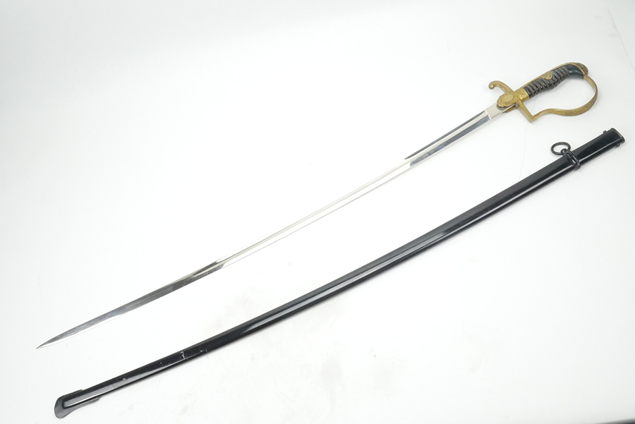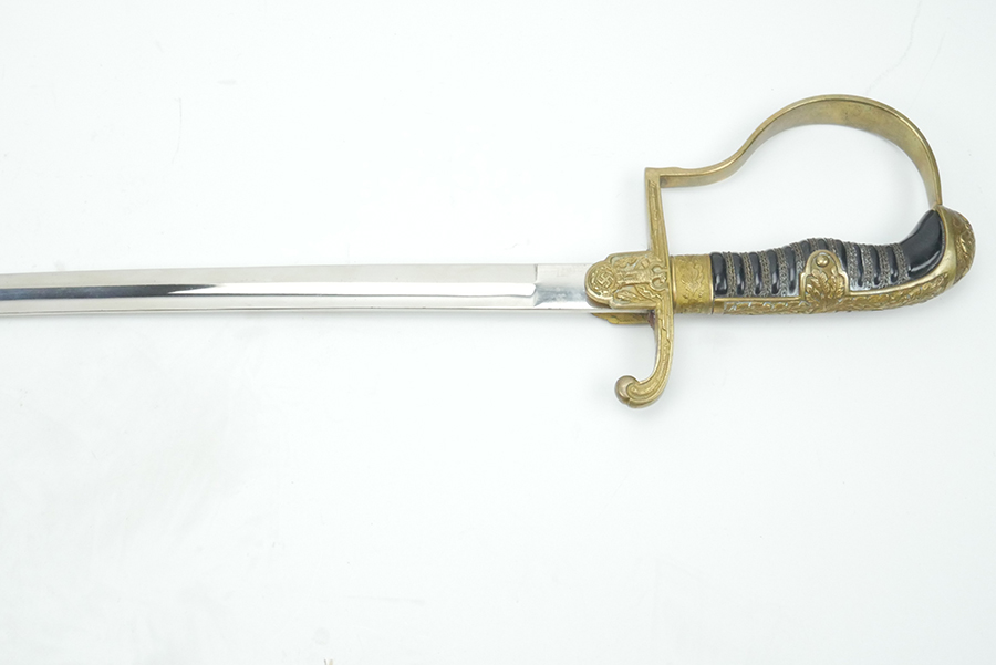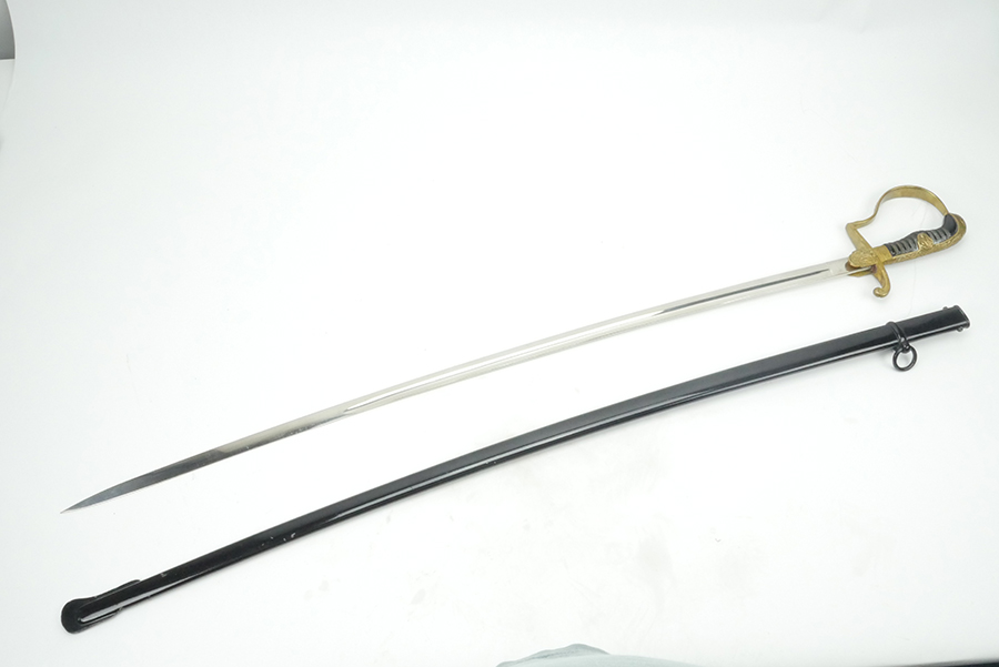 5/31/24 – This is an excellent example of a Dove Head Nazi Officers Sword from WW2. The handle is gold-washed, has a filigree engraving, and shows the Nazi Eagle with swastika. Comes with a black painted scabbard. It is in excellent condition overall with an excellent blade. Some small chips in the black paint on the scabbard.