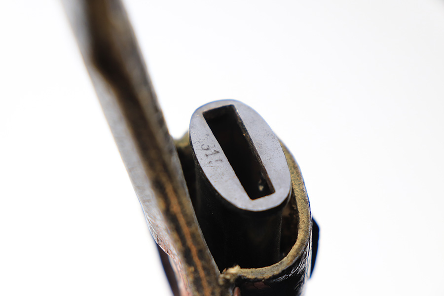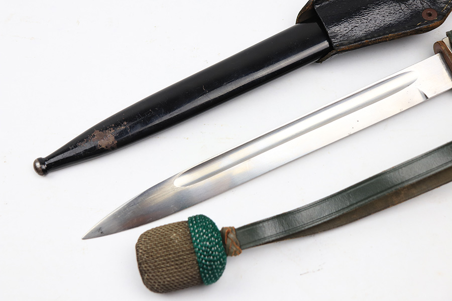 1/11/22 – This is an original WW2 era dress / parade bayonet. The bayonet comes with an original scabbard, leather frog, portepee, and stag handle grips. The blade is excellent condition with some normal scabbard wear but no notable discoloration or issues. The handle is excellent as well, and the green felt is still visible and in tact within the groove. The leather frog has surface cracking throughout but is in good overall condition. The scabbard has minimal finish loss and no dents. The portepee is tight and excellent.