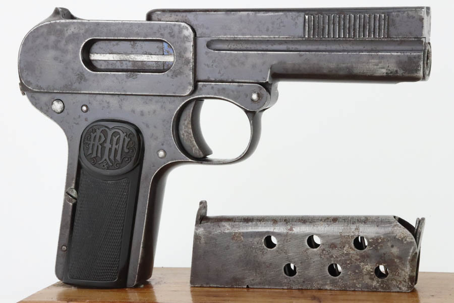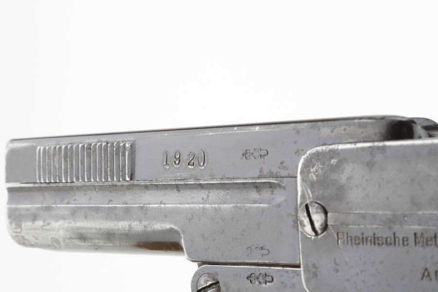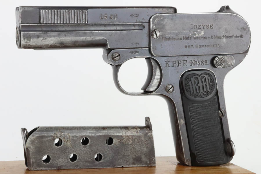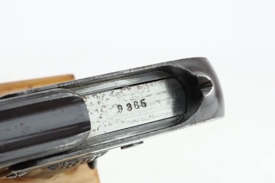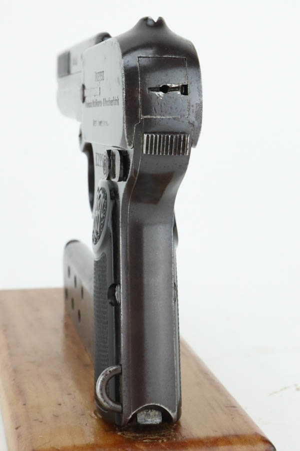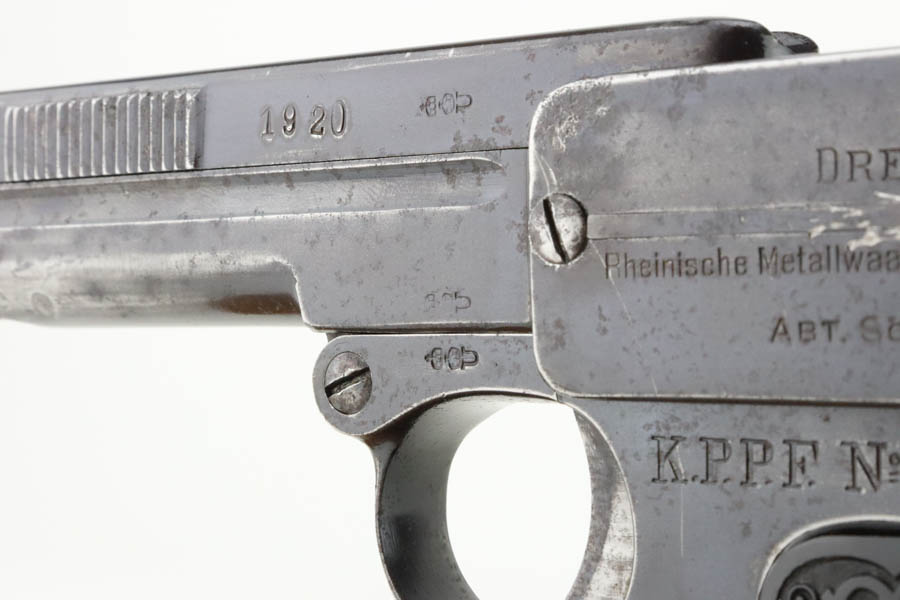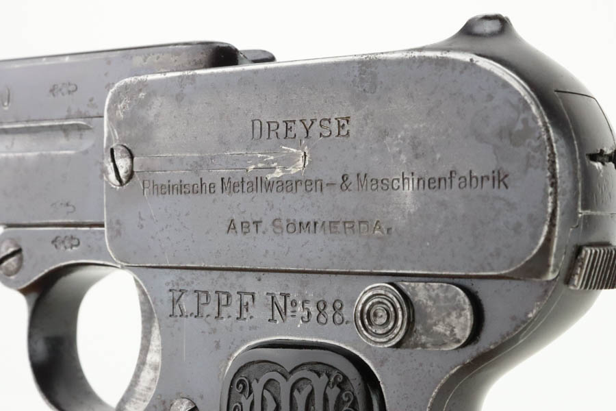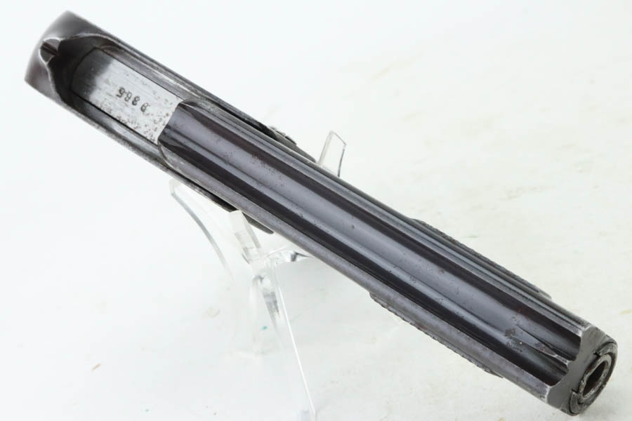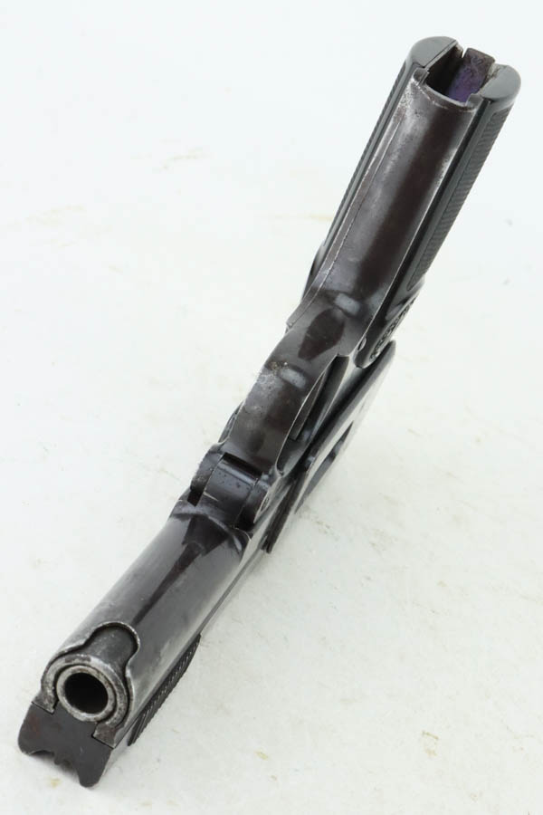 5/31/24 – This is a nice example of a Dreyse Model 1907 rig that was originally manufacture in the early 1900’s. It was then issued to the Nazi police force during WW2. The gun is all matching and has a “K.P.P.F. No.588” unit marking on the left side of the frame. We believe this stands for the Kriminal Police Division. “1920” government property marking on the slide. The gun has retained about 90% of its original finish. While there is not much actual finish loss, there is spotty oxidation and minor pitting throughout. Fitted with period-correct bakelite grips and comes with one proper magazine. Very nice bore.