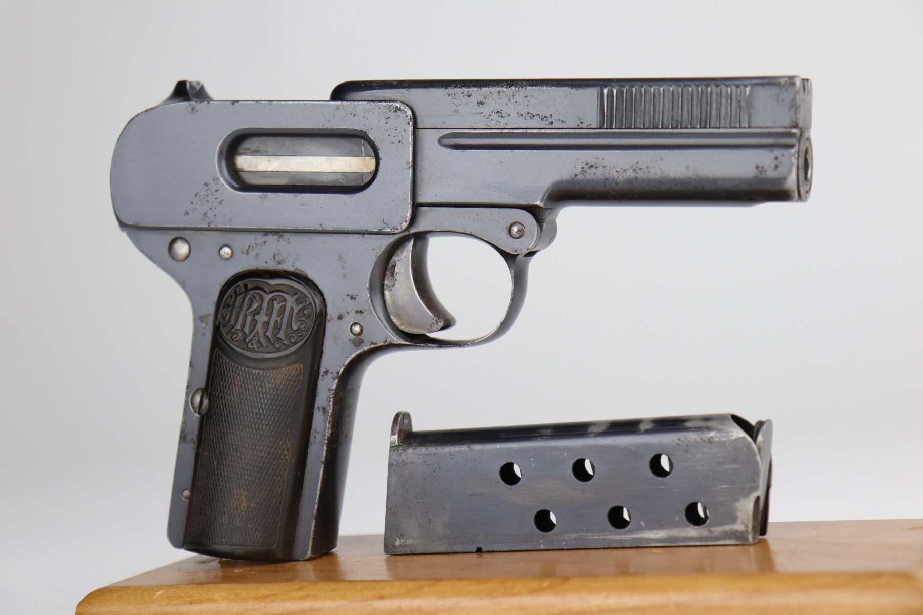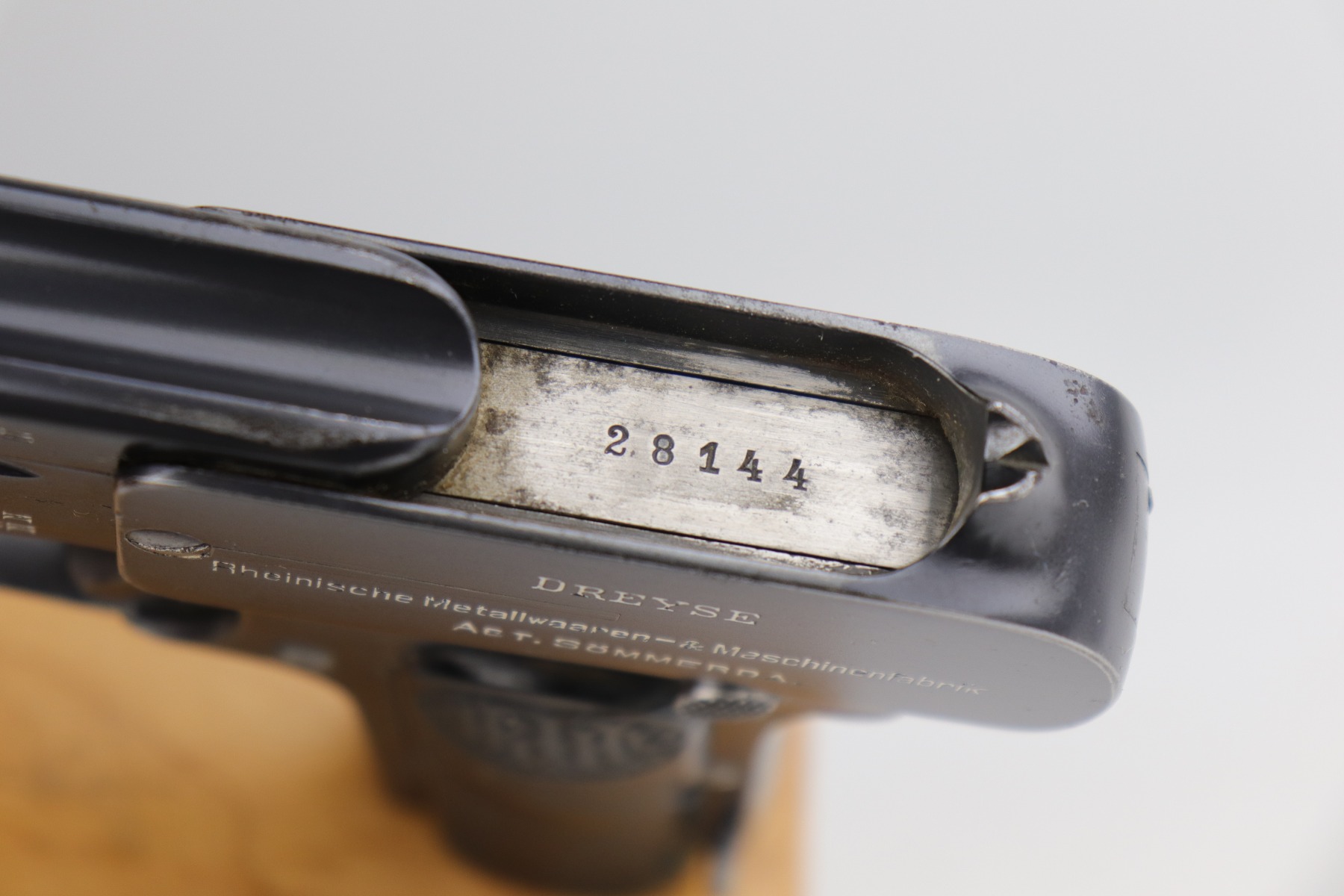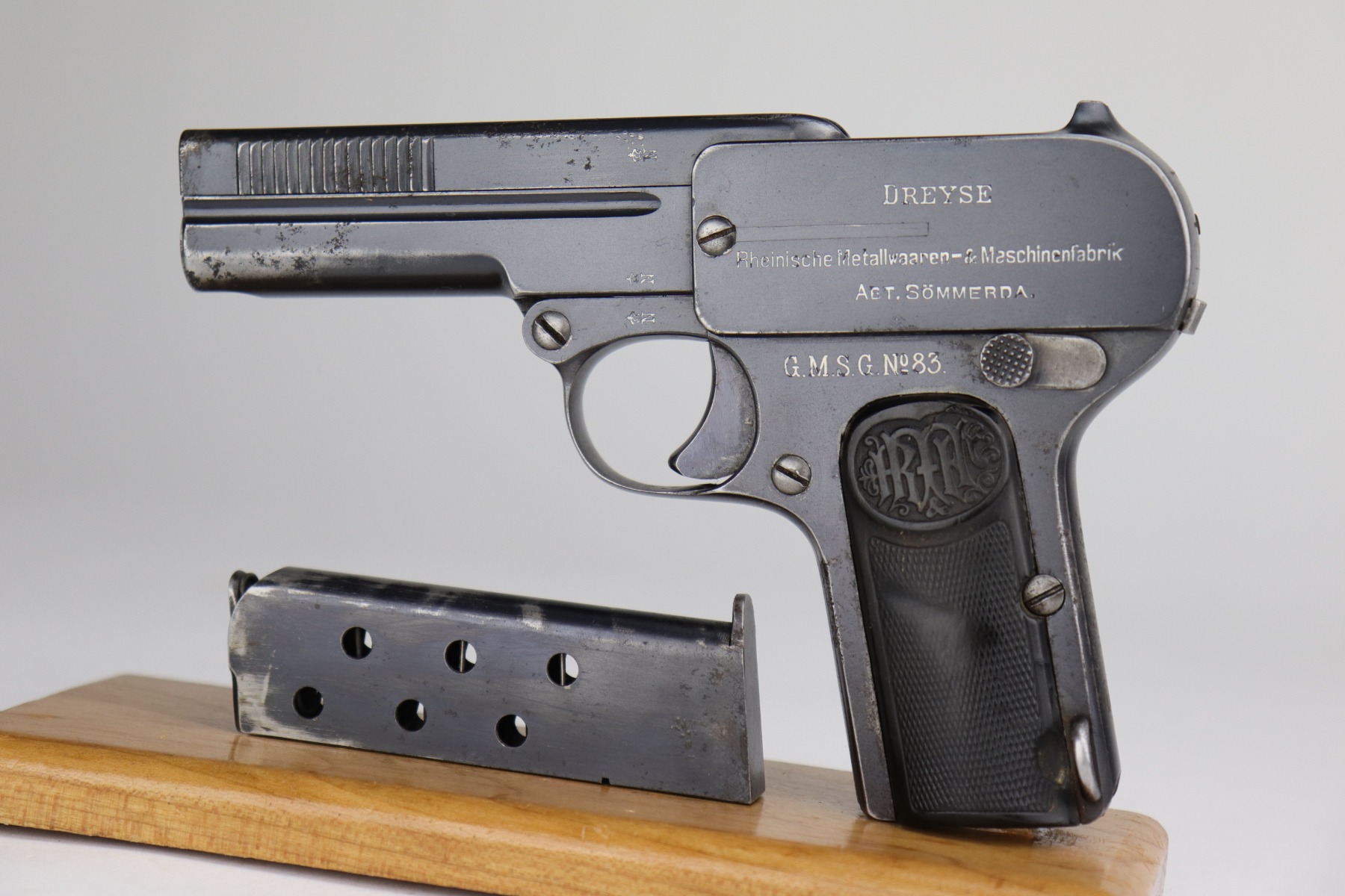 9/30/20 – This is an original Dreyse Model 1907. The Dreyse Model 1907 is a semi-automatic pistol designed by Louis Schmeisser. The gun was named after Nikolaus von Dreyse, the designer of the Dreyse Needle Gun. The pistol had an interesting feature for the time: when the gun was ready to fire, the firing pin projected through the back of the breech block, serving as an early handgun-cocking indicator. It was produced from 1907 to 1915. The caliber is 7.65 and was later made in 9mm. This particular gun has retained about 95% of its original bluing. While there is little actual finish loss, there is pitting on the gun throughout. The areas most noticeable are on the straps. There are areas of finish loss on the underside of the frame near the muzzle, on the front strap, and on the back strap. The bore has weak rifling and pitting throughout. The grips are nice, but there is wear on the left panel. Comes with one period-correct magazine.