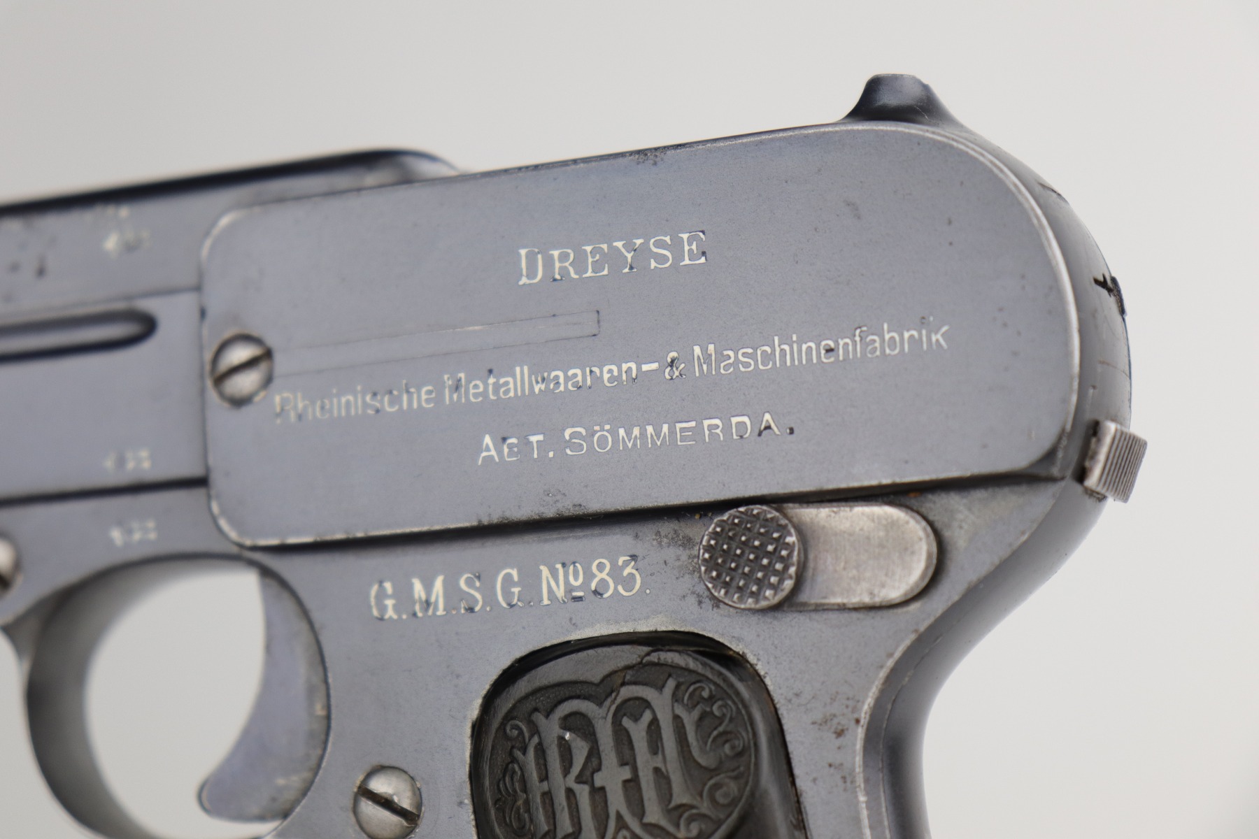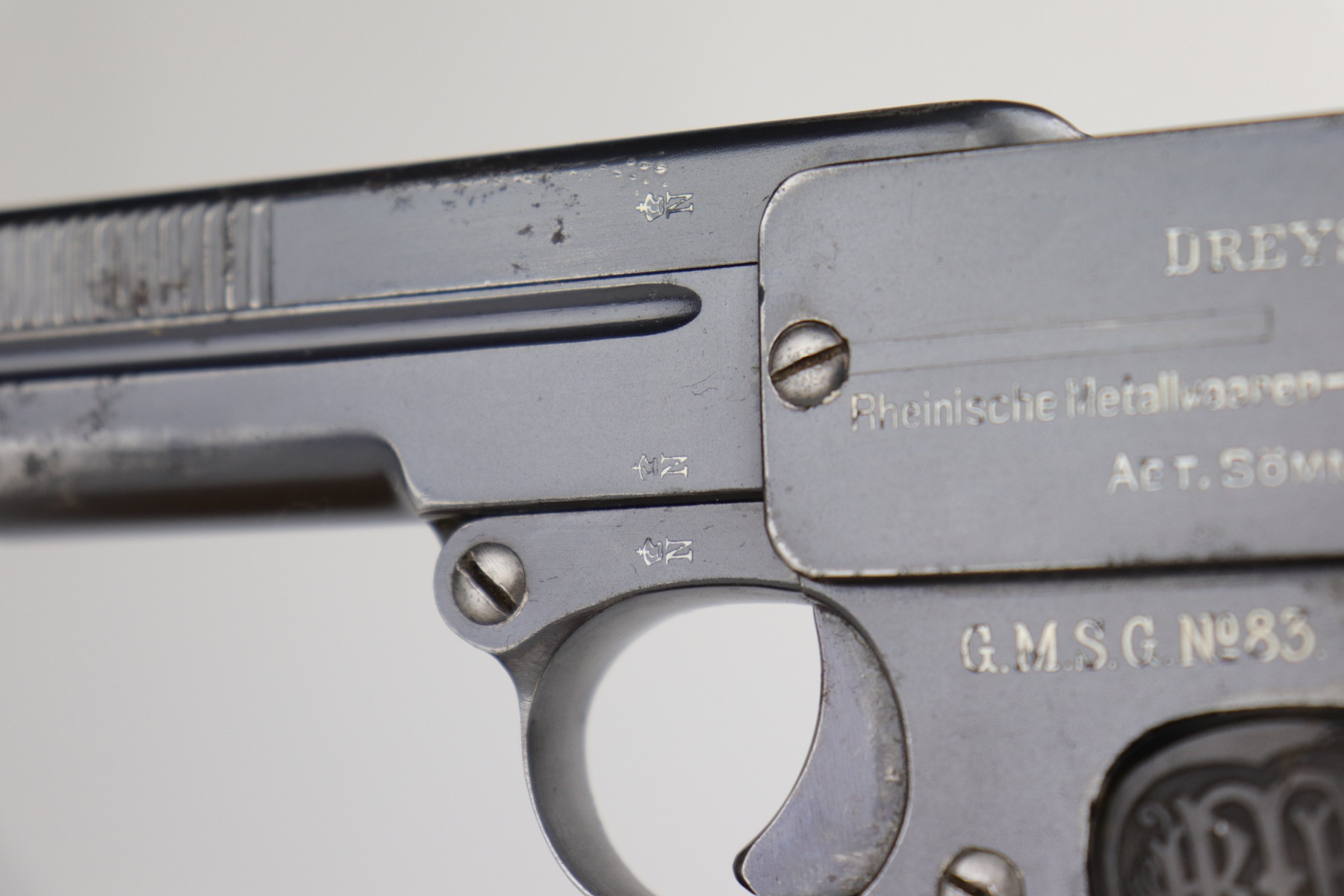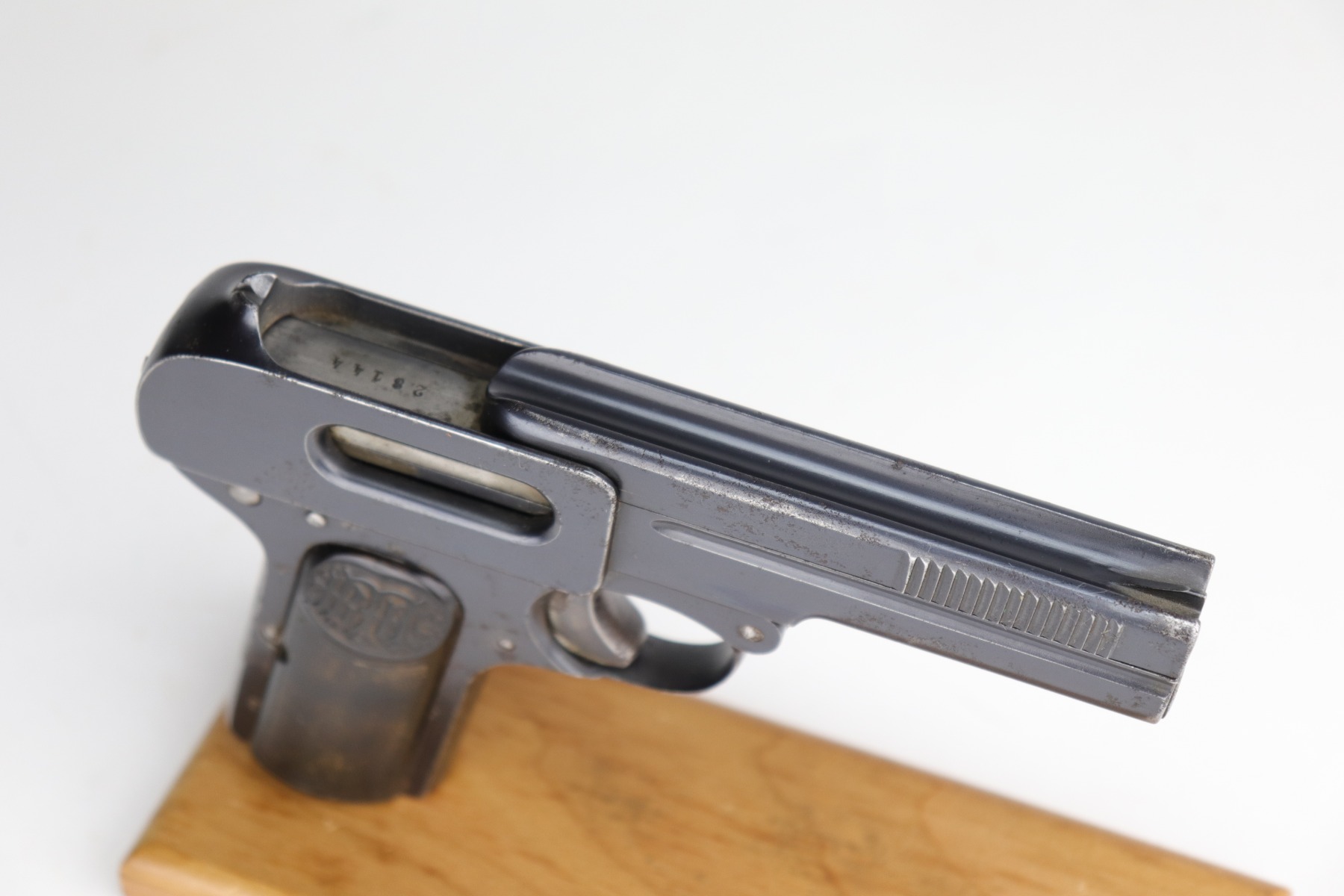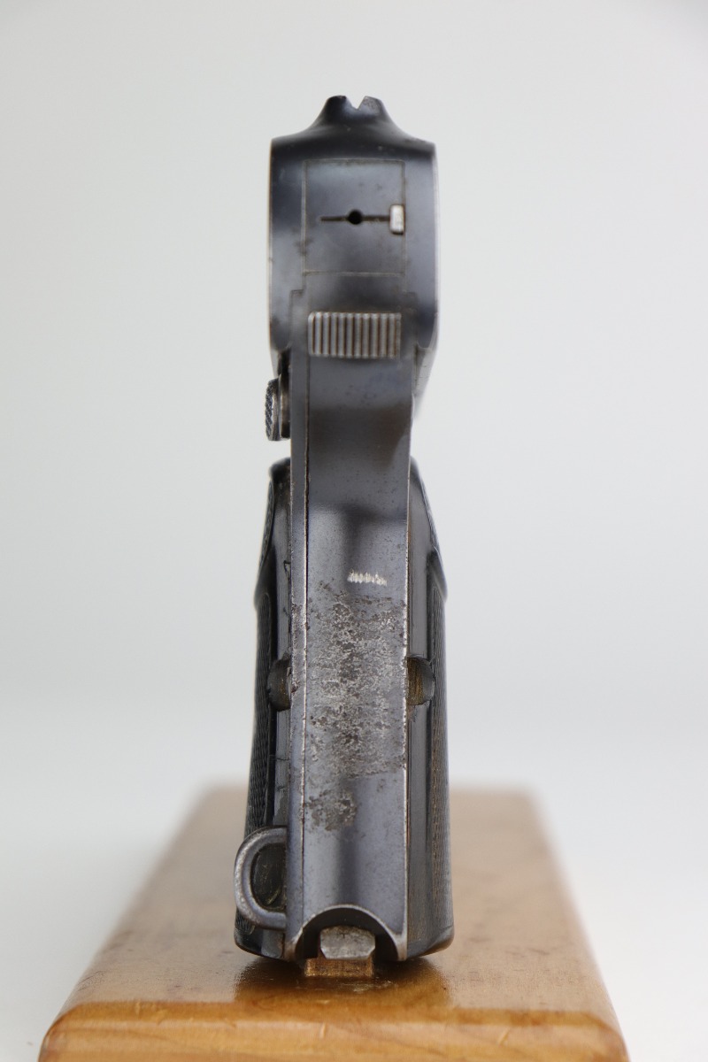9/30/20 – This is an original Dreyse Model 1907. The Dreyse Model 1907 is a semi-automatic pistol designed by Louis Schmeisser. The gun was named after Nikolaus von Dreyse, the designer of the Dreyse Needle Gun. The pistol had an interesting feature for the time: when the gun was ready to fire, the firing pin projected through the back of the breech block, serving as an early handgun-cocking indicator. It was produced from 1907 to 1915. The caliber is 7.65 and was later made in 9mm. This particular gun has retained about 95% of its original bluing. While there is little actual finish loss, there is pitting on the gun throughout. The areas most noticeable are on the straps. There are areas of finish loss on the underside of the frame near the muzzle, on the front strap, and on the back strap. The bore has weak rifling and pitting throughout. The grips are nice, but there is wear on the left panel. Comes with one period-correct magazine.