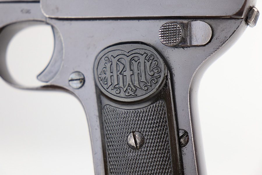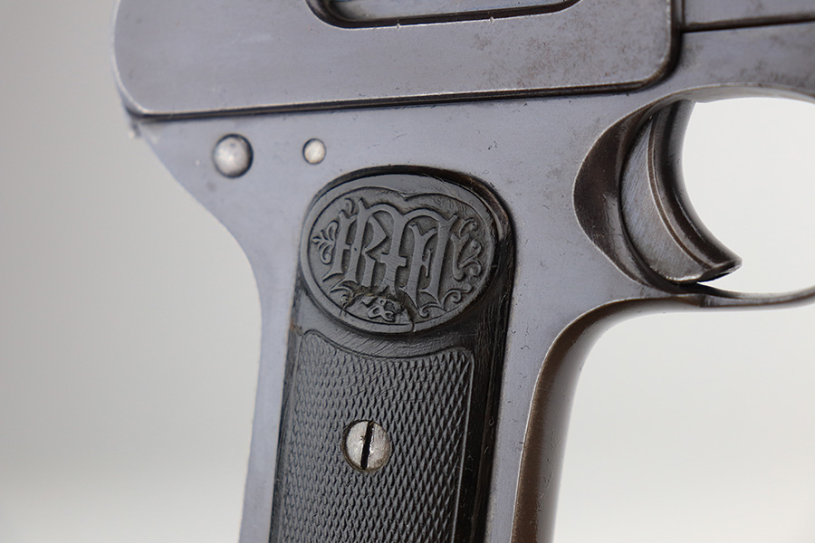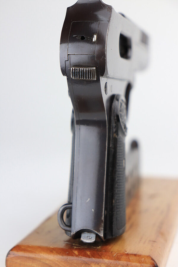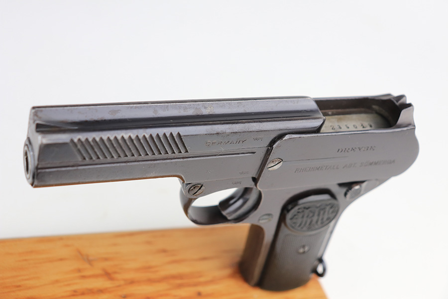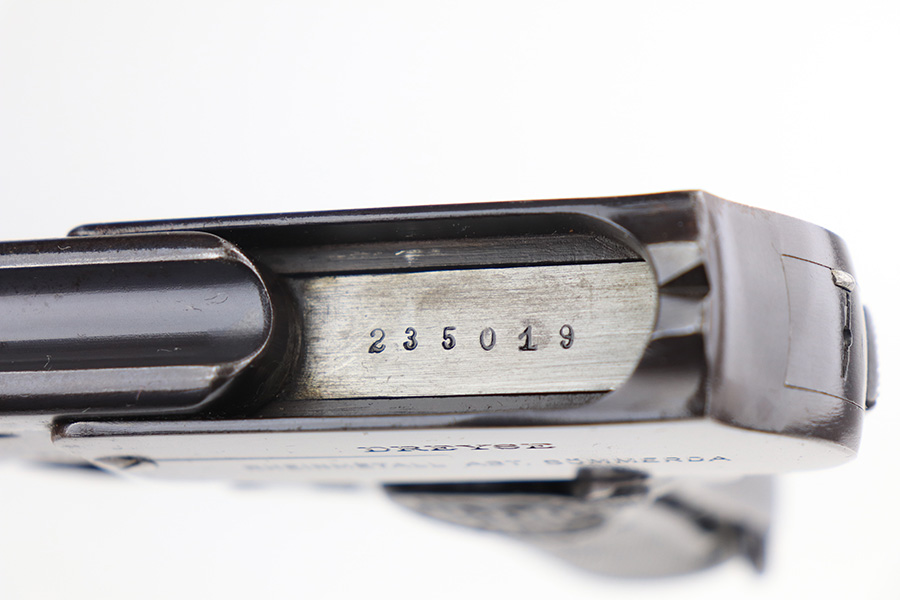 12/30/21 – This is an excellent example of a Dreyse Model 1907 sold in the commercial market in the early 1900’s. It is all matching and has the proper “Crown N” commercial proofs. There is a “Germany” export marking on the left side of the slide, indicating it was intended for sale in the international commercial market. It has retained about 97% of its original finish. Most of the finish loss is spotty discoloration on the right side of the slide and underside of the frame. A few small pits around the muzzle. While there isn’t much actual finish loss, there are tiny dots of oxidation and freckling throughout. Very light brown patina on the grip straps. Comes with excellent period-correct grips and one proper magazine. The bore has good rifling with minor pin-pricking here and there.