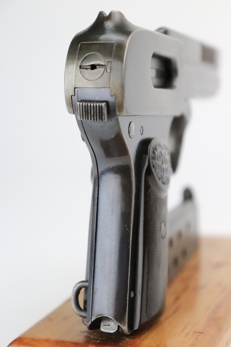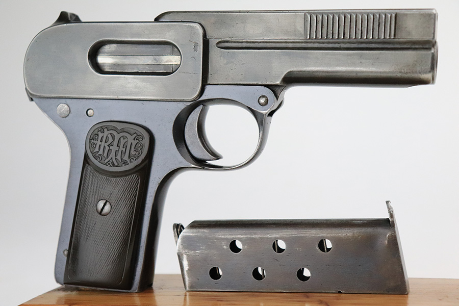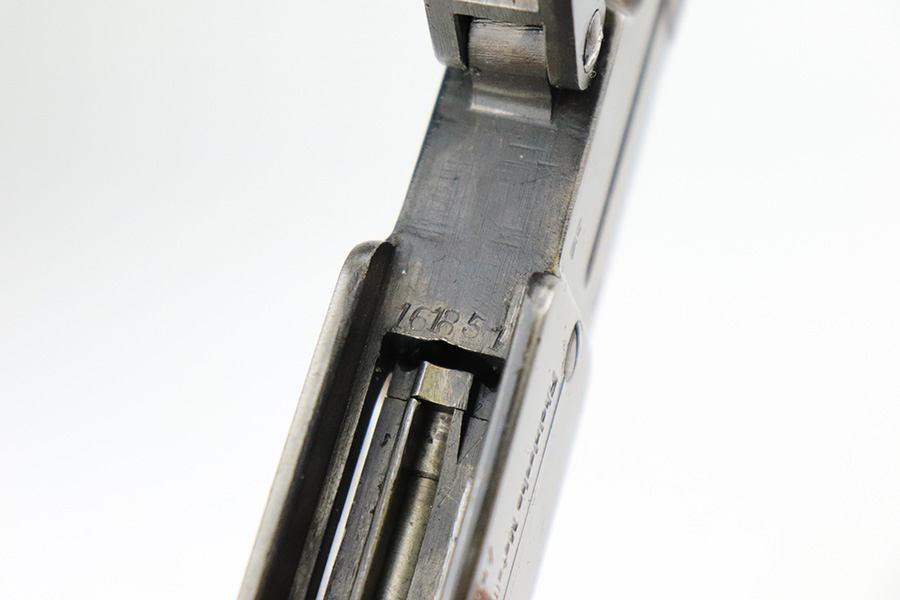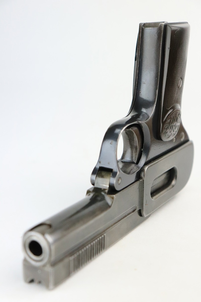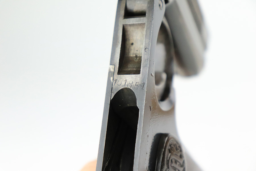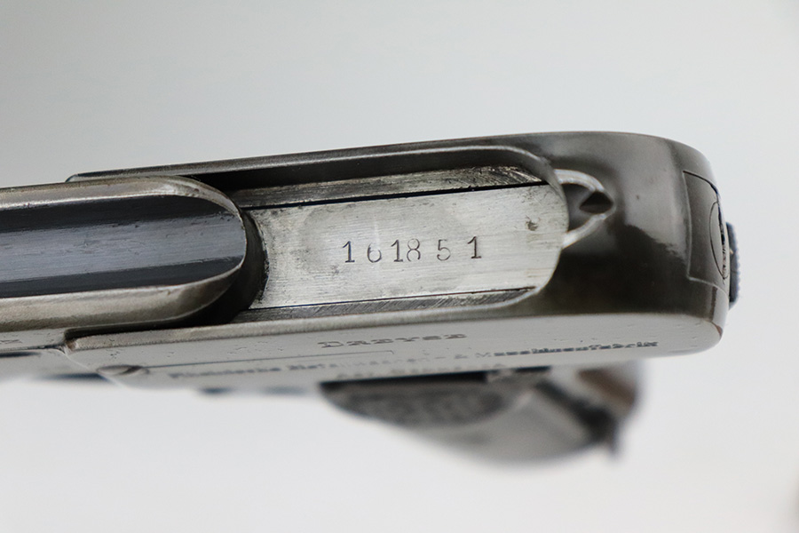 8/2/22 – This is a nice example of a Dreyse Model 1907 issued to the Imperial German Army during WW1. The gun is all matching and has the proper “Crown N” proofs. It also has an Imperial German military acceptance proof on the right side. It has retained roughly 50% of its finish. The majority of the finish loss is on the whole upper of the gun. Even though the pistol is all matching, this section has a very different wear pattern from the frame. Some areas of light pin-pricking here and there and some minor brown patina on the grip straps. Comes with period-correct bakelite grips (obvious chip on the left side) and one proper magazine. Nice bore with good rifling.
