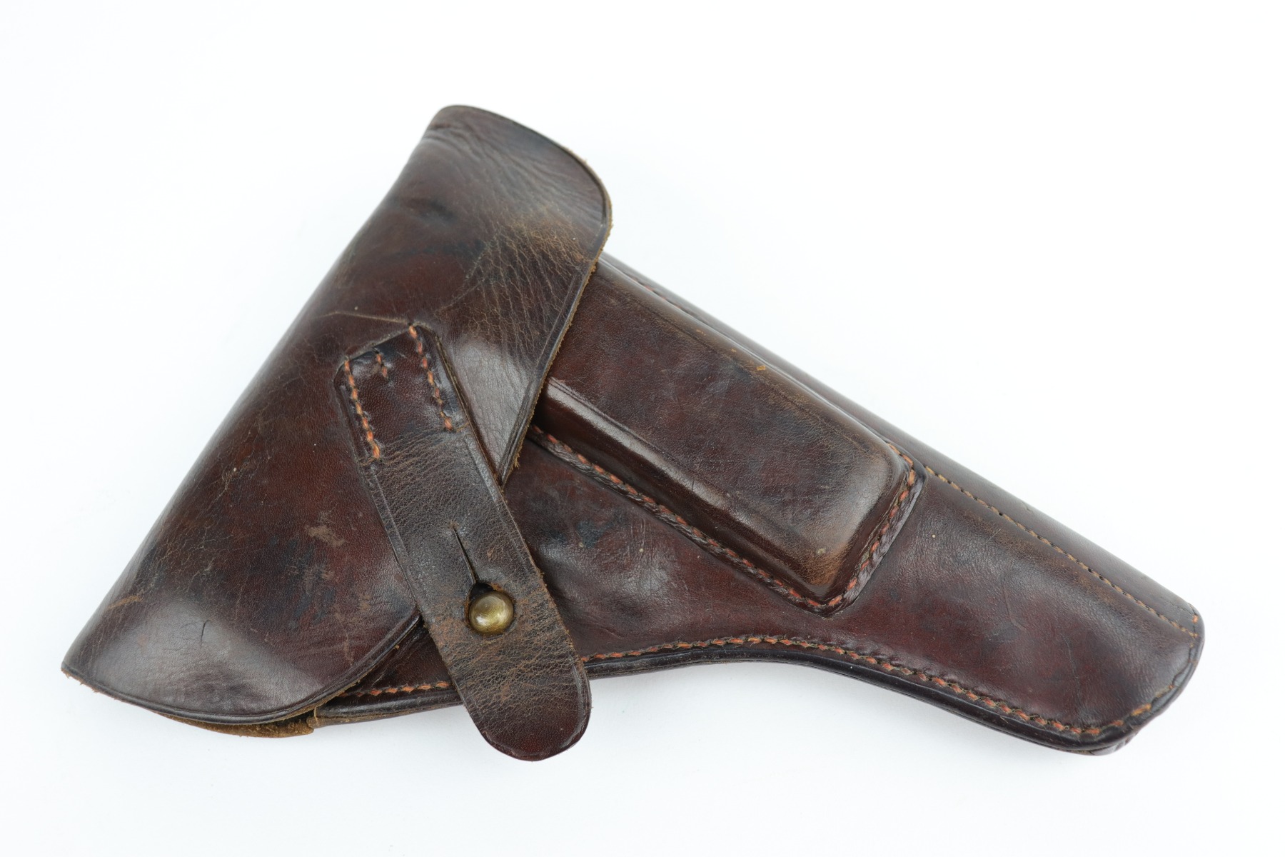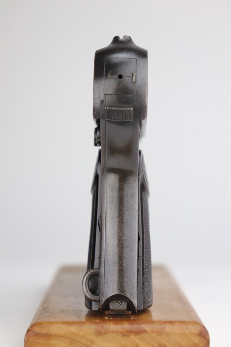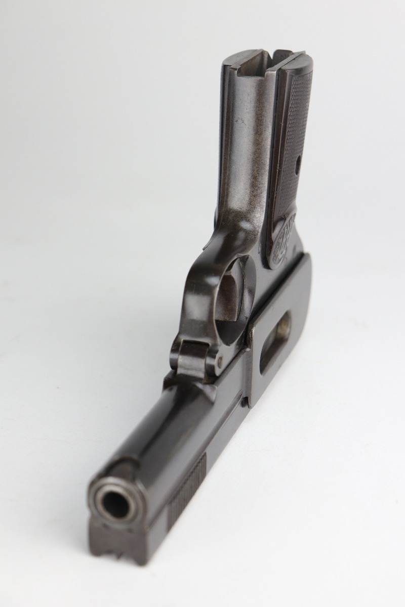 9/11/20 – This is an original Dreyse M1907 Rig. The rig comes with a nice brown leather holster and one period-correct magazine. We estimate that the gun has retained around 85% of its original bluing. There isn’t so much bluing loss, more so that most of the finish has a dulled look to it. And there are some signs of minor patina showing through under the finish. There are areas of minor thinning here and there throughout, most noticeable on the straps. There are small areas of pitting here and there, most noticeable toward the muzzle end of the left side of the slide and toward the rear of the right side of the gun. There isn’t much rifling left in the bore and there is pitting throughout. The grips are original and excellent, except for one small crack in the right panel and one chip in the left panel around the screw hole. The gun is fully functional. The holster shows age but is in nice condition.