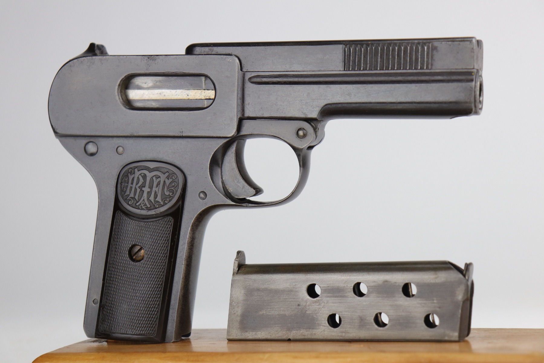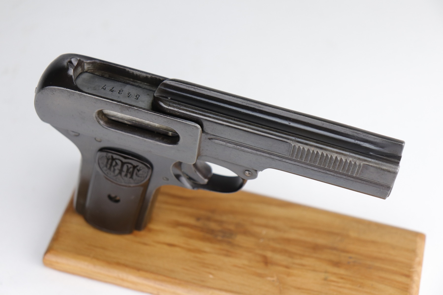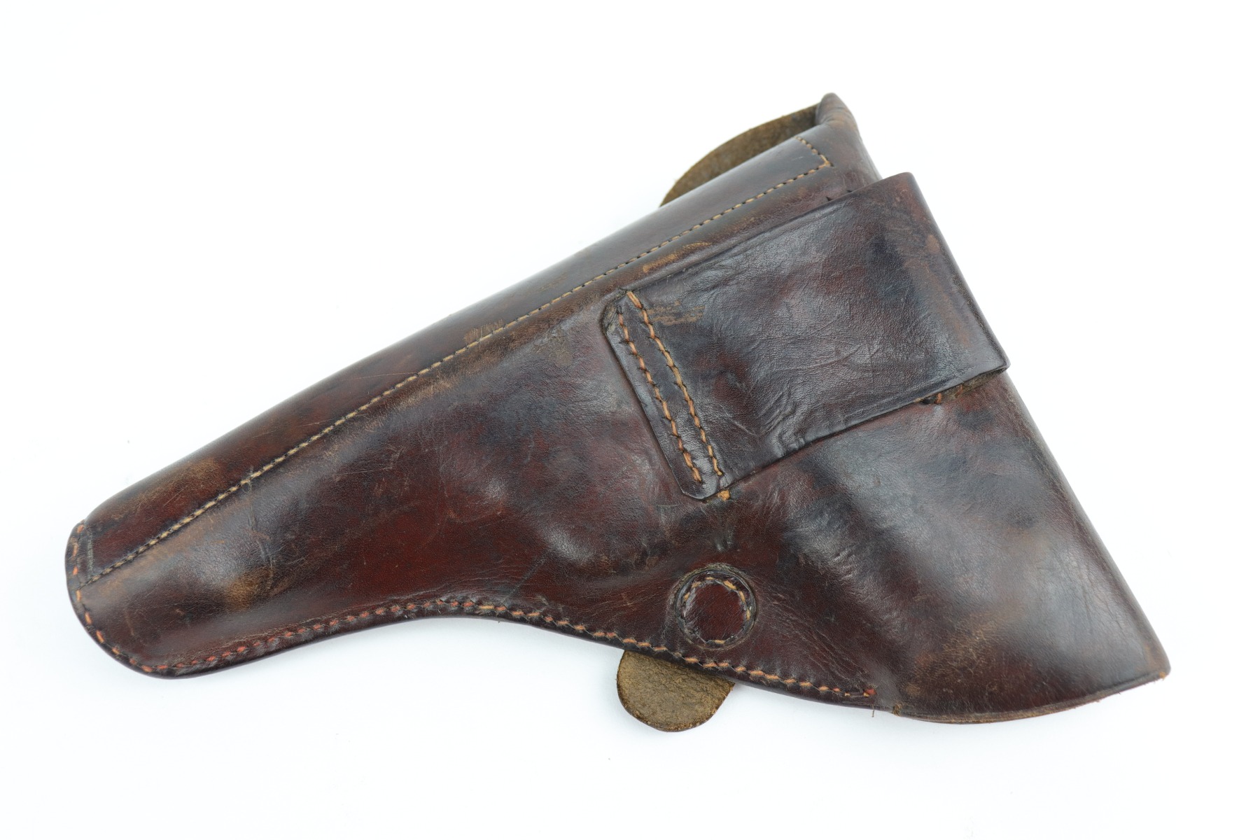 9/11/20 – This is an original Dreyse M1907 Rig. The rig comes with a nice brown leather holster and one period-correct magazine. We estimate that the gun has retained around 85% of its original bluing. There isn’t so much bluing loss, more so that most of the finish has a dulled look to it. And there are some signs of minor patina showing through under the finish. There are areas of minor thinning here and there throughout, most noticeable on the straps. There are small areas of pitting here and there, most noticeable toward the muzzle end of the left side of the slide and toward the rear of the right side of the gun. There isn’t much rifling left in the bore and there is pitting throughout. The grips are original and excellent, except for one small crack in the right panel and one chip in the left panel around the screw hole. The gun is fully functional. The holster shows age but is in nice condition.