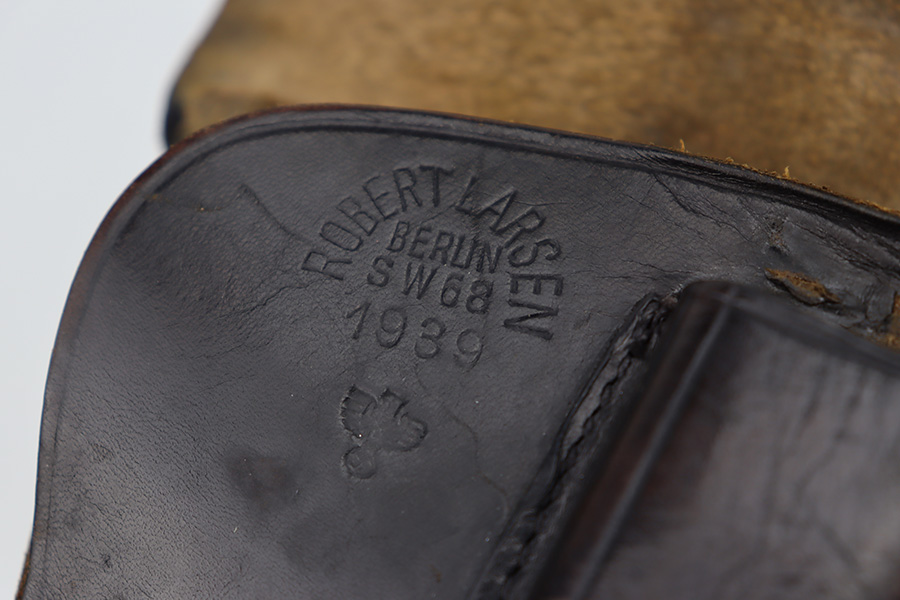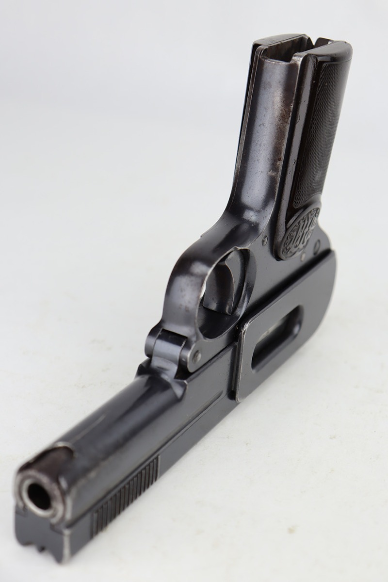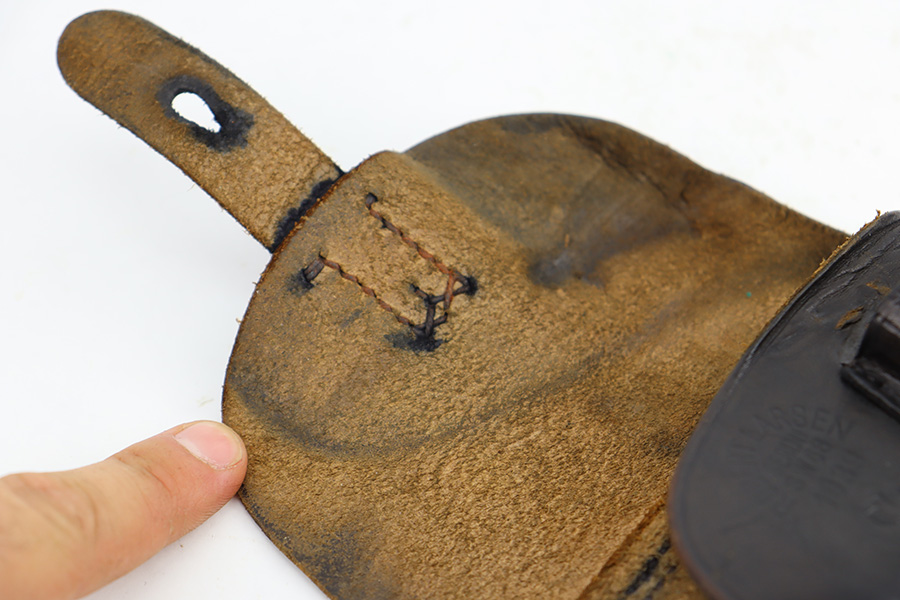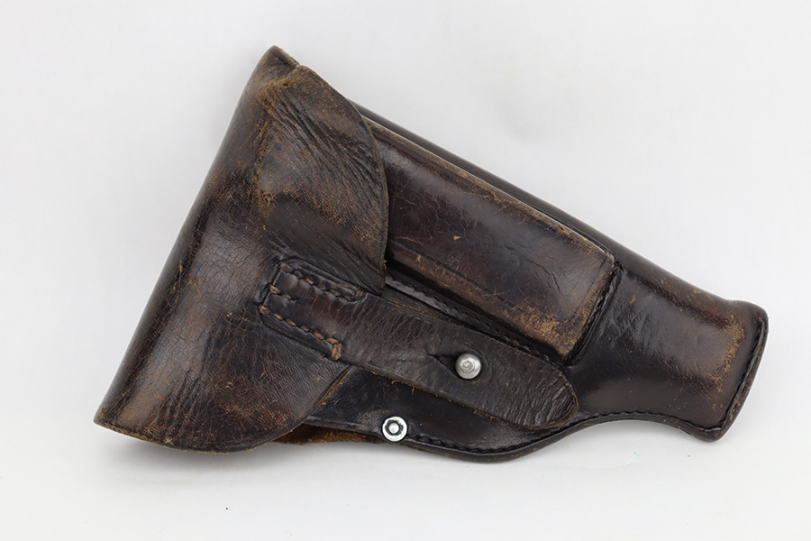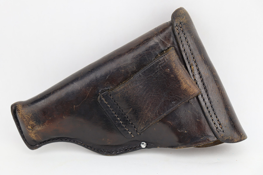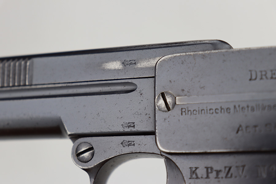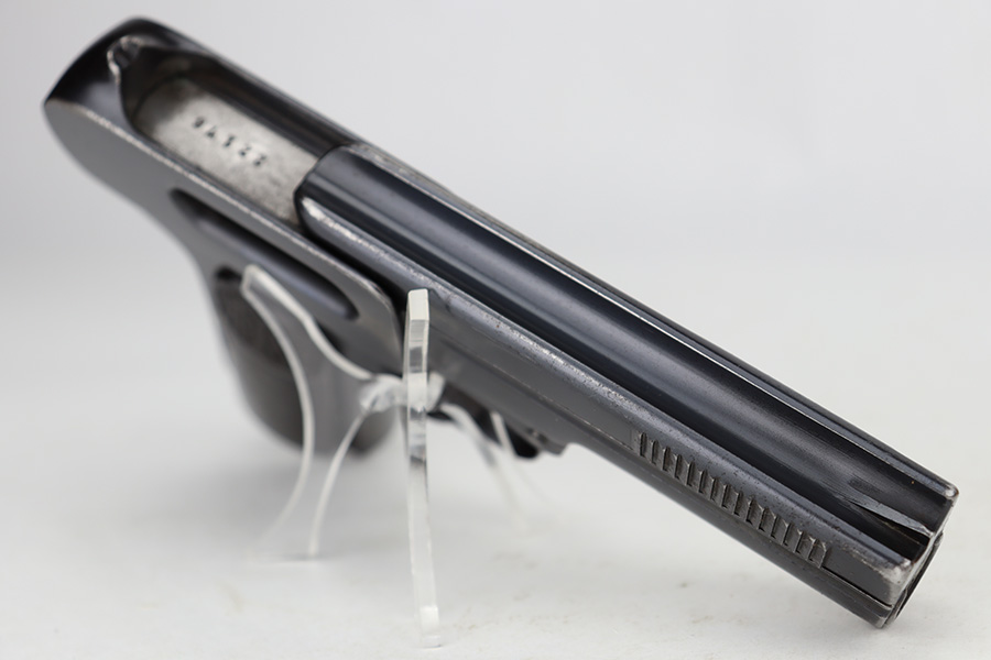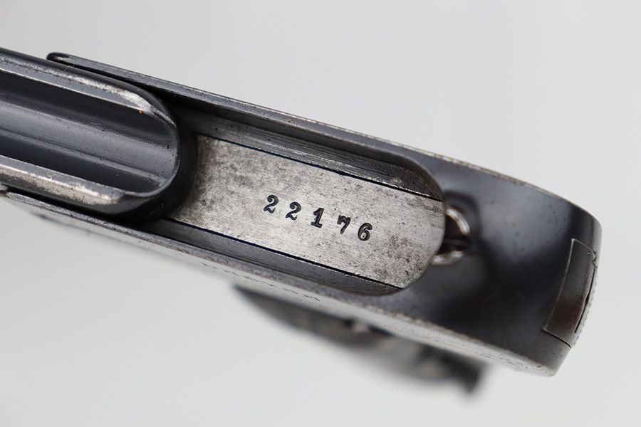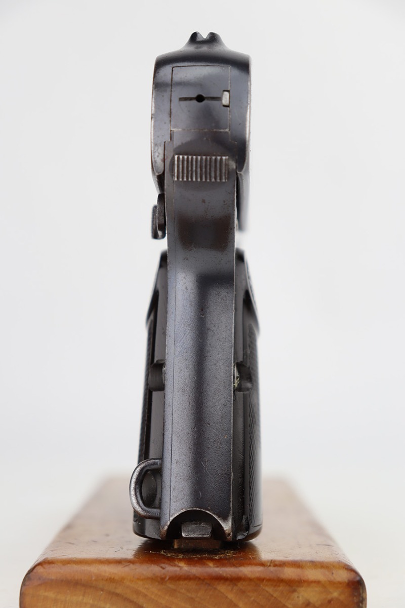 6/12/23 – This is an original and interesting Dreyse M1907 that is marked K.Pr.Z.V. No 177. on the left side of the frame, indicating it was issued to the Royal Prussian Customs Office, which was a precursor to the RFV. The pistol has all matching numbers and about 90+% of the original blue. The most notable areas of bluing loss are on the front strap, left side of slide and rounded portion of right side slide. There’s also some oxidation in most finished areas. Excellent bore. Grips show some smoothing but no cracks. The gun comes as a rig with a nice 1939-dated police holster, an un-marked magazine, and a magazine numbered “4747 II” on the base.