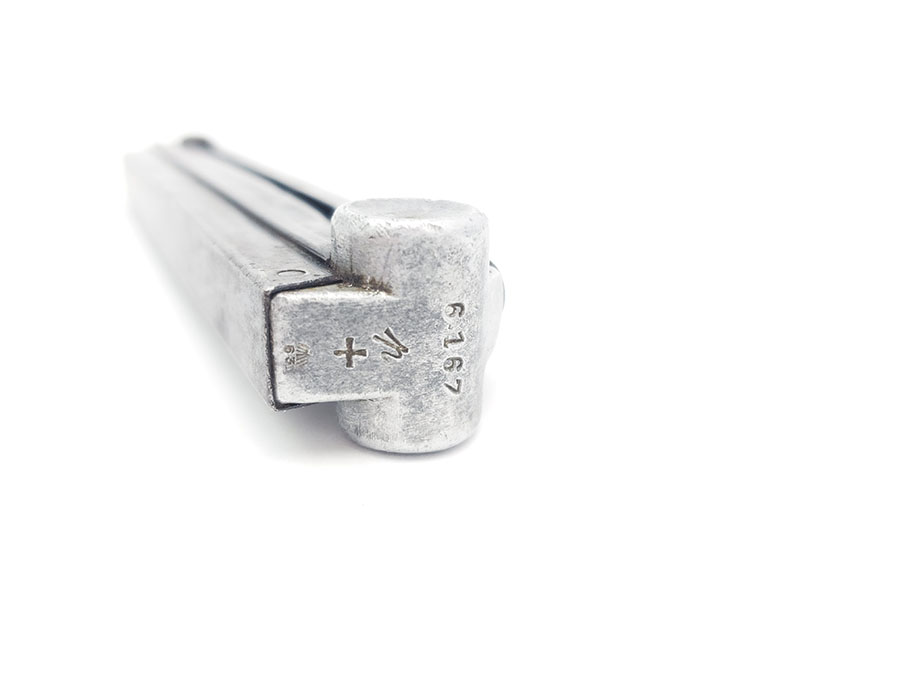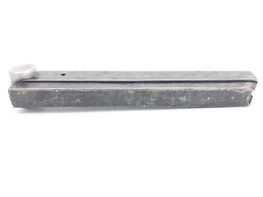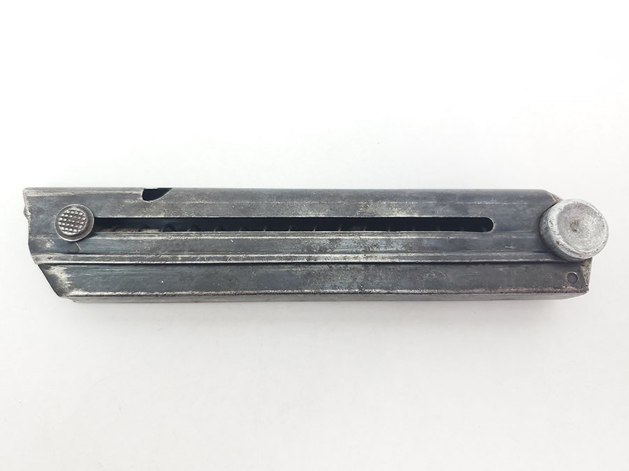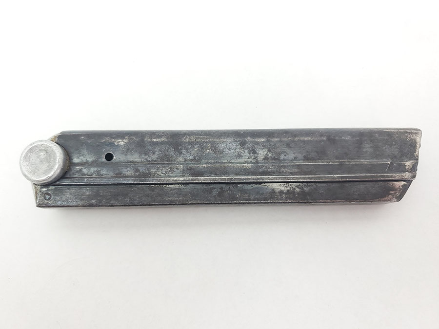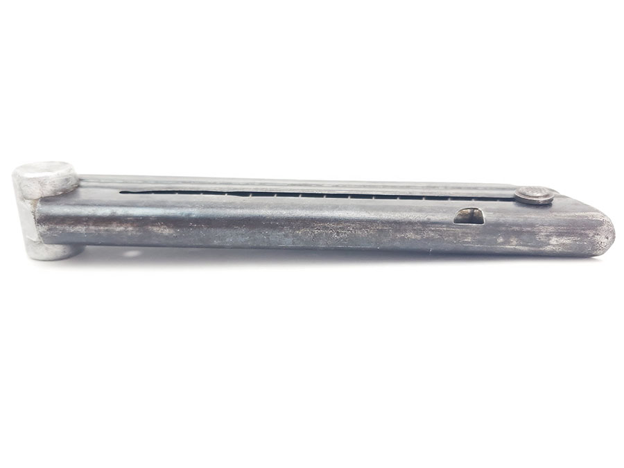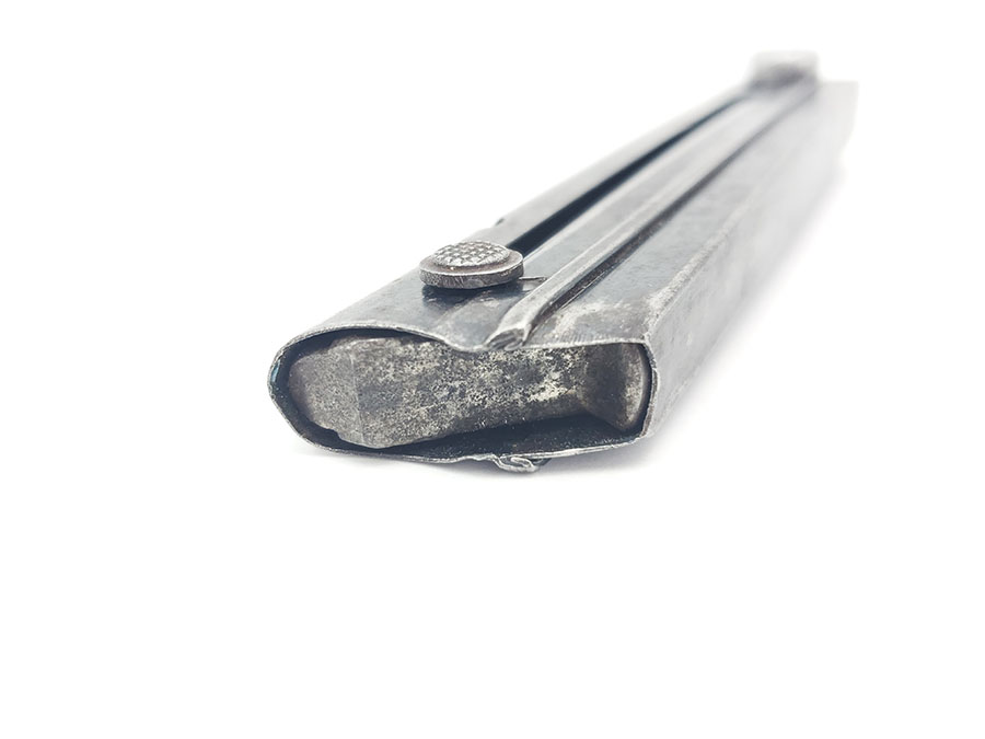 6/17/20 – This is an original Mauser Luger magazine made in 1937 during the transition between droop eagle/63 proofs and stick winged proofs. We can tell this by the blued finish on the tube, and droop eagle/63 proof on the base. The base is also serial numbered and stamped with a “+” sign. The tube has discoloration and wear throughout. Most of this is surface patina and dark browning from age. Still fully functional with a strong spring.