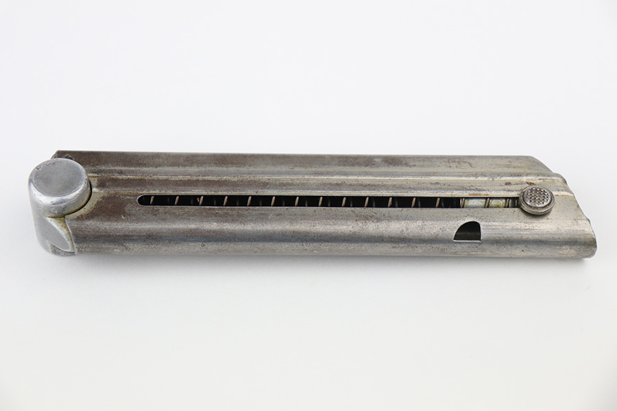 9/20/21 – This is an original, early WW2 production Mauser Luger magazine. The base of the magazine has a droop winged eagle 63 proof stamp and is serial numbered 596i. The tube has some brown patina throughout and surface wear, but no rust or pitting. The spring is strong and fully functional.