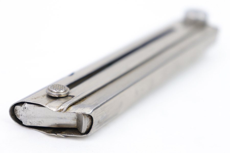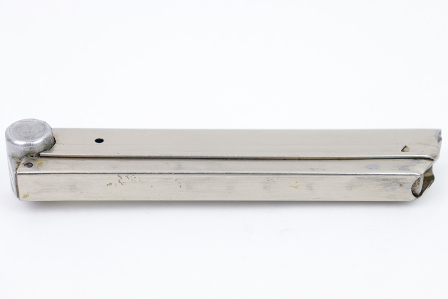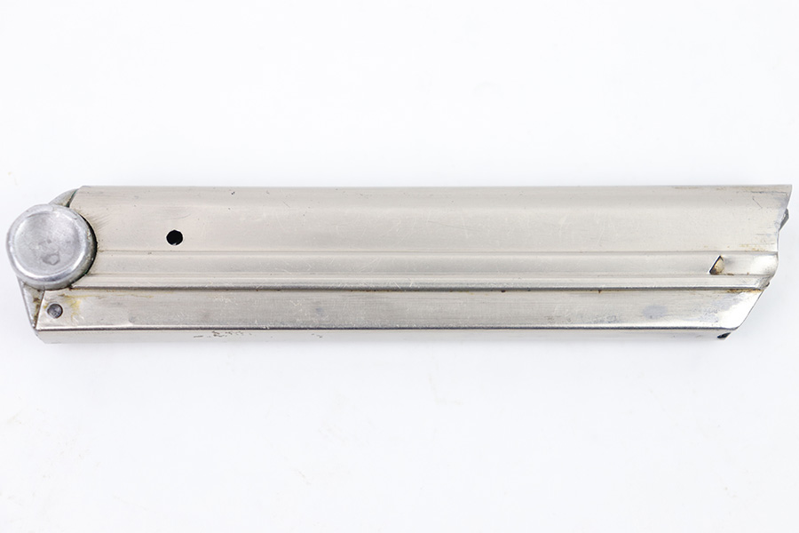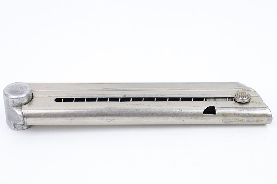 2/22/23 – This is an original, early WW2 production Mauser Luger magazine. The magazine has a nickel tube and aluminum base. The base is serial numbered with a “+” sign and droop winged eagle 63 proof stamp. This was the military proof stamp by Mauser up until 1937. The tube is excellent with minimal surface patina and no rust or pitting. The spring is strong and fully functional.
