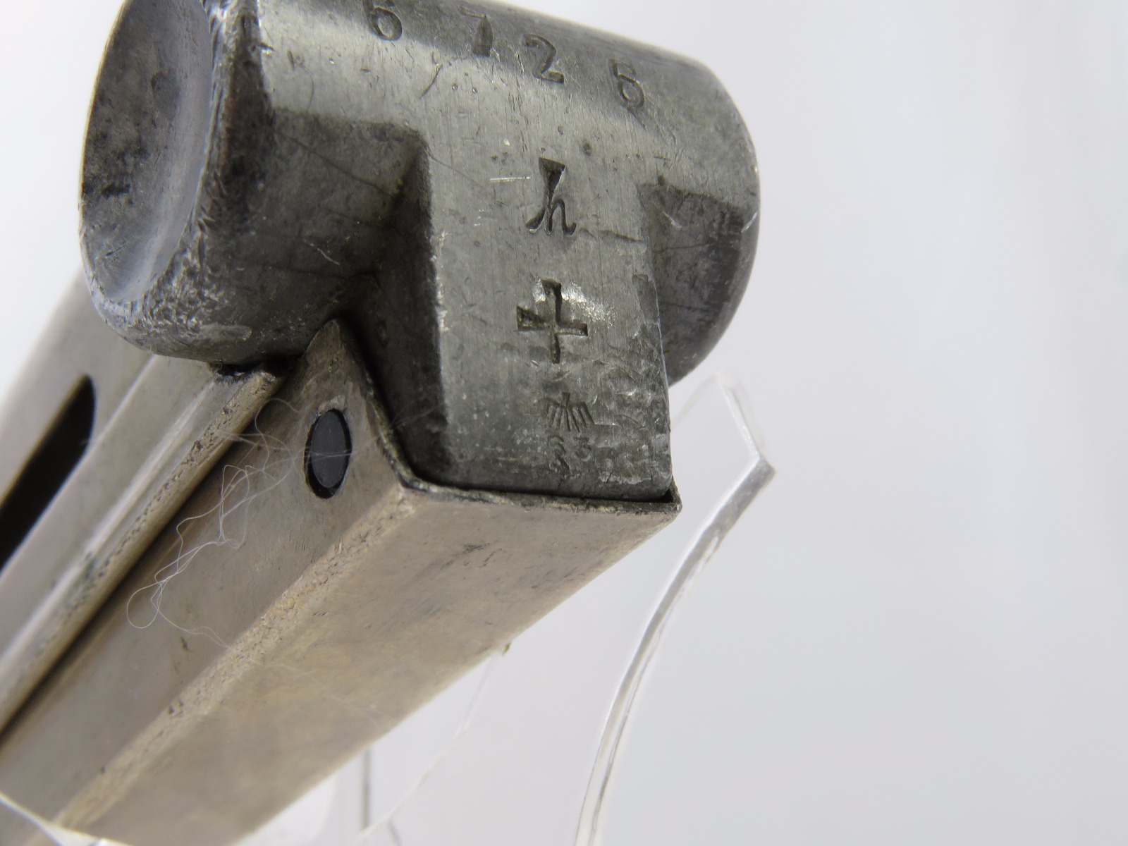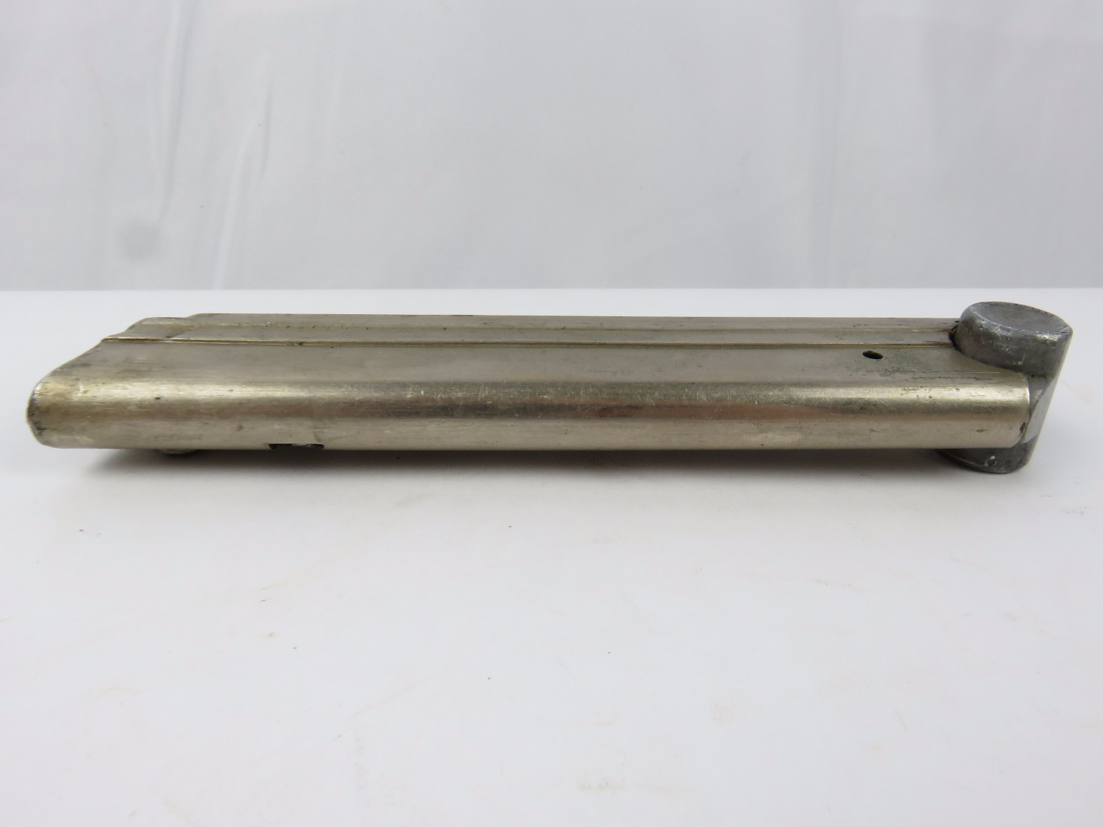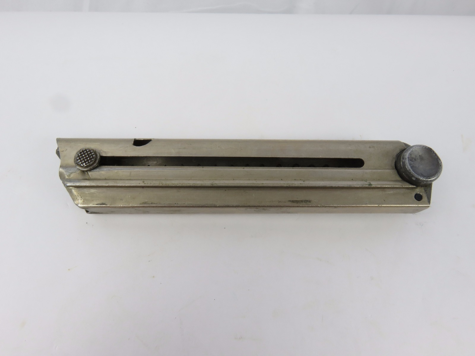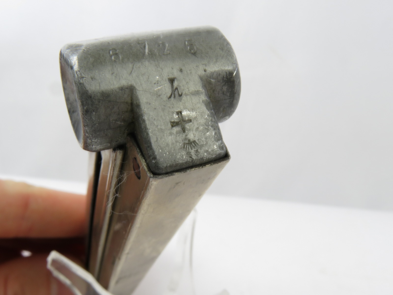 8/18/17 – This is a pre WW2 production Mauser Luger magazine. The magazine was most likely produced between 1936 and 1938. The magazine has an aluminum frame that was never blued (early style) and an aluminum base serial numbered 6726 h with a “+” sign and a droop winged eagle 63 military proof stamp. The magazine has no rust or pitting and is fully functional. Guaranteed original and authentic.
