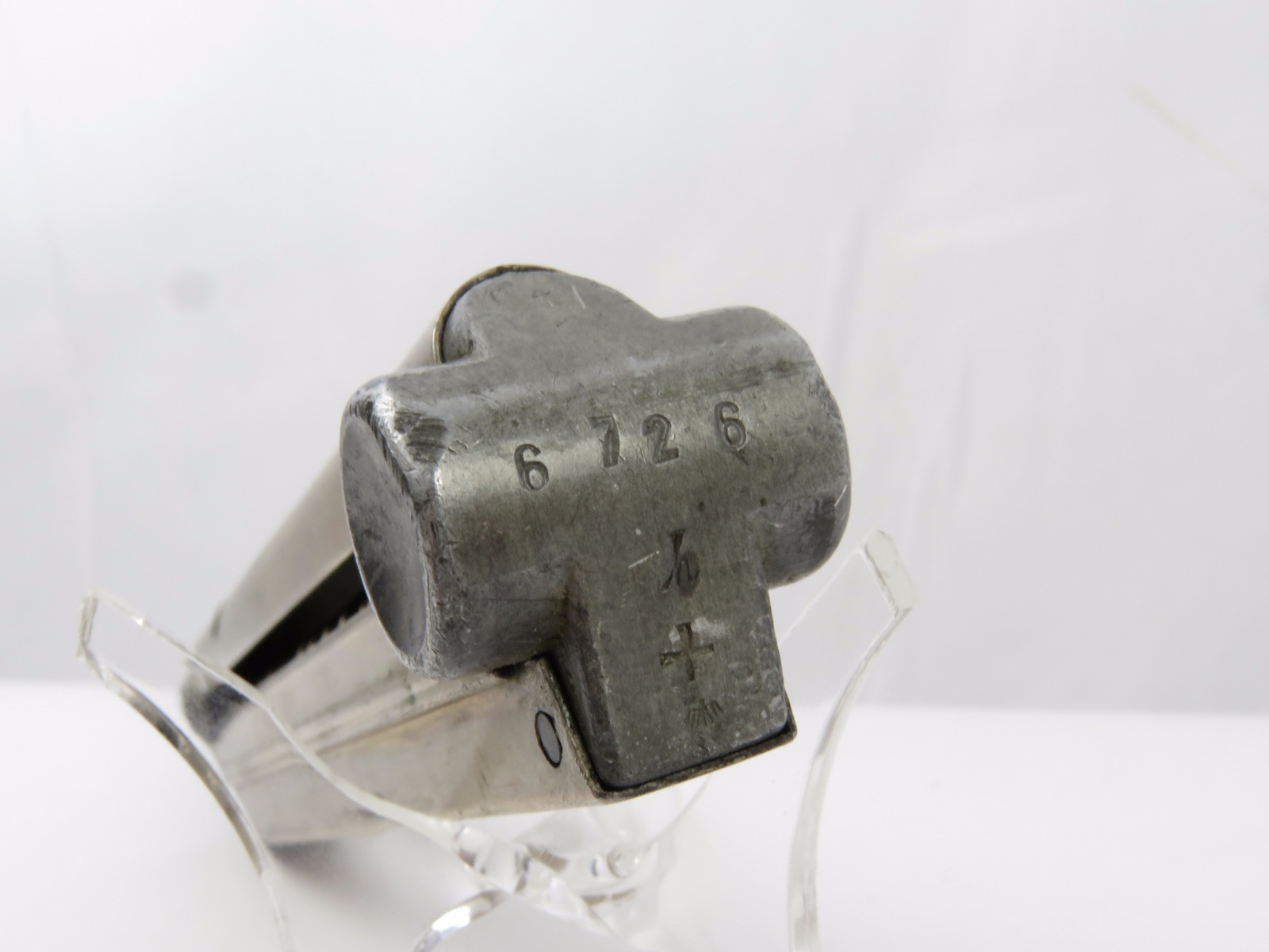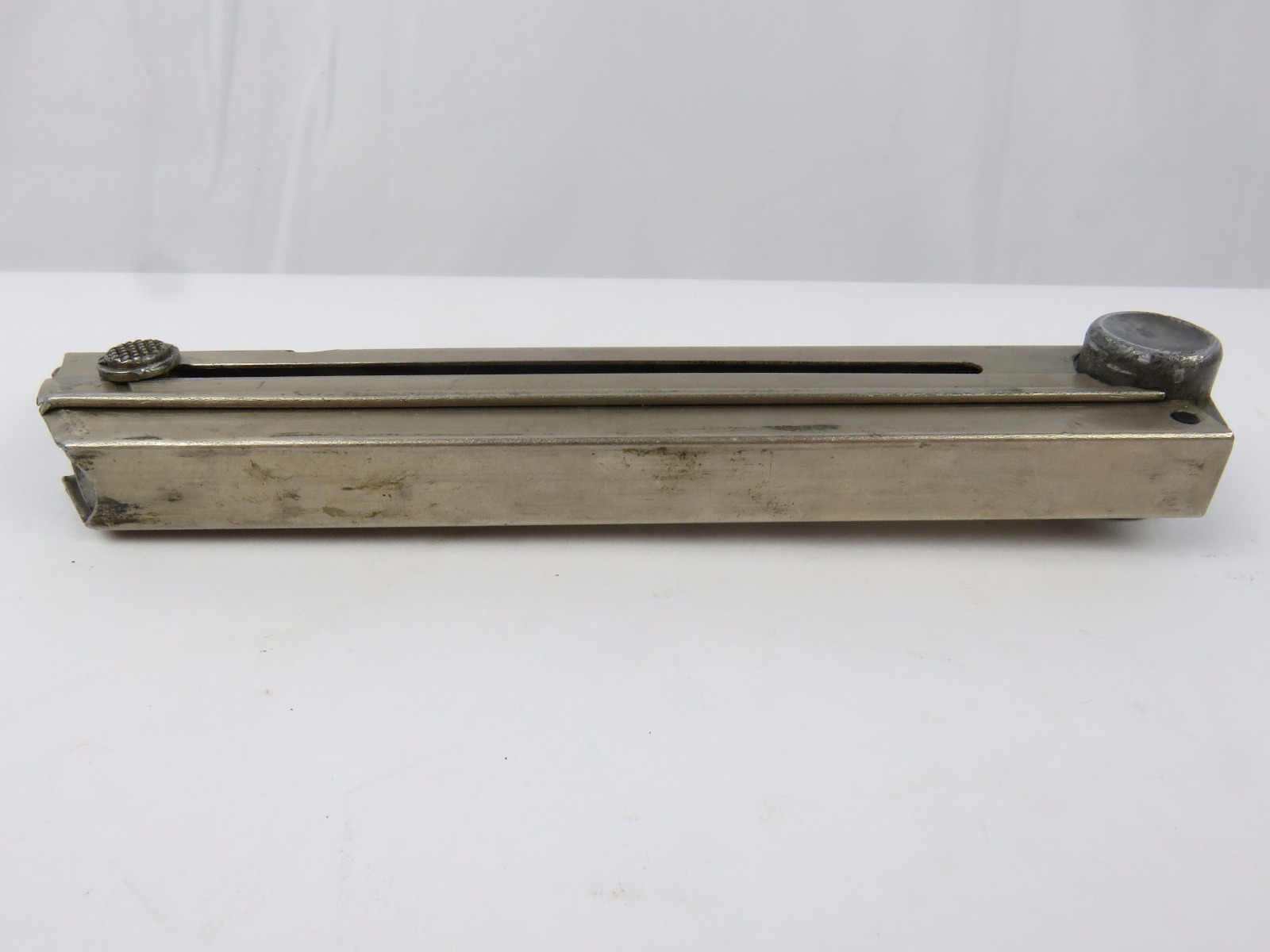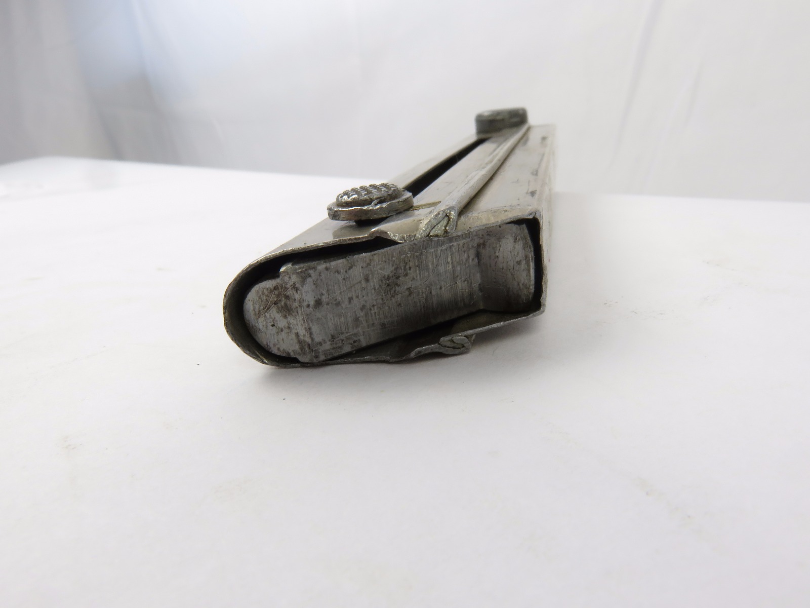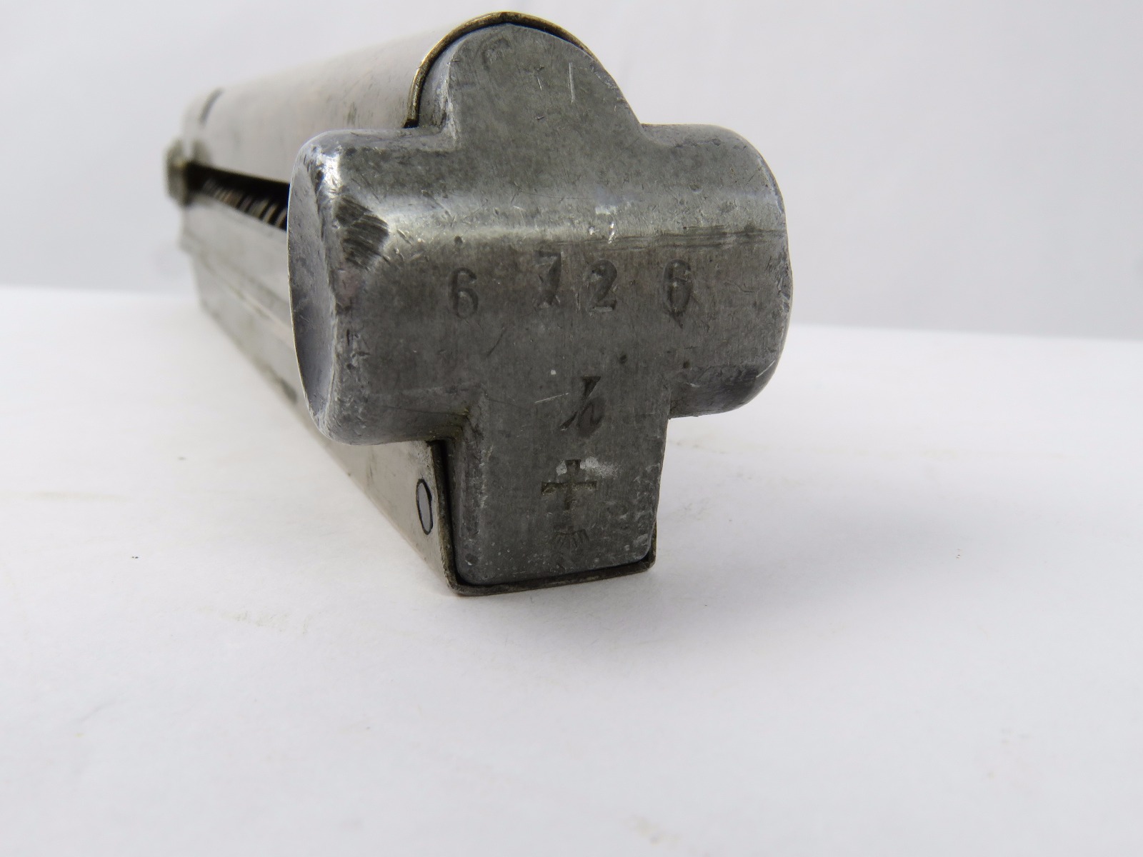 8/18/17 – This is a pre WW2 production Mauser Luger magazine. The magazine was most likely produced between 1936 and 1938. The magazine has an aluminum frame that was never blued (early style) and an aluminum base serial numbered 6726 h with a “+” sign and a droop winged eagle 63 military proof stamp. The magazine has no rust or pitting and is fully functional. Guaranteed original and authentic.