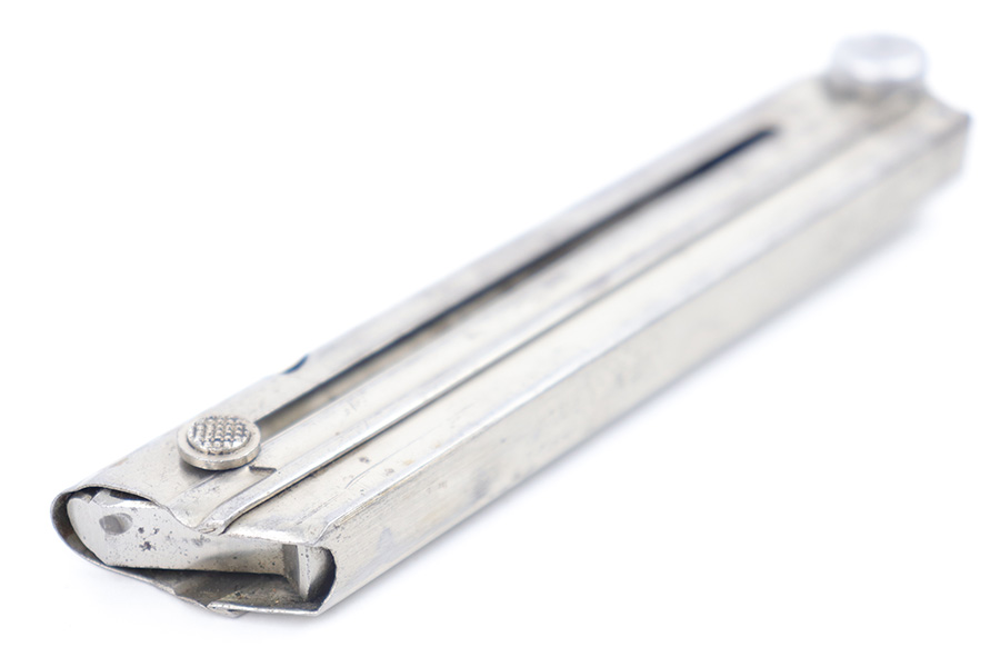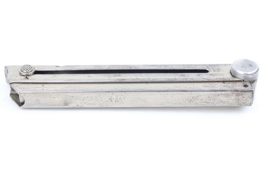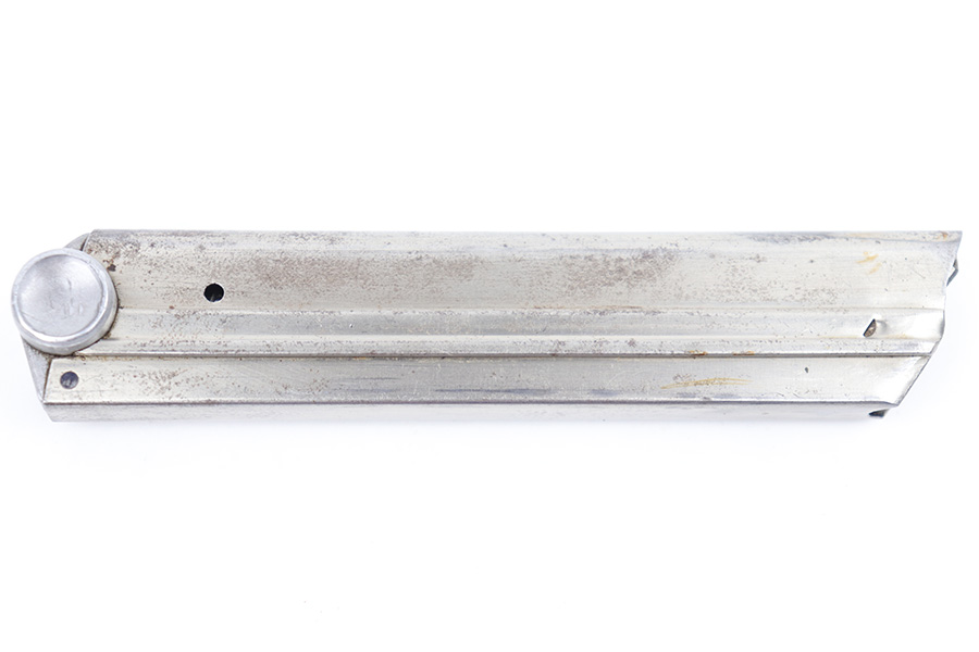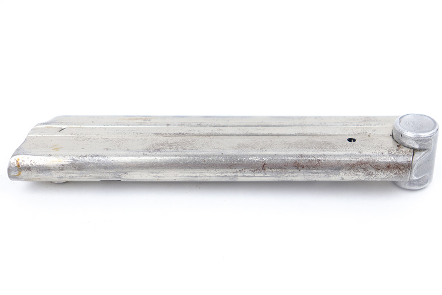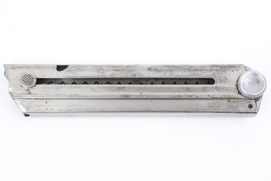 3/23/23 – This is an original, early WW2 production Mauser Luger magazine. The magazine has a nickel tube and aluminum base. The base is numbered 2400f with a droop winged eagle 63 military proof stamp underneath. The tube has some dark surface patina throughout, but this is mild overall. The spring is strong and fully functional.