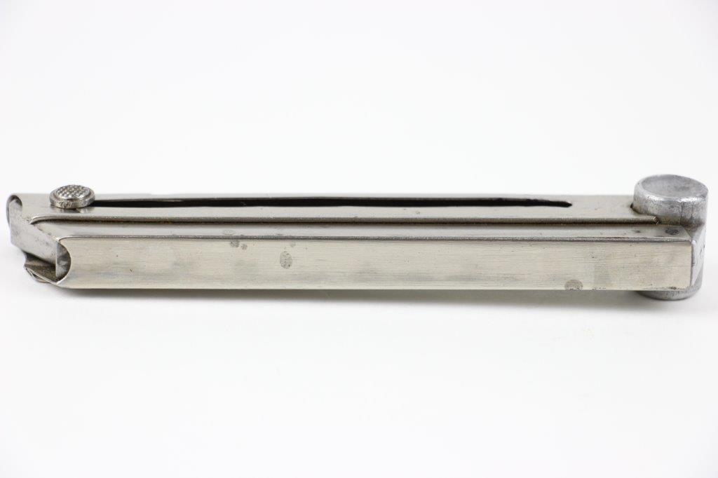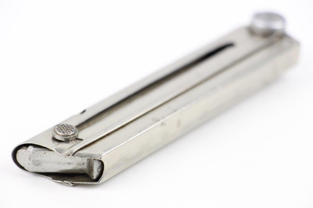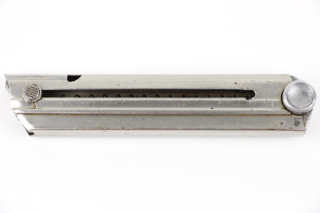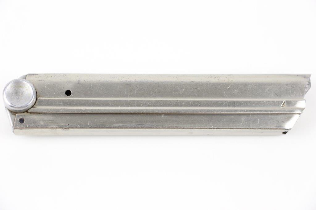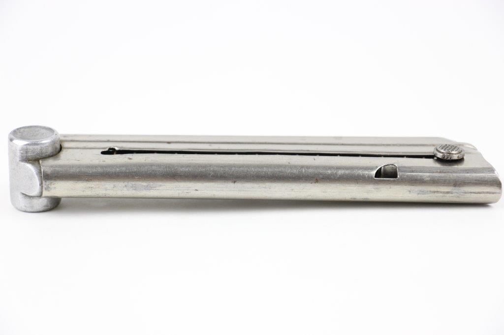 3/5/24 – This is an original, early WW2 Mauser production Luger magazine. The magazine has a nickel finish with some mild surface scratches but minimal surface discoloration. The aluminum base is serial numbered 3846f with a plus sign and droop winged eagle 63 military proof stamp. The spring is strong and fully functional.