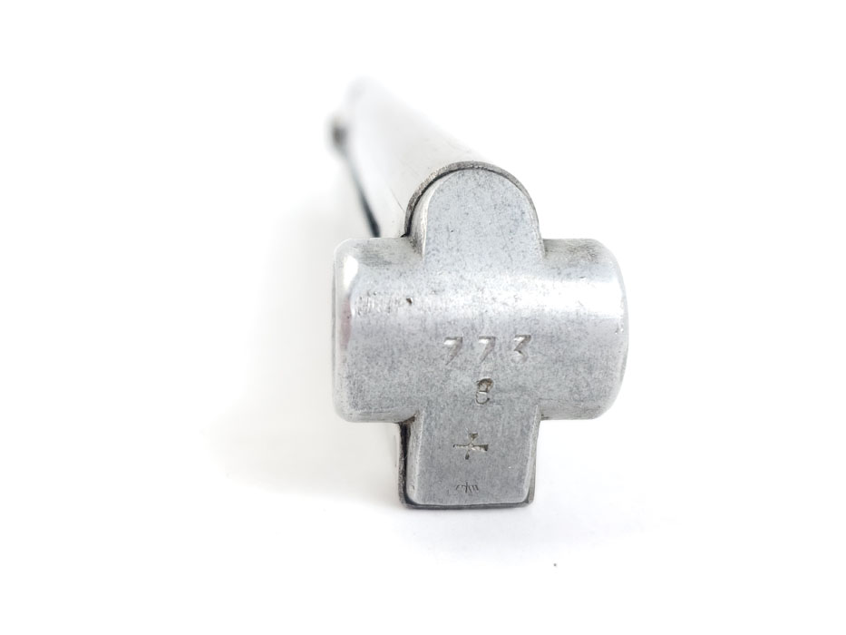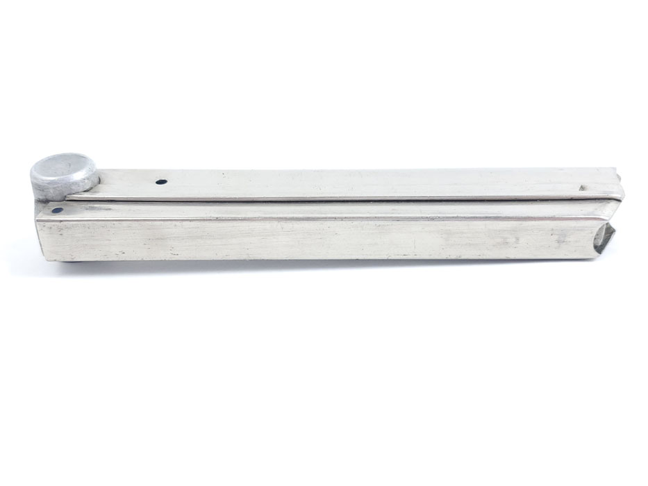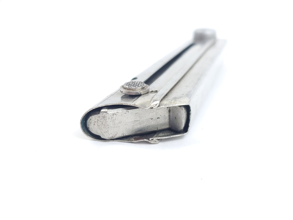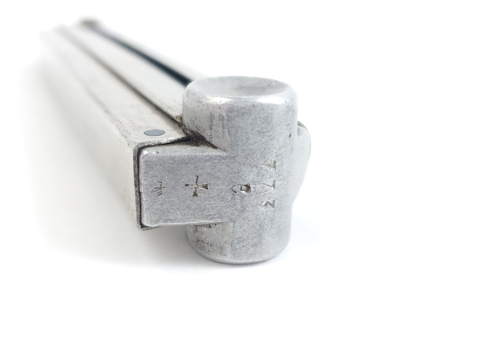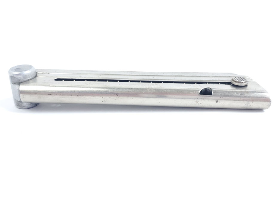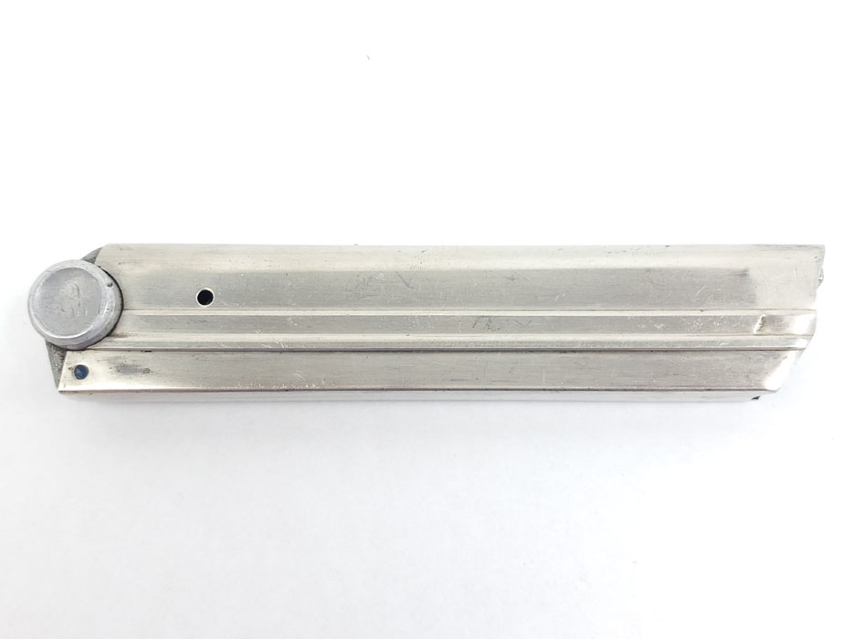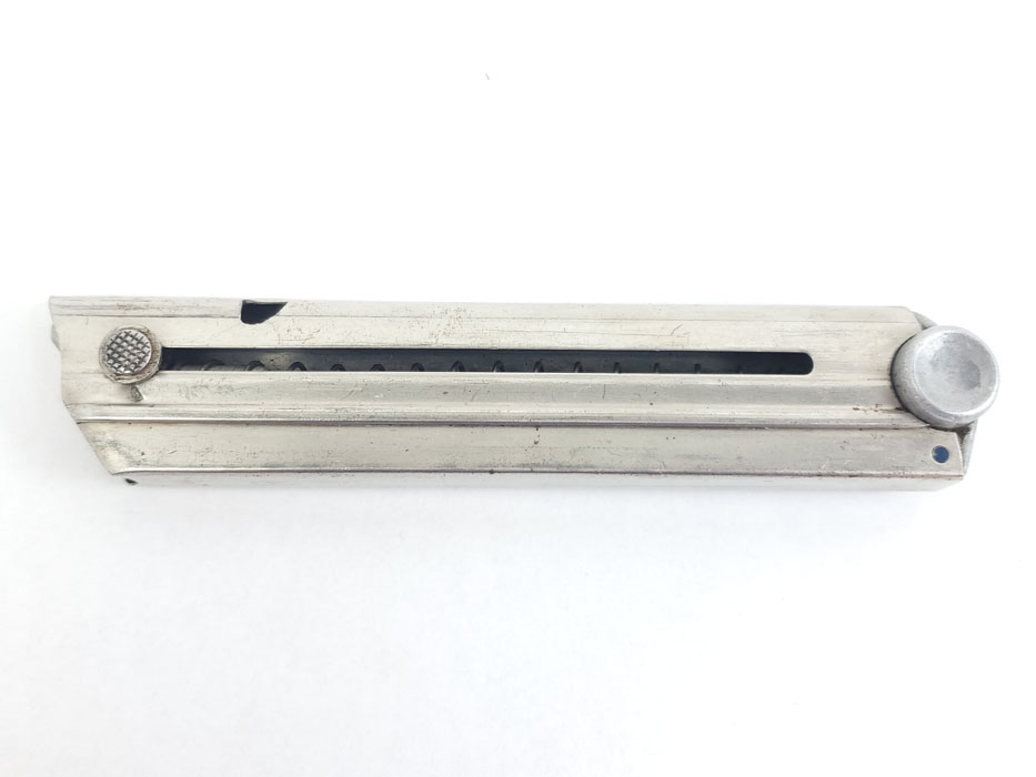 5/29/20 – This is an early WW2 era production Mauser Luger magazine. The magazine has a nickled frame and aluminum base. Excellent condition overall with no rust or pitting, and a strong fully functional spring. The aluminum base has a 3 digit serial number and droop winged eagle proof stamp.