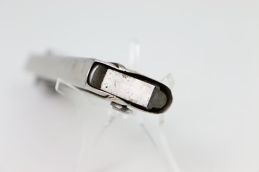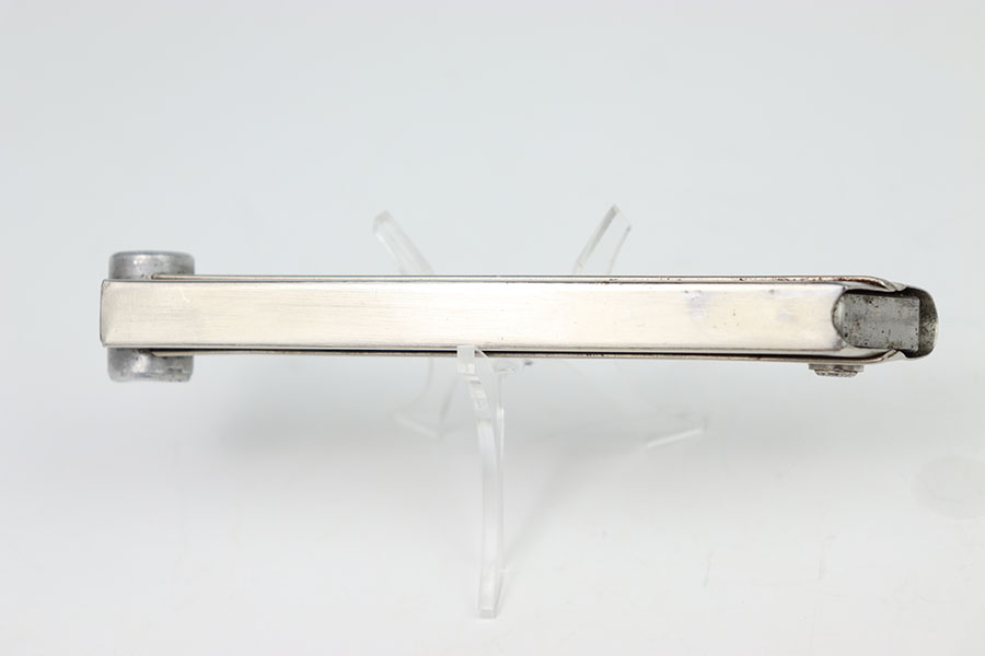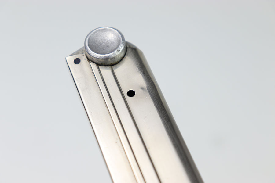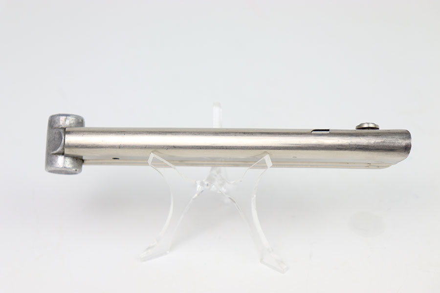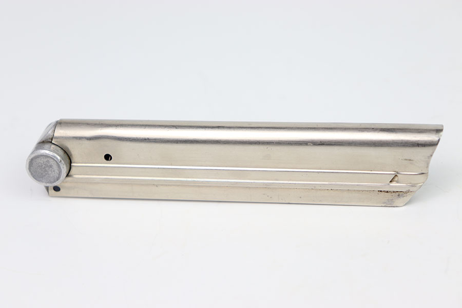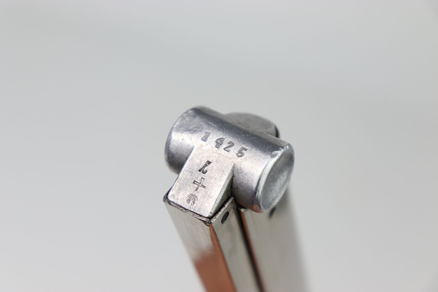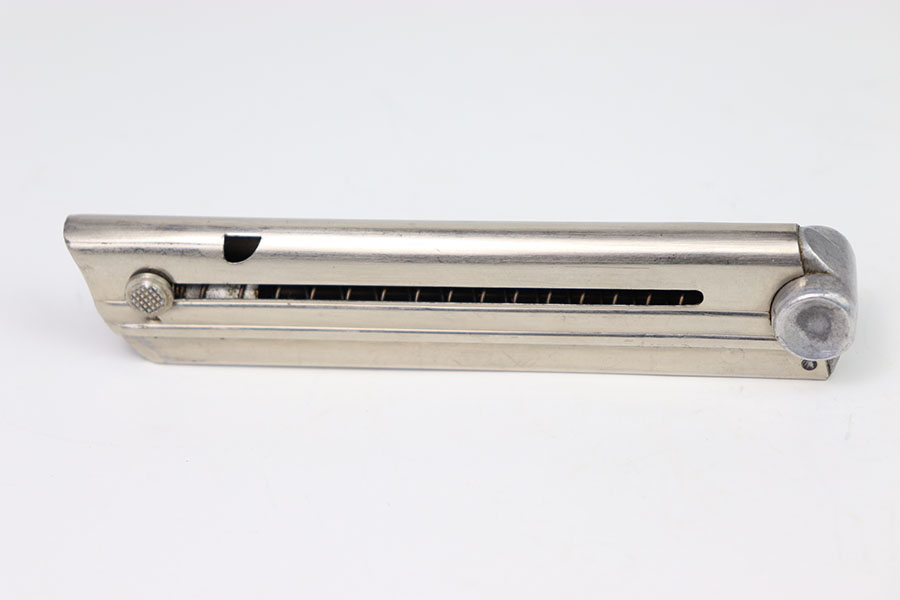 3/25/24 – This is an original, early WW2 Mauser production Luger magazine. The magazine has a nickel finish with very little surface wear. The aluminum base is serial numbered 1425i with a plus sign and droop winged eagle 63 military proof stamp. There are two minor dents one is on the left side of the tube around the hole at the bottom of the magazine. The other is on he right knob on the aluminum base, see photos. The spring is strong and fully functional.