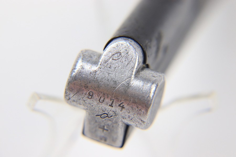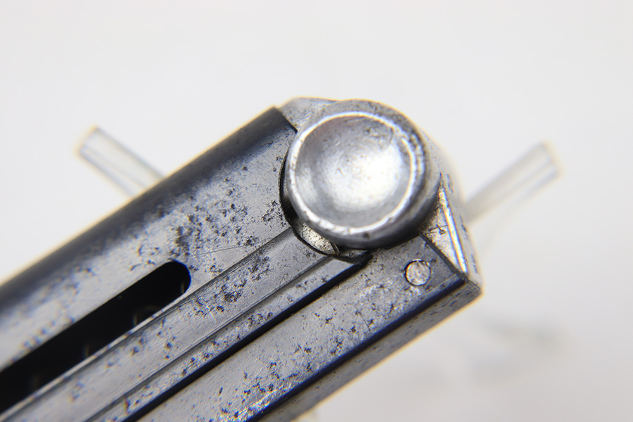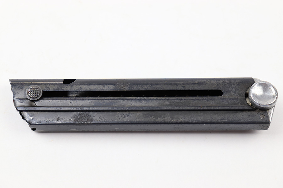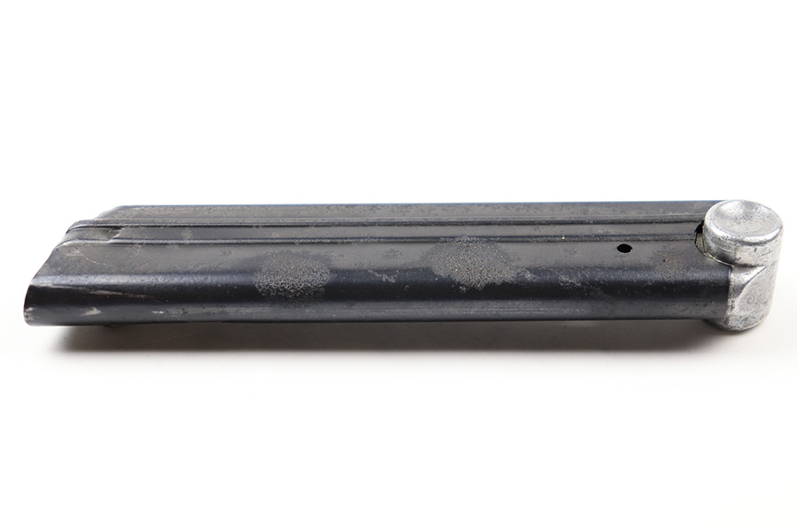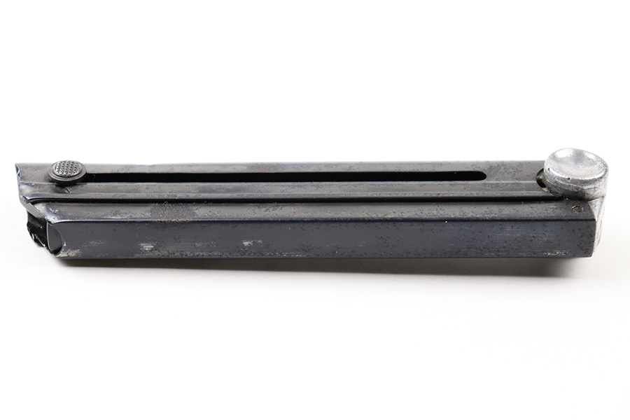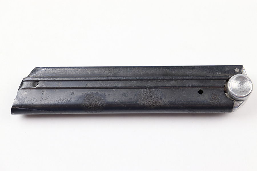7/15/22 – This is an original Mauser Luger magazine from early WW2. The magazine has an aluminum base with serial number “9014 o”, a plus sign, and droop eagle 63 military proof stamp. The blued magazine tube is in good condition but there is some pitting and corrosion on the magazine that has been blued over. The spring is strong and fully functional. Price reduced based on condition / refinish.
