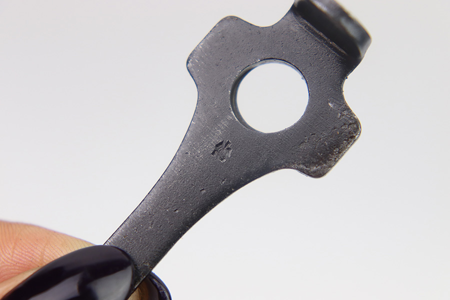 11/14/22 – This is an original Mauser Luger tool from early wartime production. The tool is stamped on the front metal with a droop winged eagle 63 proof. There are no other markings or stamps. The blued finish is original and mostly intact but there is some mild speckling and surface patina in a few spots. Overall great condition.