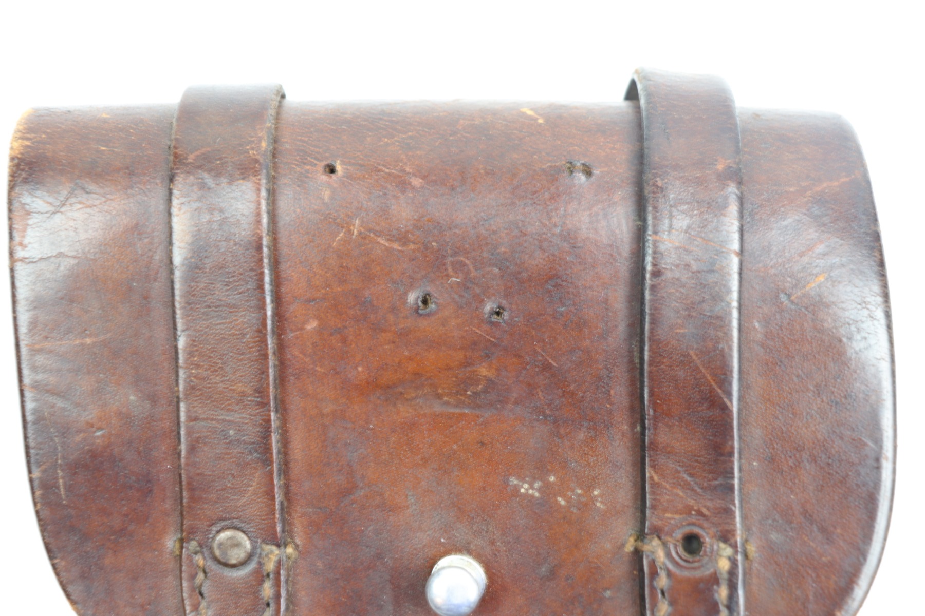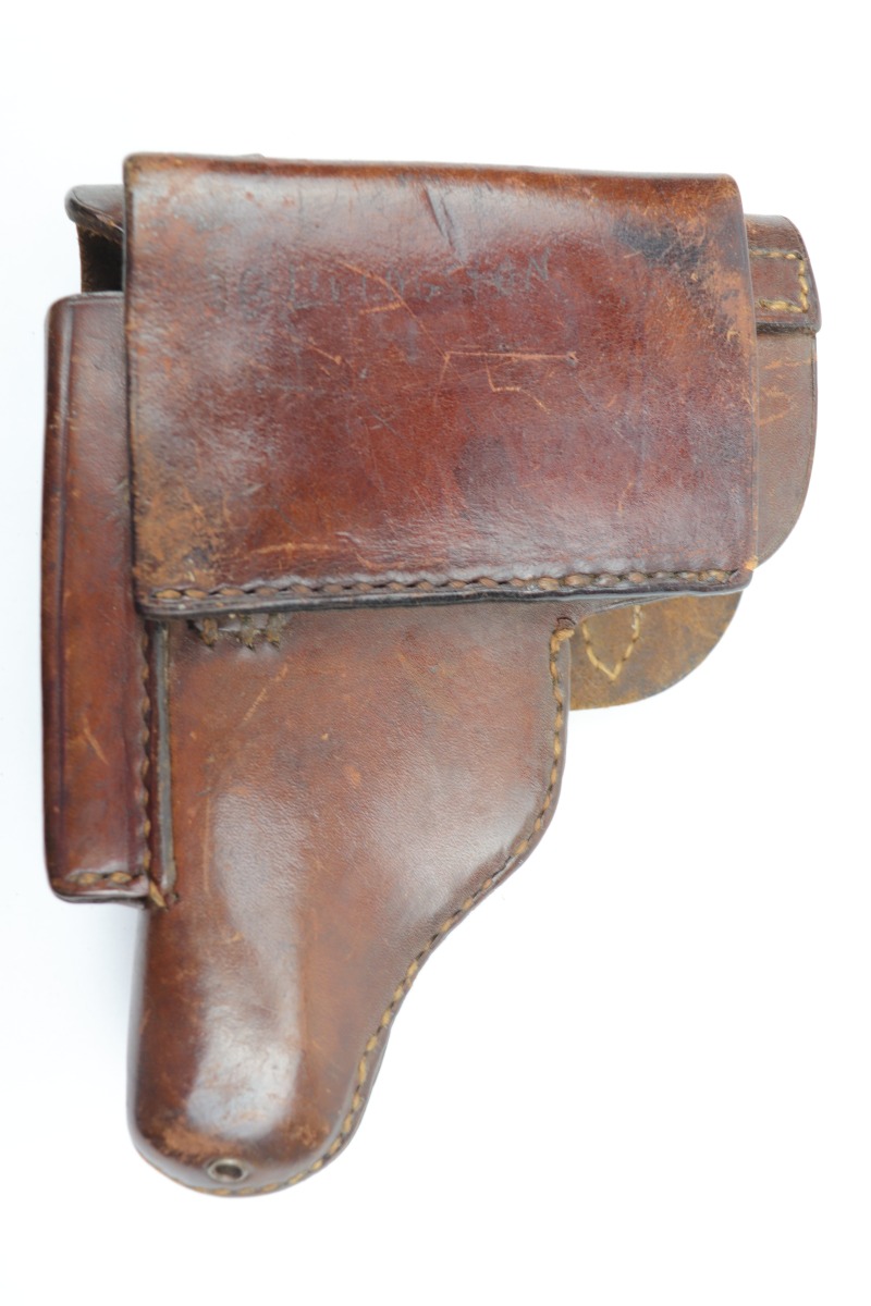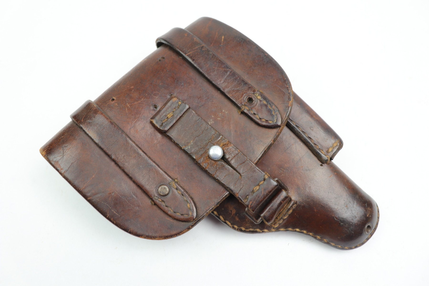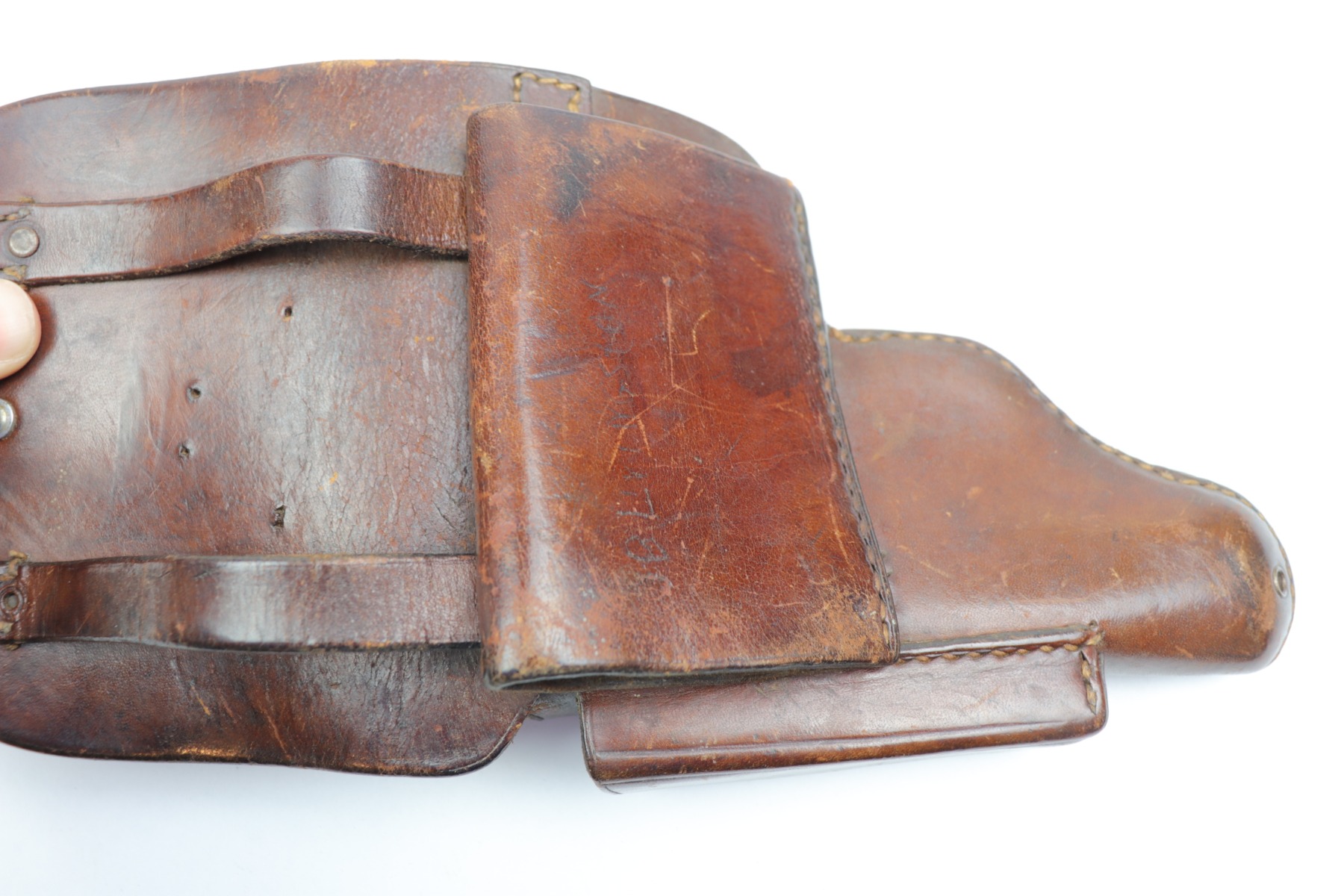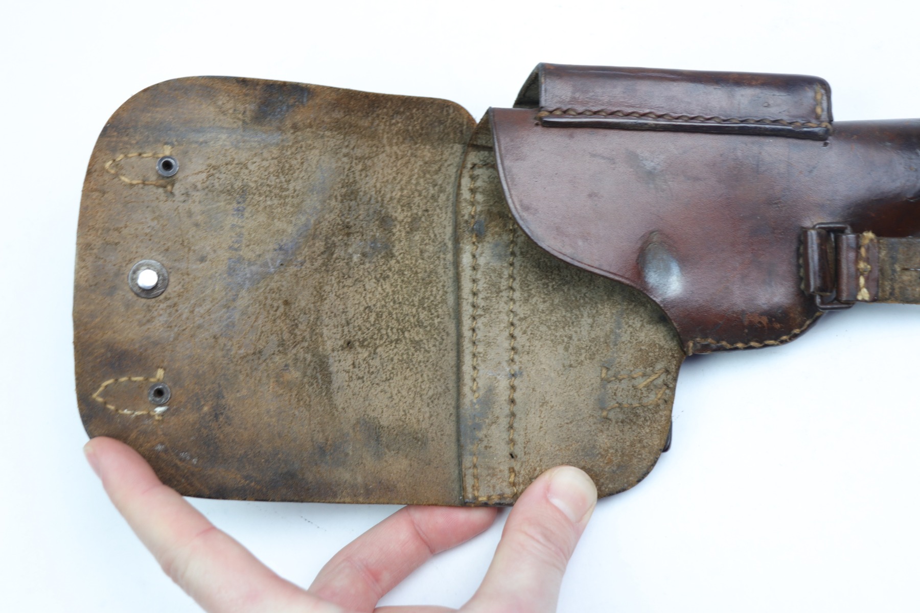 12/28/20 – This is a rare variation dropping style holster for a Luftwaffe or waffen proofed Walther PPK. The holster is “dropping style” with an adjustable backside belt loop. The brown leather is in great shape but there are four small holes on the front leather from a previous embellishment. These are minor, and there are no other issues with the leather. The interior leather has a faint ink stamp which indicates “PPK”, showing this is for a Walther PPK and not a typical Femaru m37 holster. The stitching is all original and in tact.