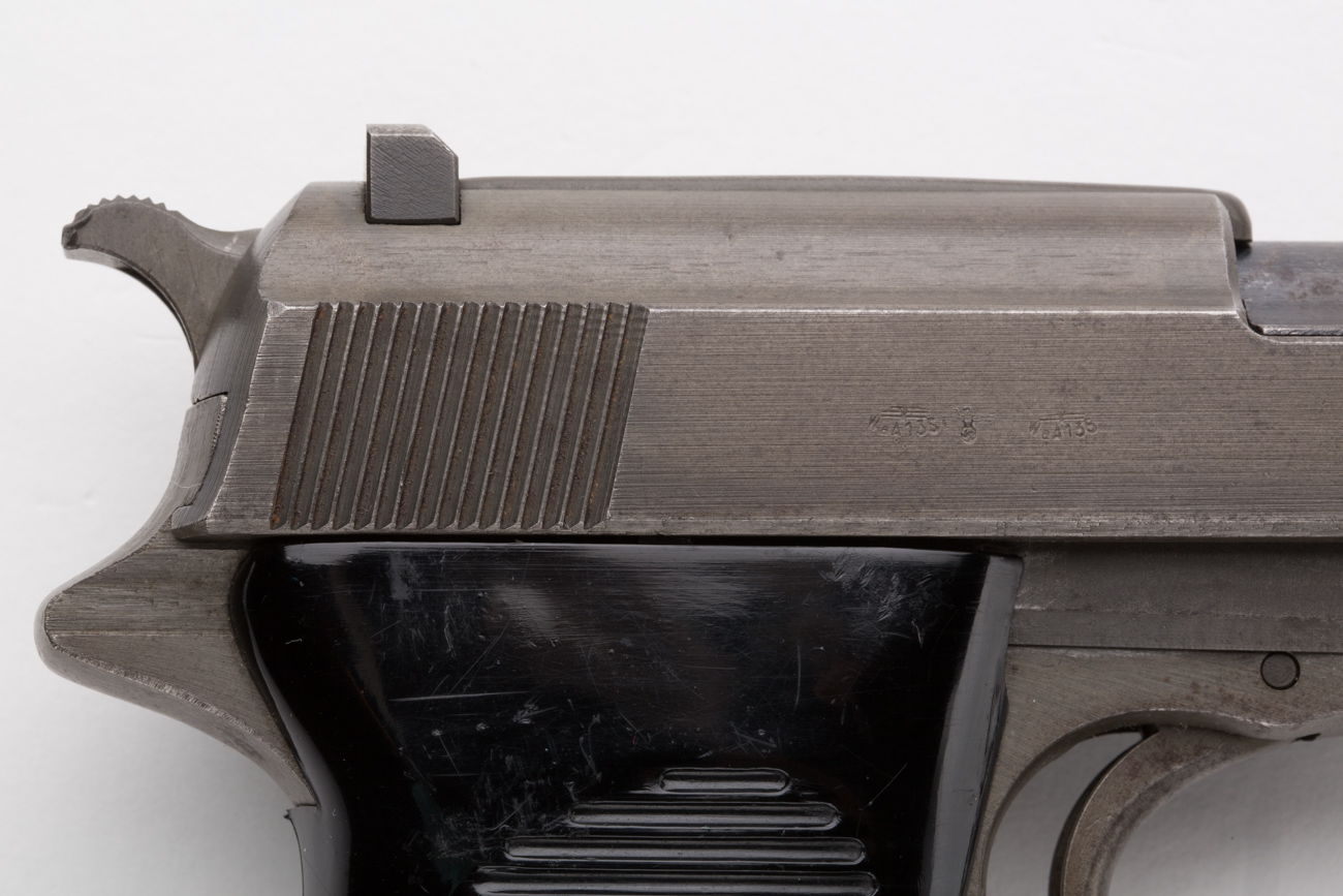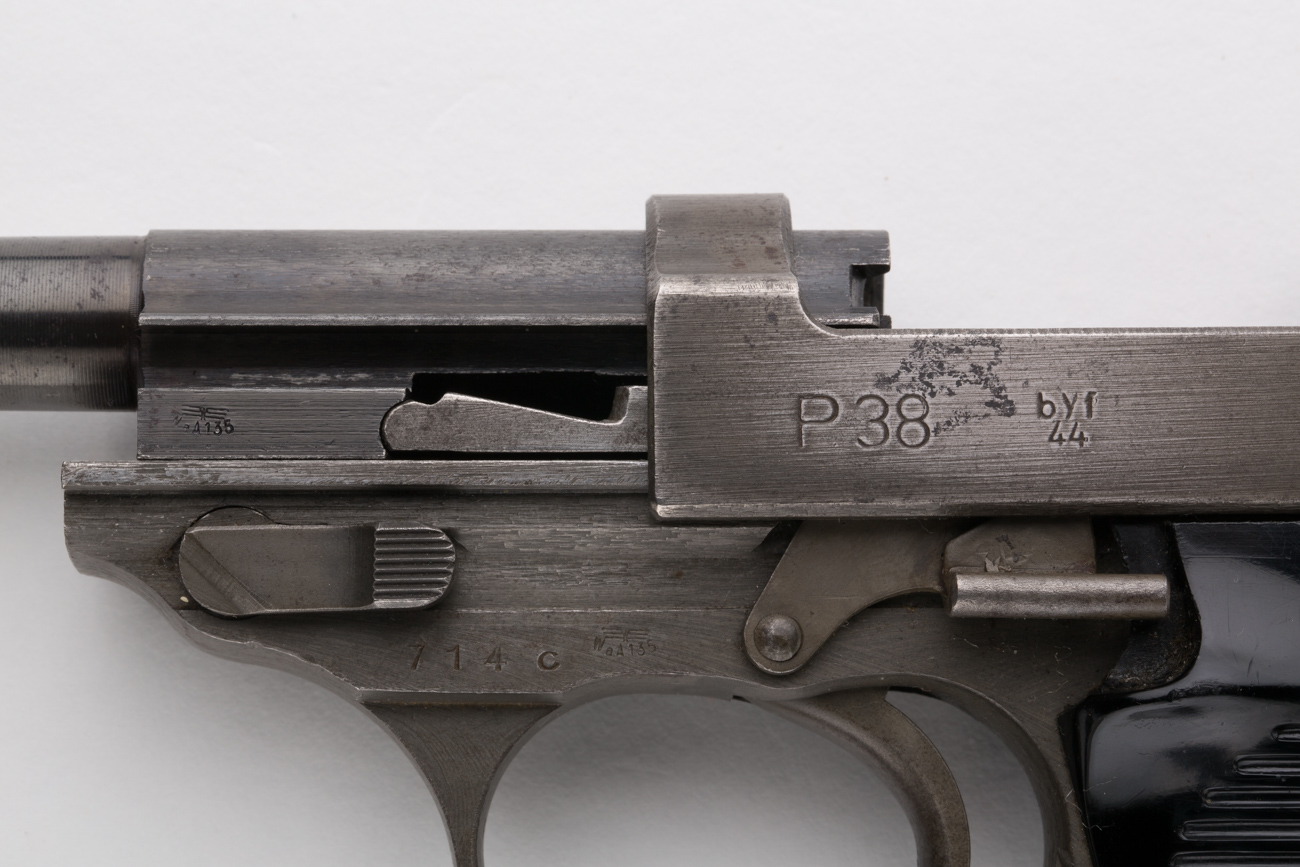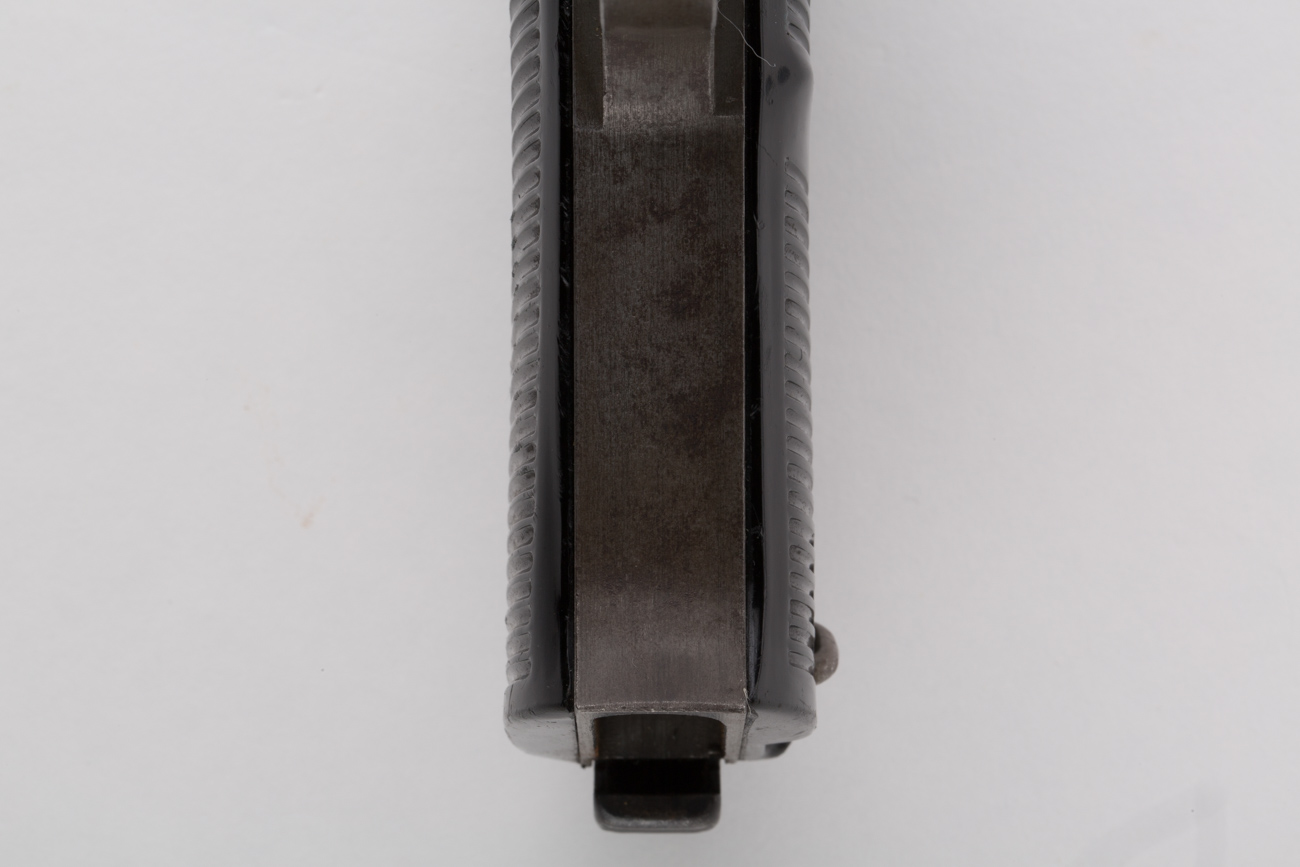9/29/17 – This is a Mauser-made dual-tone P.38 from 1944, with blued barrel but all other parts phosphated. All matching and correct with about 92-93% finish. Some thinning and freckling on left side of slide. Nice grips with minor dings but no chips or cracks. Strong bore with no major flaws.