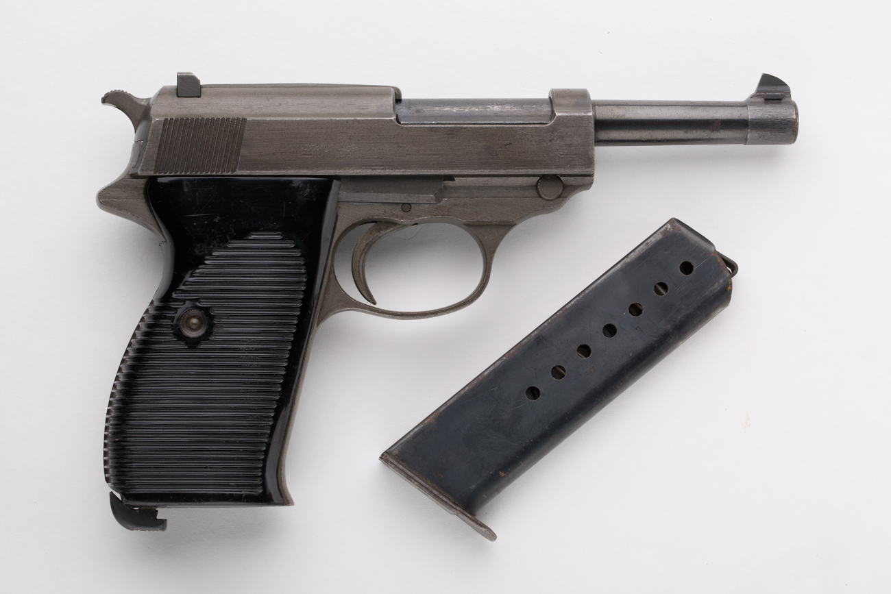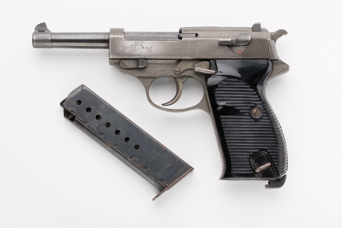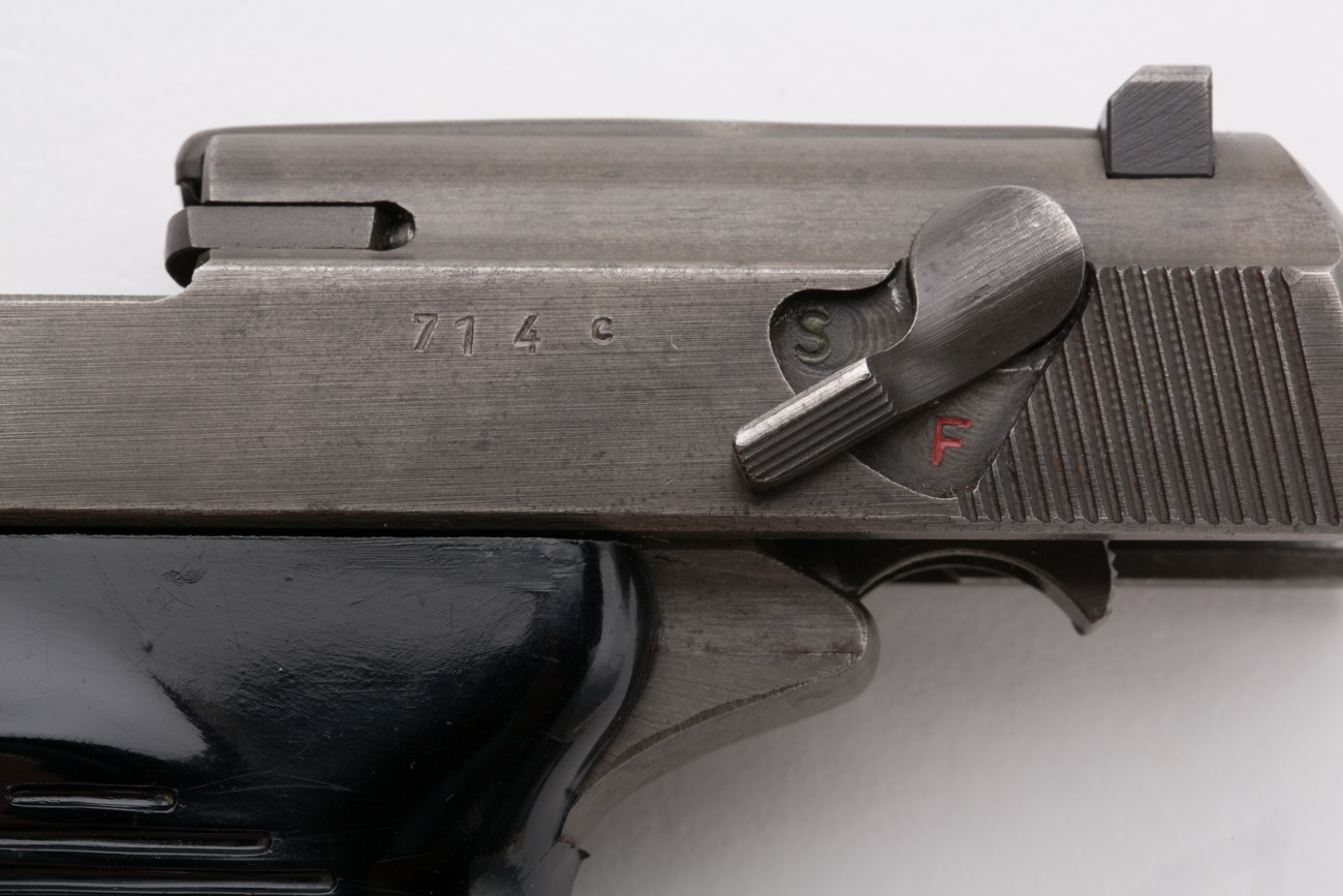 9/29/17 – This is a Mauser-made dual-tone P.38 from 1944, with blued barrel but all other parts phosphated. All matching and correct with about 92-93% finish. Some thinning and freckling on left side of slide. Nice grips with minor dings but no chips or cracks. Strong bore with no major flaws.