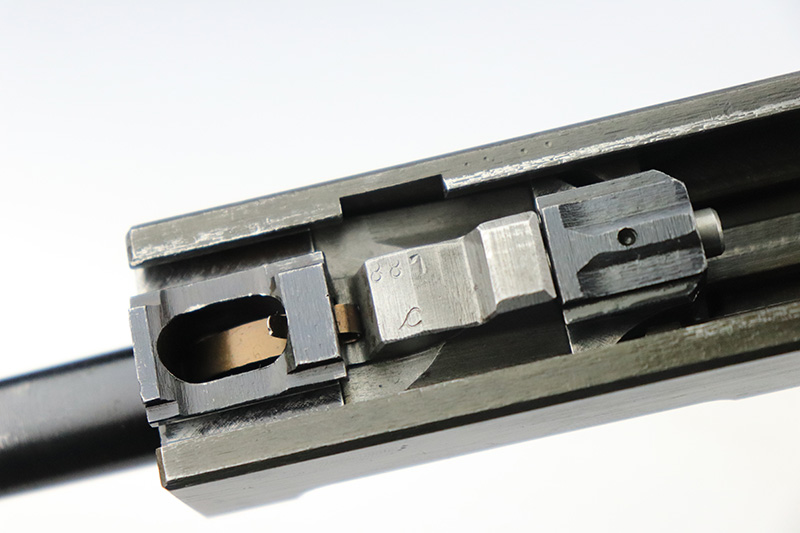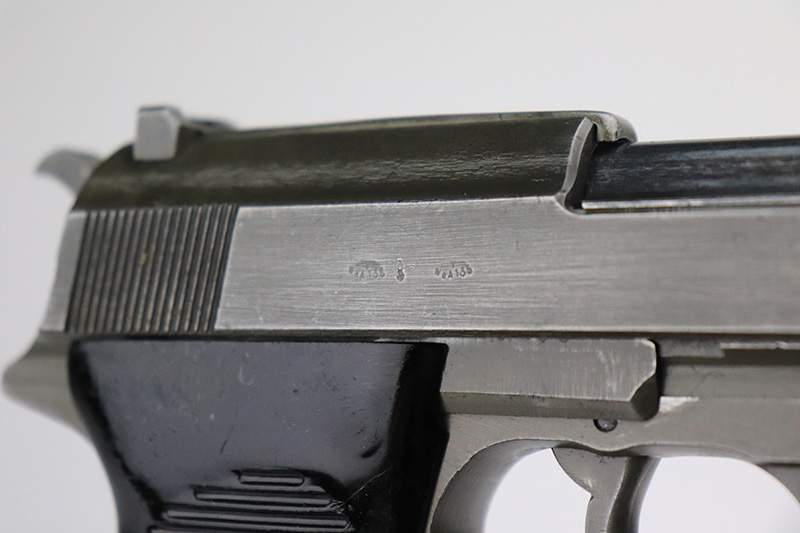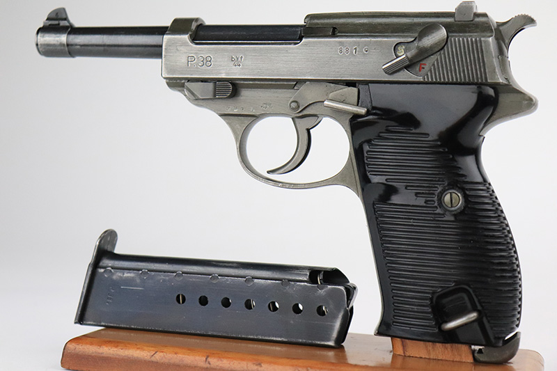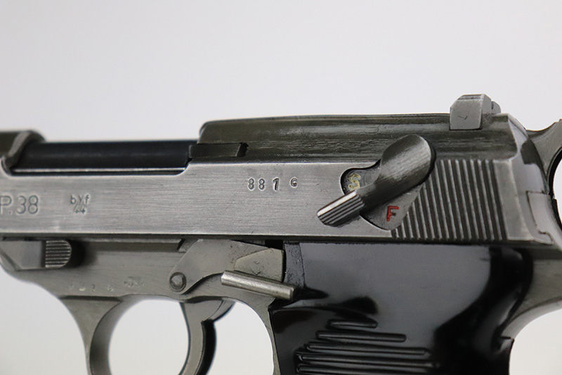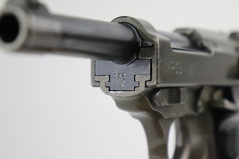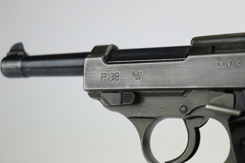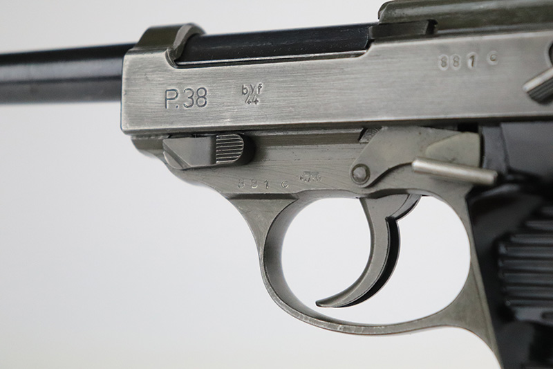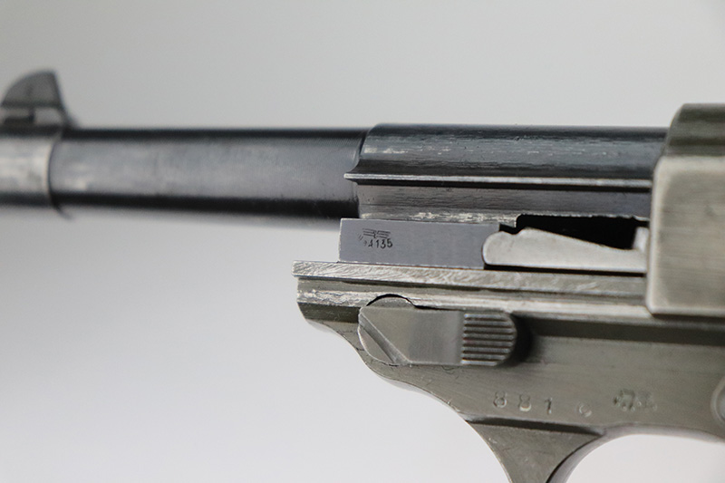 9/16/22 – This is an all matching and original Mauser P.38 from January of 1945 with dual-tone finish (phosphate slide/frame, blued barrel). Finish is always a little difficult to rate on these but there’s minor thinning on each side of the slide, some oxidation on the front strap and some wear on the firing pin cover. Nice black plastic grips with minor scratches on each side. WaA135 mag.