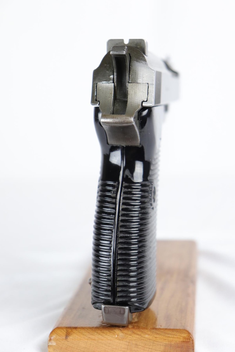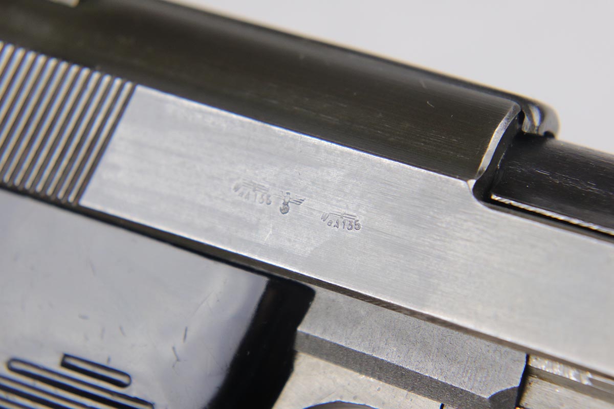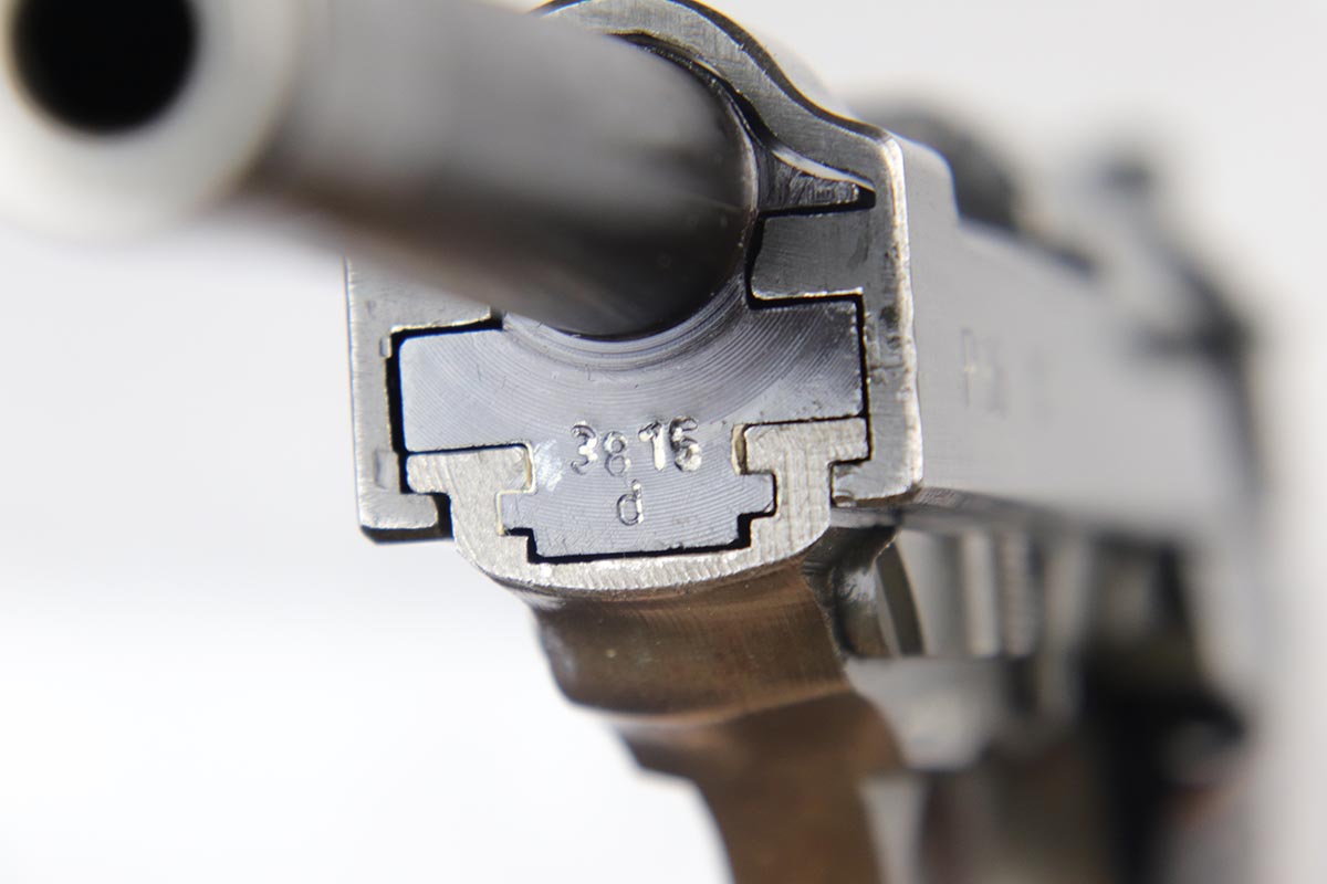 6/7/18 – This is an all matching and all original byf 44. Black plastic Mauser grips with a proper Mauser E/135 proofed magazine. The frame has an original phosphate finish that rates at about 97%, with some discoloration throughout, but this is likely how the pistol’s finish was when it left the factory. The barrel and the slide have a thin blued finish. Excellent bore.