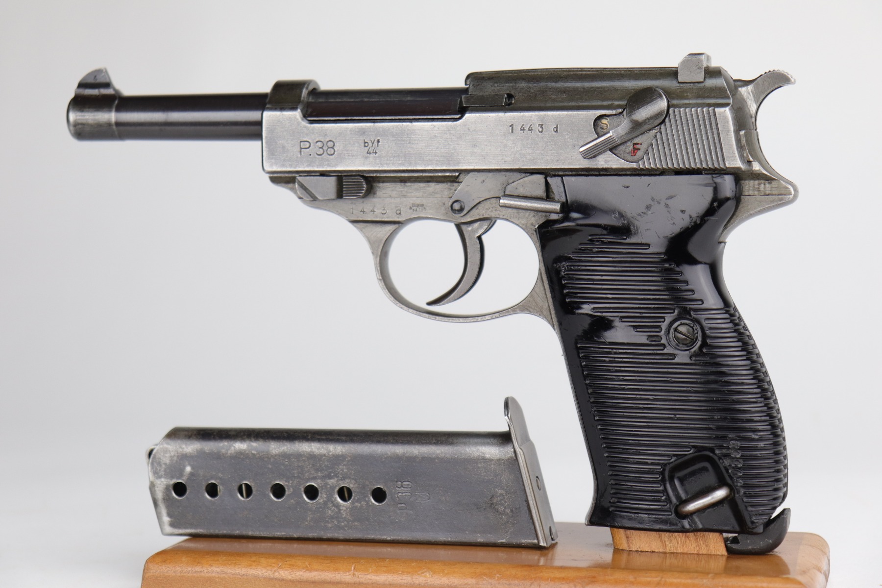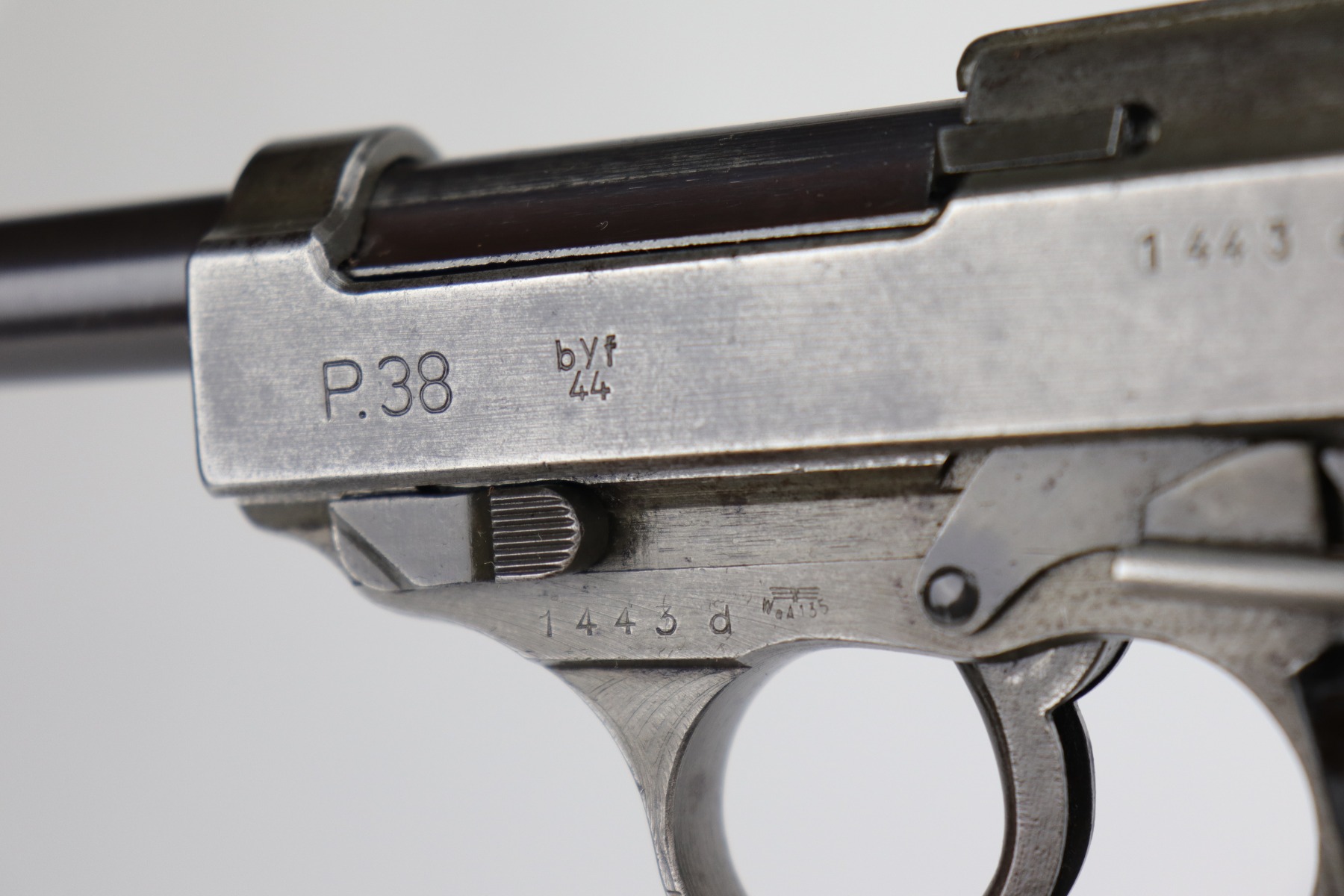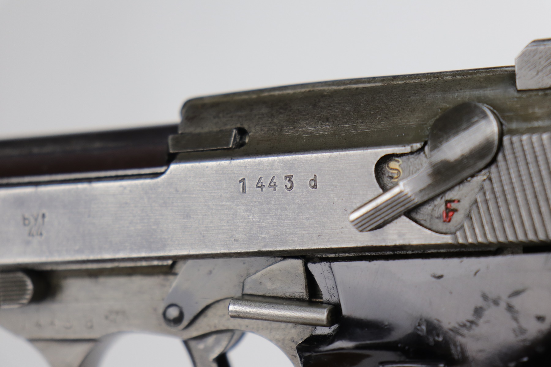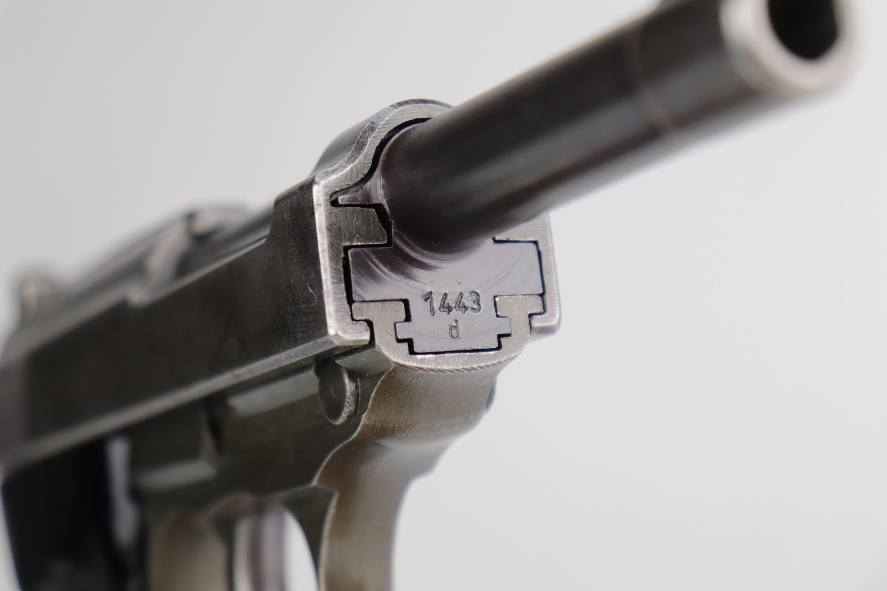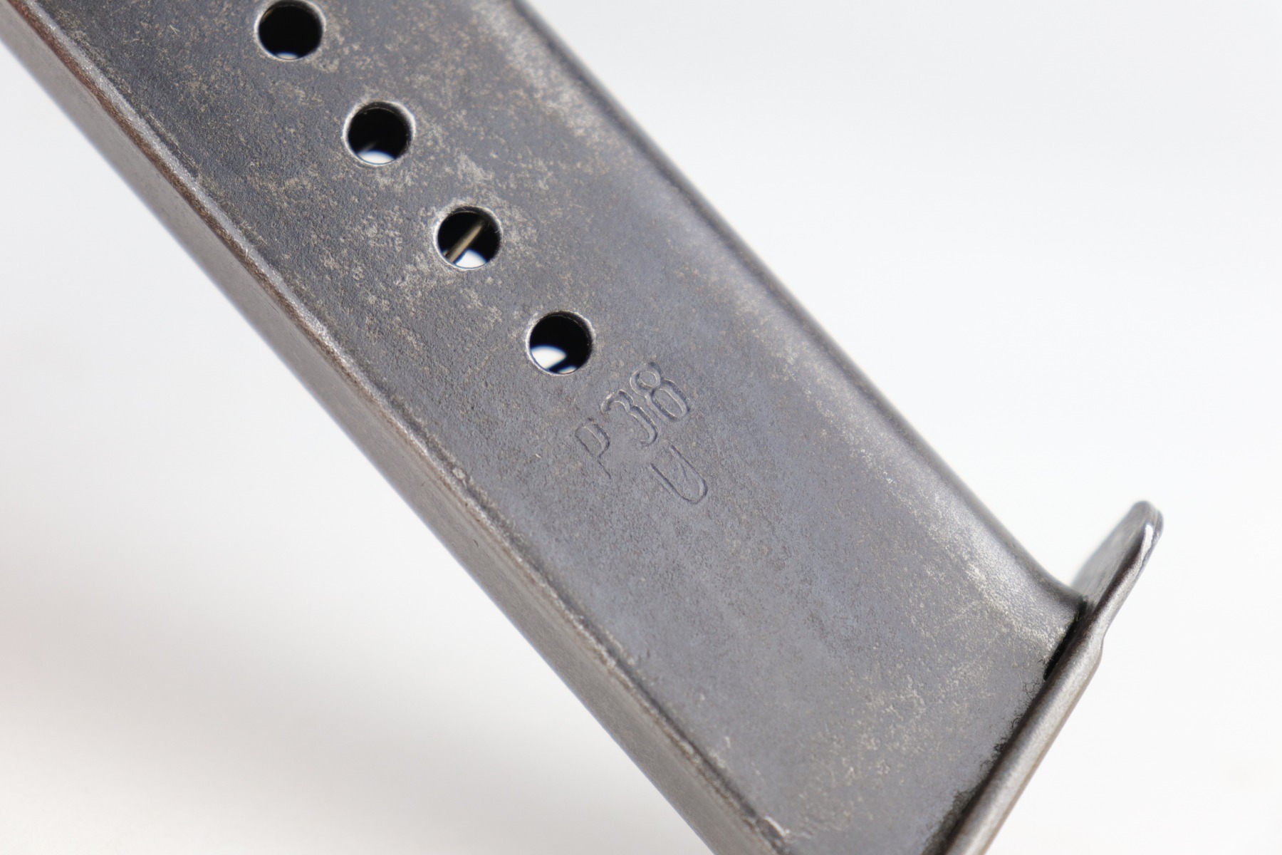 10/30/20 – This is a nice example of a “dual-tone” Mauser P.38 issued to the Nazi military in 1944. Its “dual-tone” appearance is caused by a phosphate frame and slide and a blued barrel. This one is all matching and has the proper “Waffen 135” Nazi military acceptance proofs. This particular gun has a serial number in the D block. The nature of the phosphate finish on the frame and slide makes the finish difficult to rate as most of the phosphate is thin. Our best estimate is roughly 70%. There is wear around the muzzle and high edges of the slide. Thinning on the front strap. There is spotty oxidation throughout. It comes with nice black plastic grips – just some handling marks, most noticeable on the left panel. It also comes with a late-war phosphate “P.38 U” magazine. The bore is shiny with strong rifling – minor freckling in the grooves. It is fully functional, including the de-cocker.