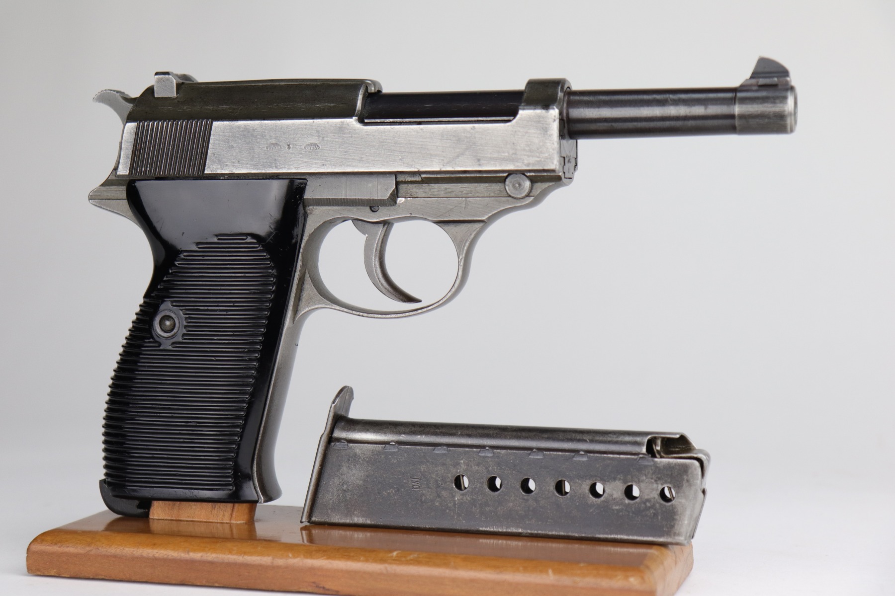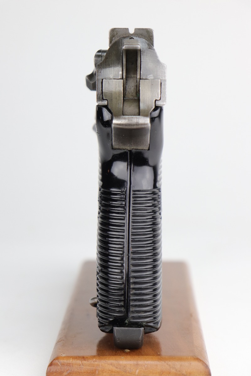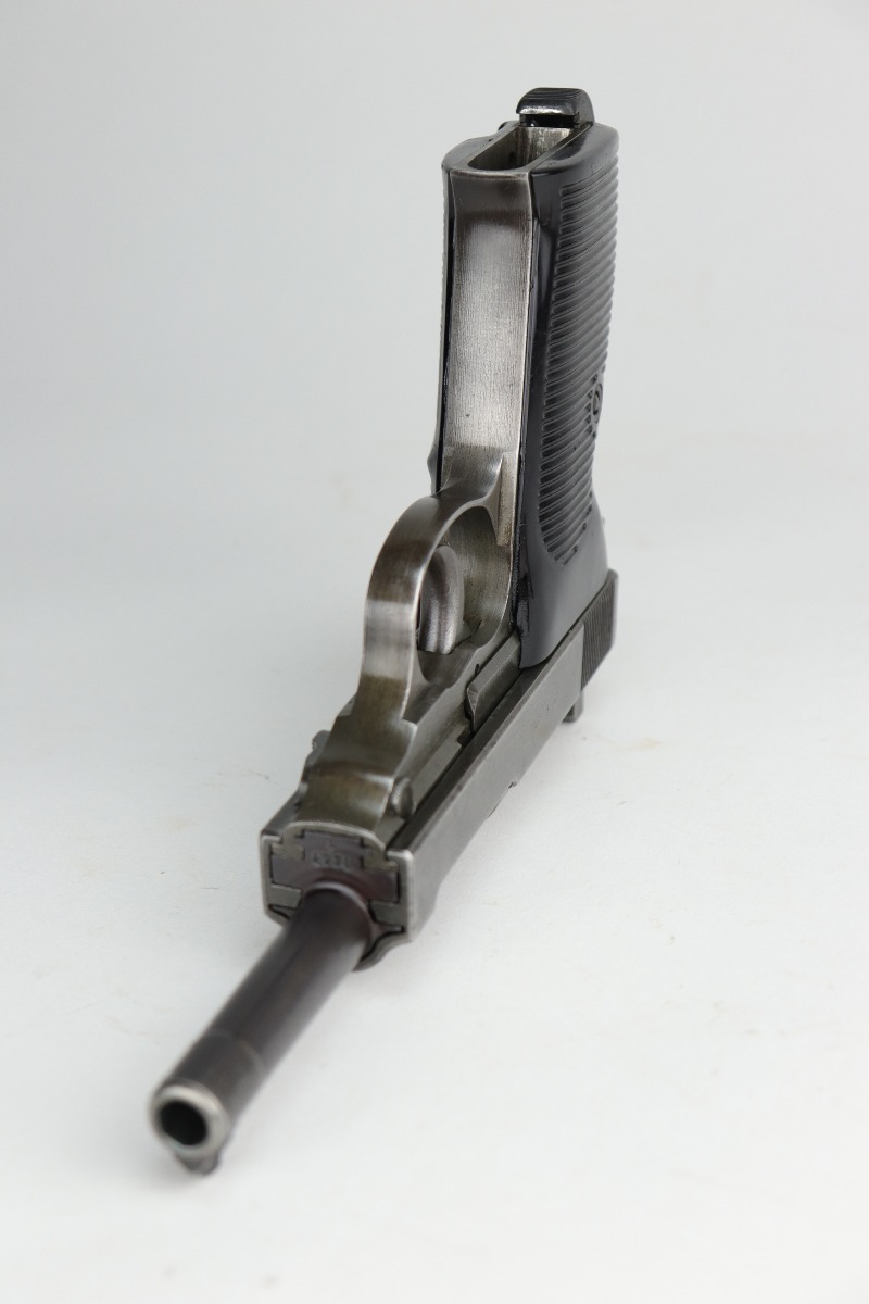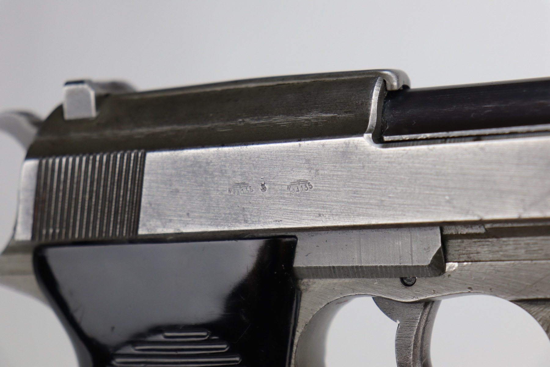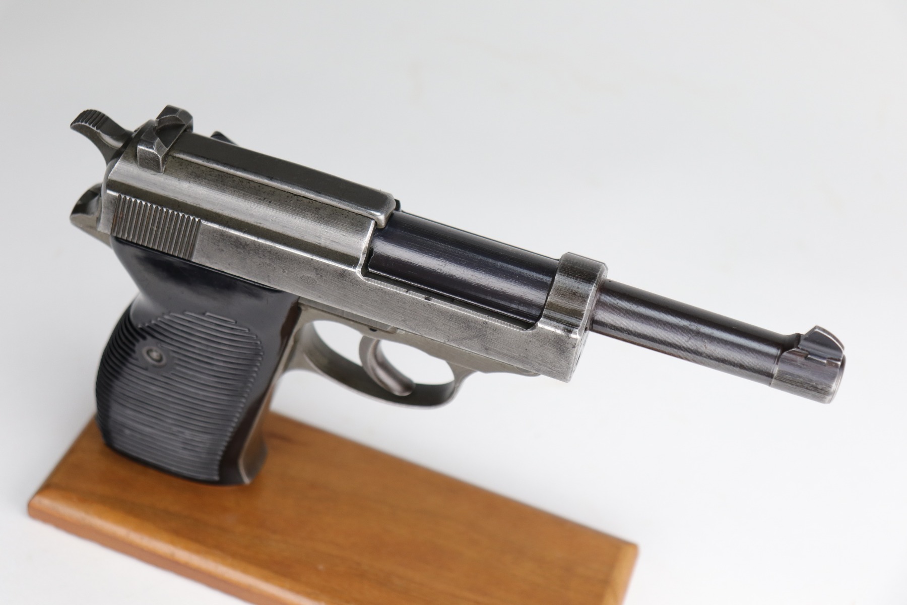 10/30/20 – This is a nice example of a “dual-tone” Mauser P.38 issued to the Nazi military in 1944. Its “dual-tone” appearance is caused by a phosphate frame and slide and a blued barrel. This one is all matching and has the proper “Waffen 135” Nazi military acceptance proofs. This particular gun has a serial number in the D block. The nature of the phosphate finish on the frame and slide makes the finish difficult to rate as most of the phosphate is thin. Our best estimate is roughly 70%. There is wear around the muzzle and high edges of the slide. Thinning on the front strap. There is spotty oxidation throughout. It comes with nice black plastic grips – just some handling marks, most noticeable on the left panel. It also comes with a late-war phosphate “P.38 U” magazine. The bore is shiny with strong rifling – minor freckling in the grooves. It is fully functional, including the de-cocker.