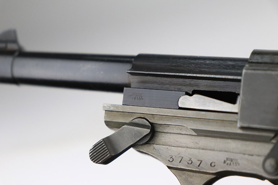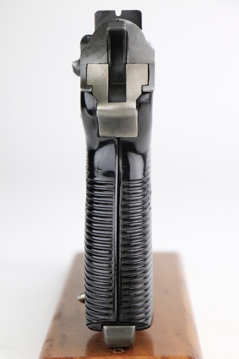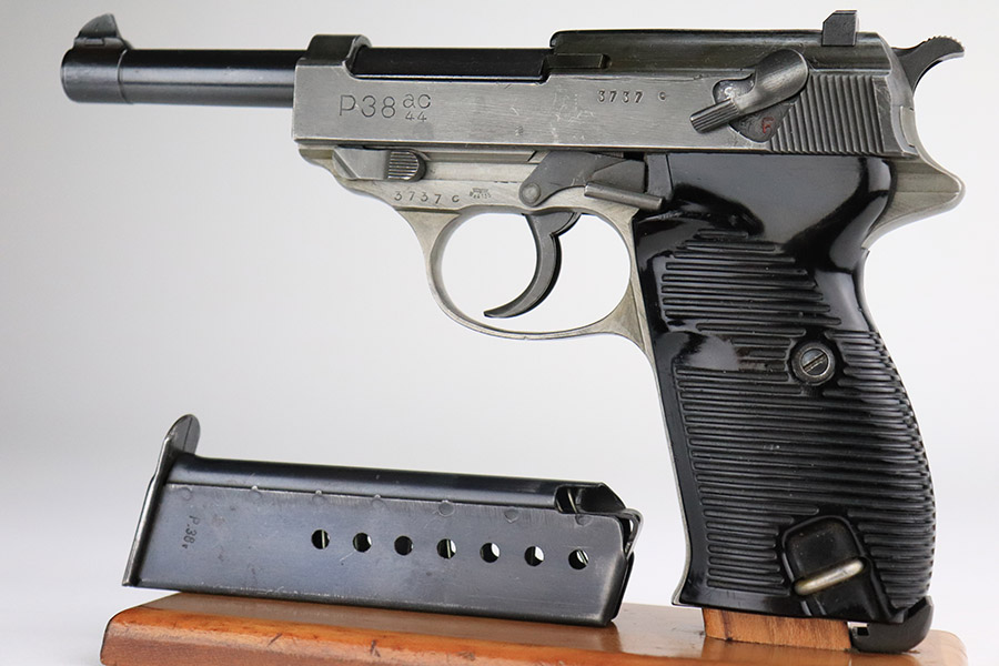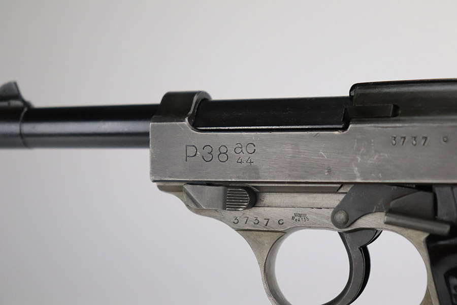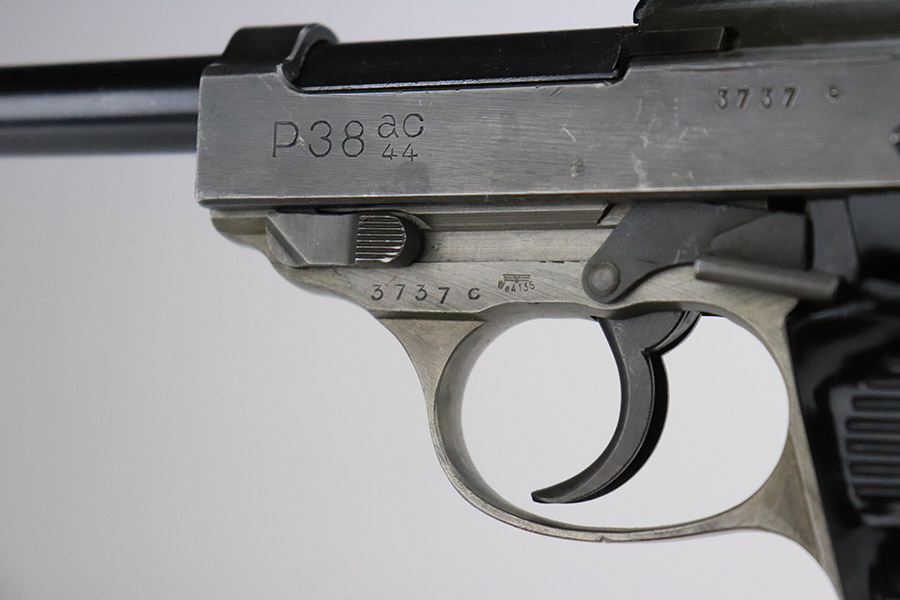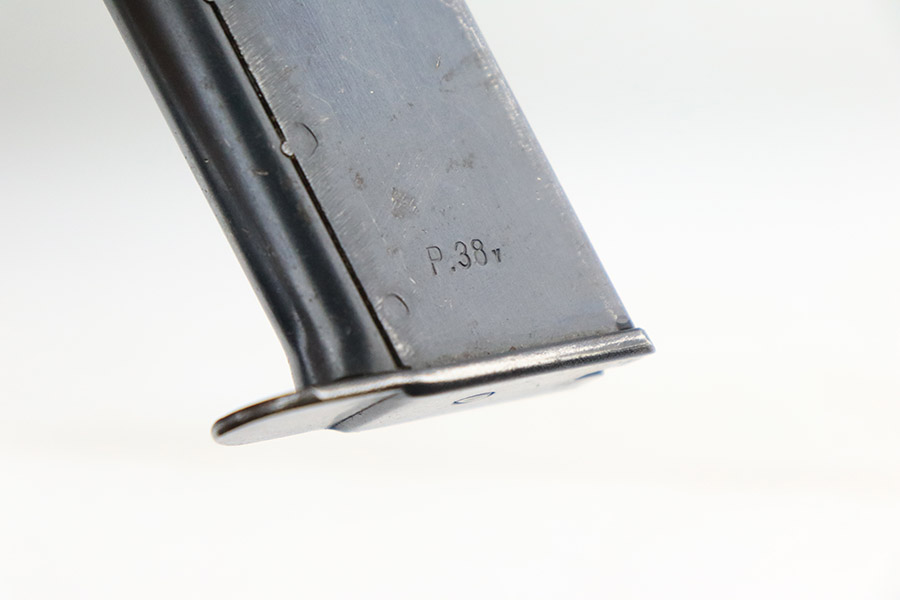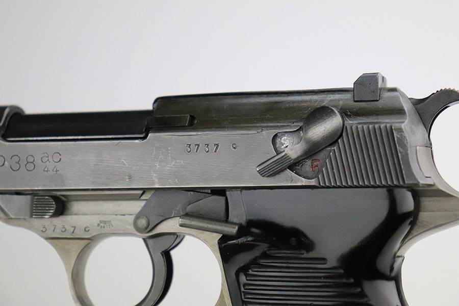 11/7/22 – This is an excellent example of a Mauser Walther P.38 issued to the Nazi military in 1944. It is all matching and has the proper “Waffen 135” Nazi military acceptance proofs throughout. This particular gun has a rare “ac 44” FN-made slide. It has a phosphate-finished frame and slide and a blued barrel, giving it its iconic dual-tone appearance. These phosphate finishes are always difficult to rate, but we estimate it has retained about 95%. There is some minor thinning on the front strap and areas of spotty discoloration here and there (typical). A few tiny handling marks and scratches on the slide. Comes with very nice black plastic grips and a period-correct “Waffen 135” proofed Mauser magazine. Stone-mint bore. De-cocker is functional.