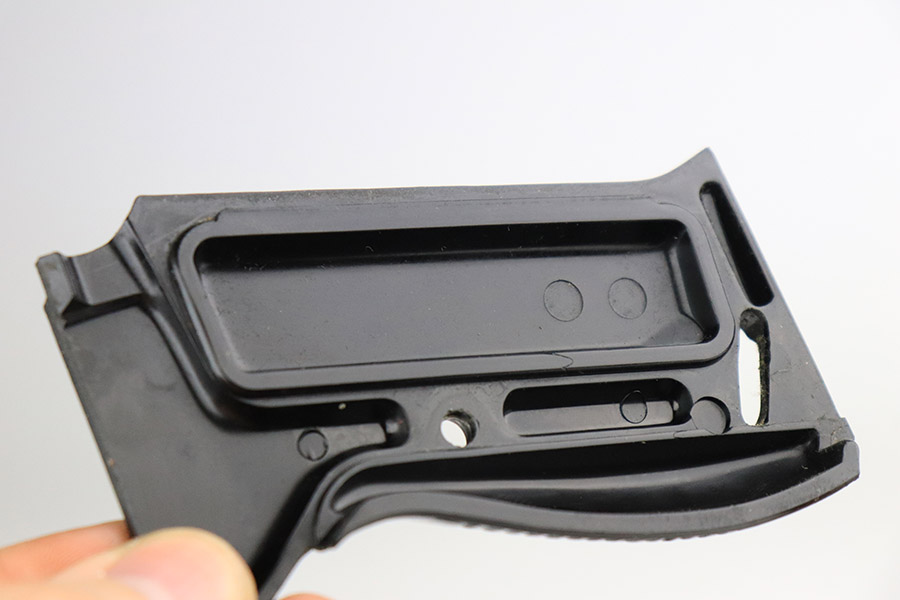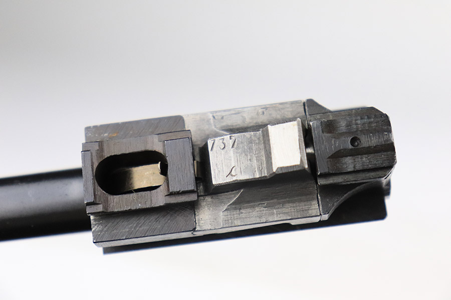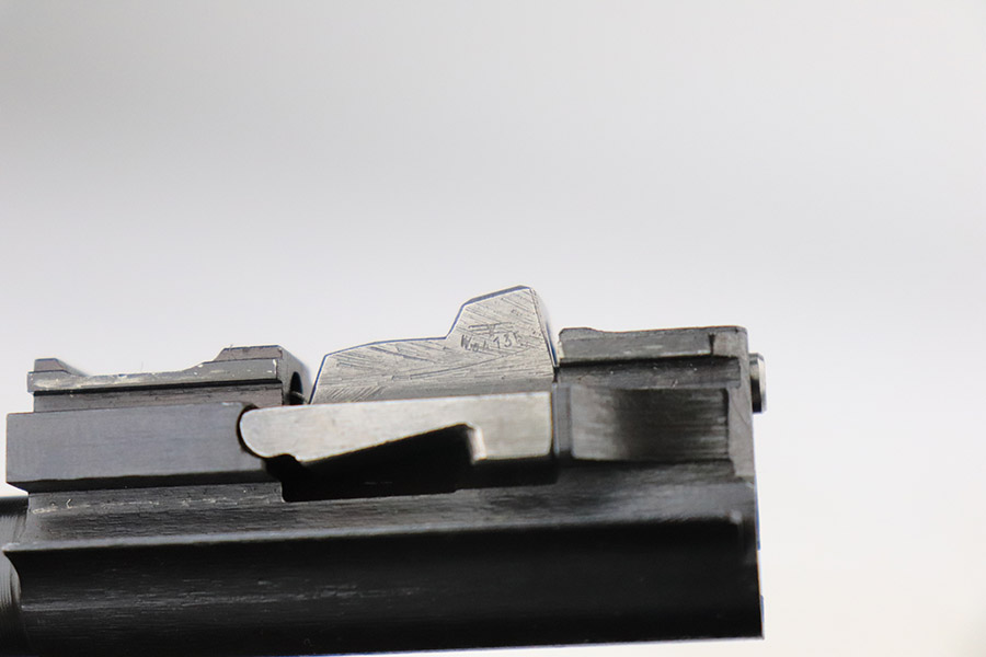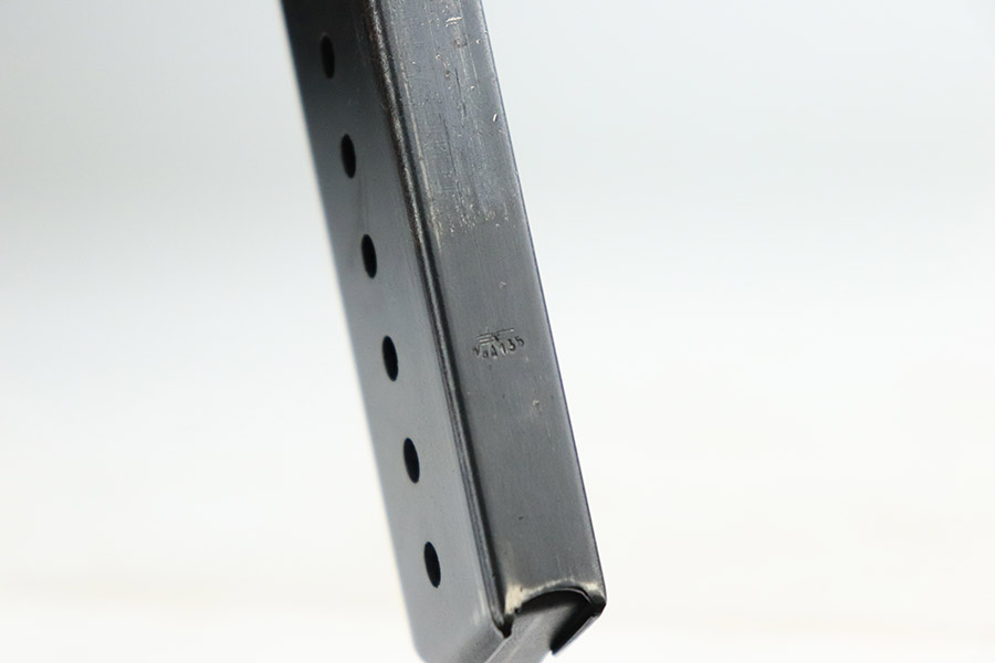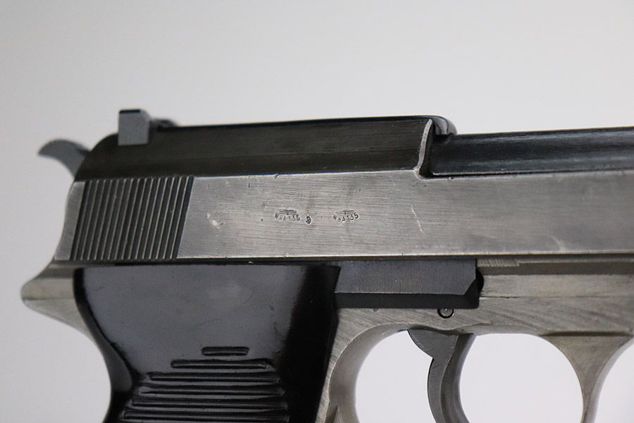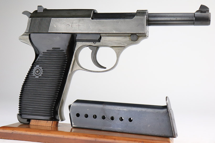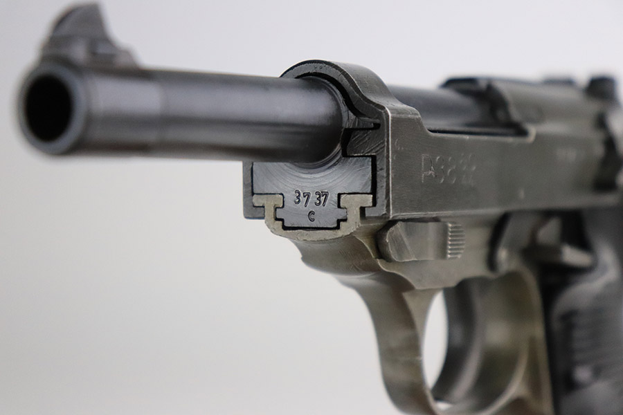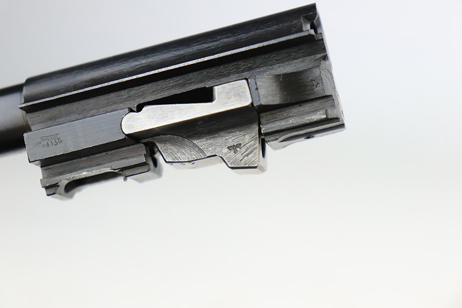 11/7/22 – This is an excellent example of a Mauser Walther P.38 issued to the Nazi military in 1944. It is all matching and has the proper “Waffen 135” Nazi military acceptance proofs throughout. This particular gun has a rare “ac 44” FN-made slide. It has a phosphate-finished frame and slide and a blued barrel, giving it its iconic dual-tone appearance. These phosphate finishes are always difficult to rate, but we estimate it has retained about 95%. There is some minor thinning on the front strap and areas of spotty discoloration here and there (typical). A few tiny handling marks and scratches on the slide. Comes with very nice black plastic grips and a period-correct “Waffen 135” proofed Mauser magazine. Stone-mint bore. De-cocker is functional.