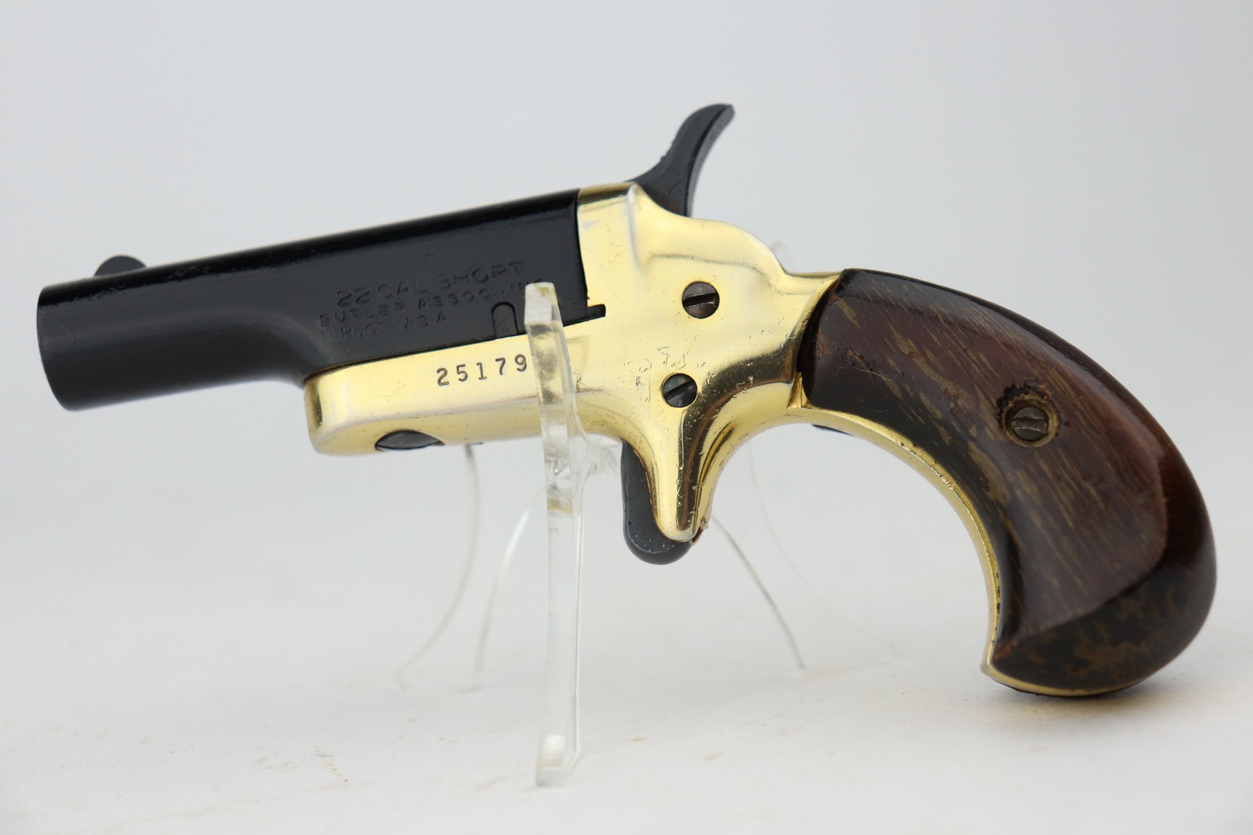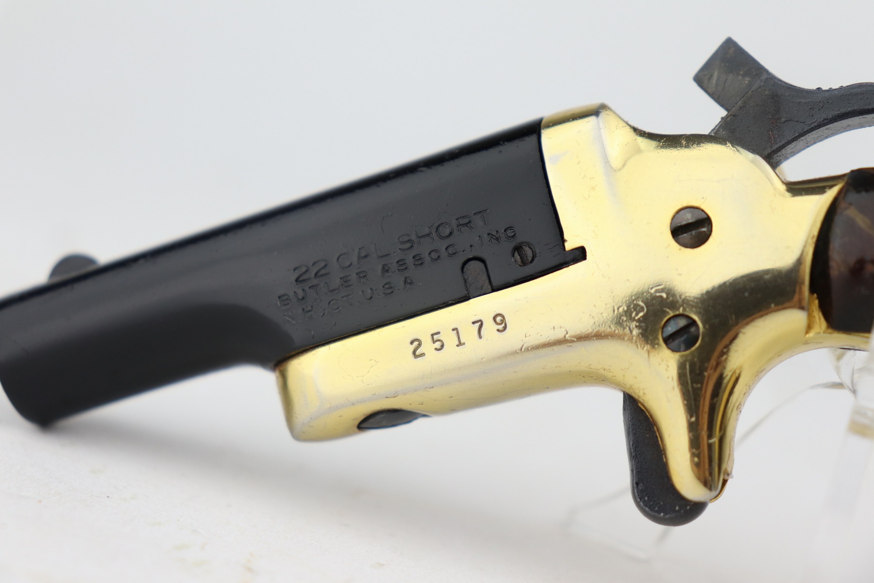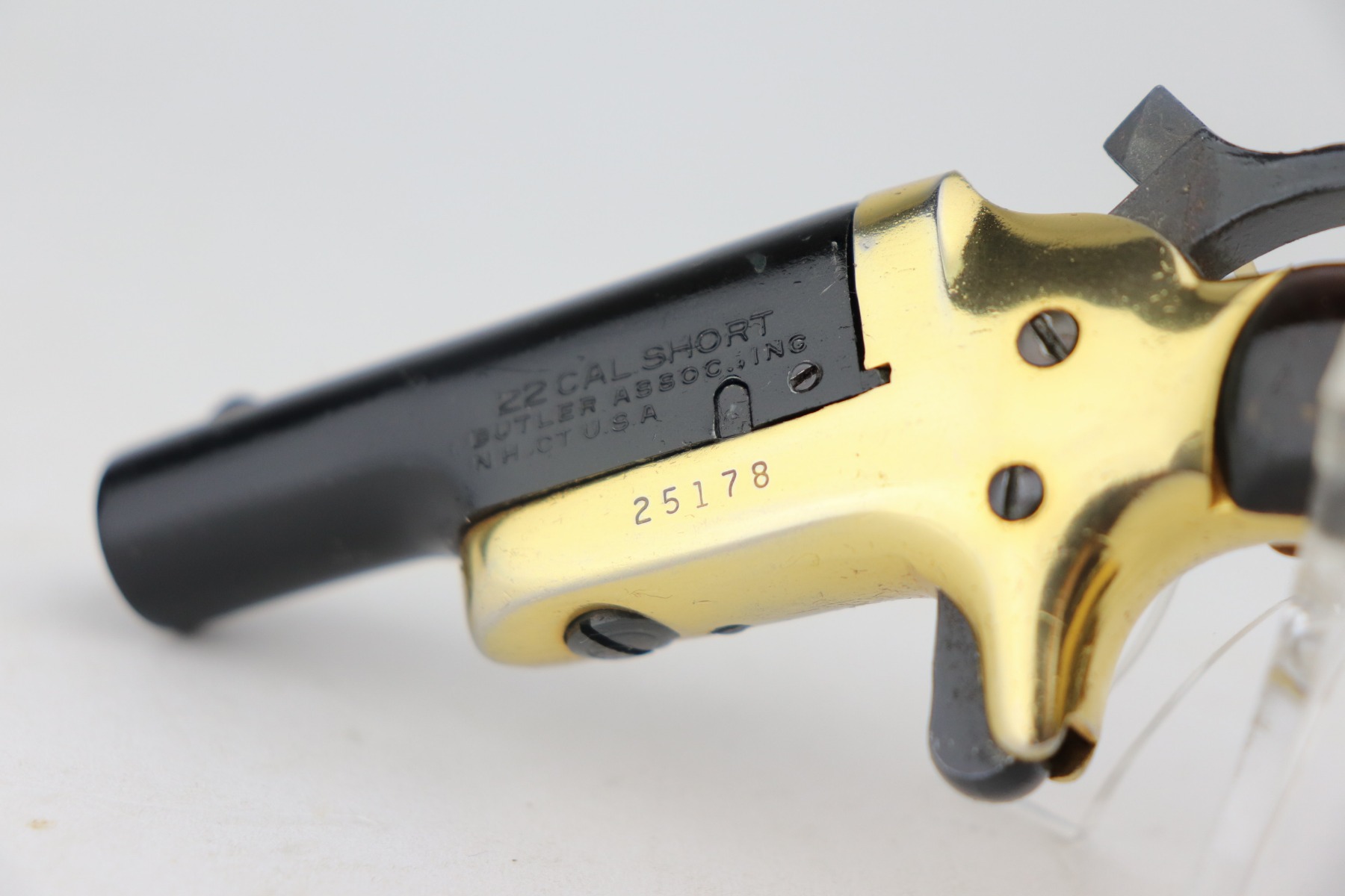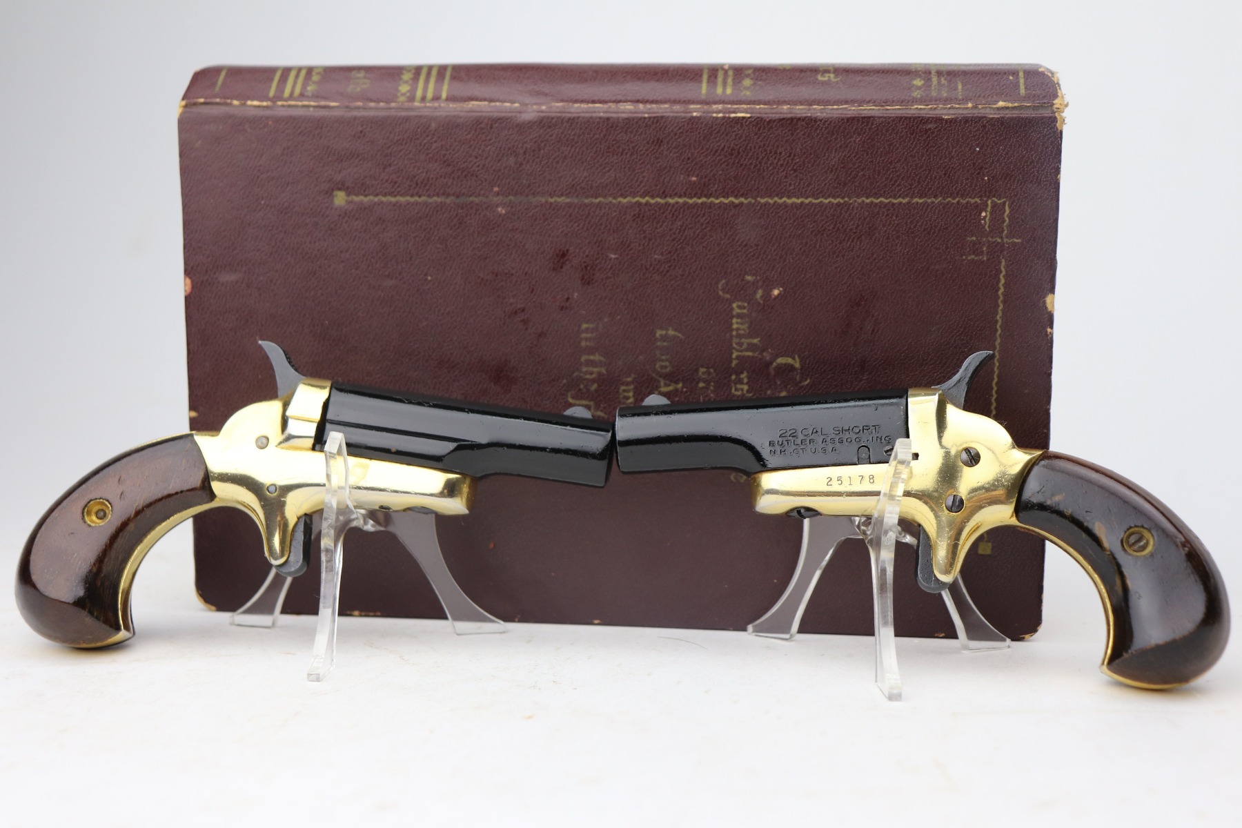 3/19/21 – This is an excellent dueling pair of Butler Derringer .22S single shot pocket pistols, manufactured in the 1950’s. The pistols come in a hidden “book box” lined with maroon velvet. The pistols are fully functional with very minimal wear – just a few marks near the muzzle and on the wood grips. The guns are in virtually identical condition. The frames have a nice gold wash finish and the barrels are black. The bores are excellent – shiny with strong rifling. The “book” is titled “The Gamblers Choice” – very fitting.