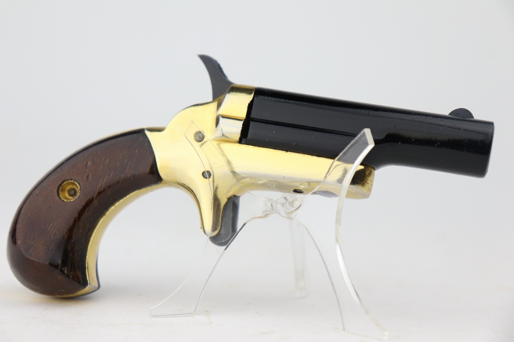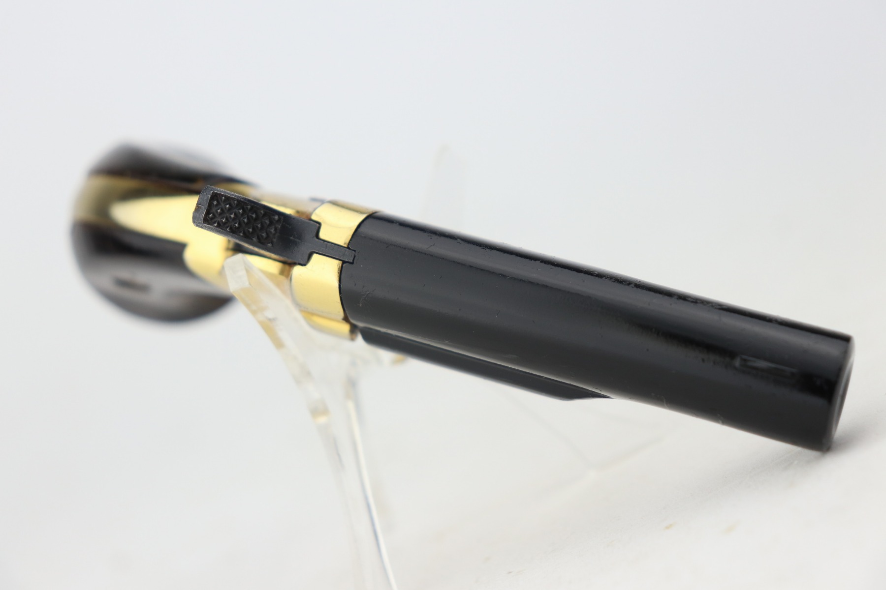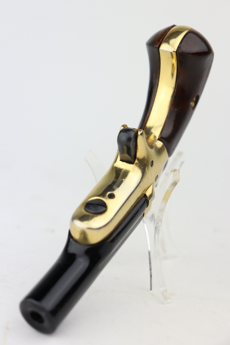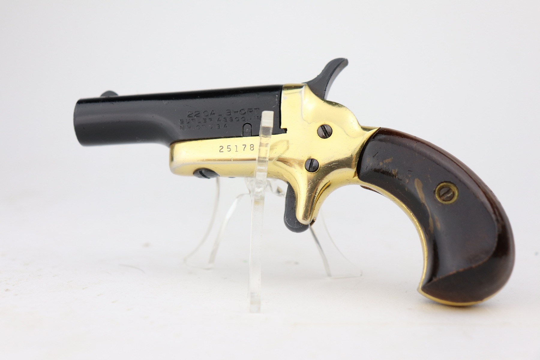 3/19/21 – This is an excellent dueling pair of Butler Derringer .22S single shot pocket pistols, manufactured in the 1950’s. The pistols come in a hidden “book box” lined with maroon velvet. The pistols are fully functional with very minimal wear – just a few marks near the muzzle and on the wood grips. The guns are in virtually identical condition. The frames have a nice gold wash finish and the barrels are black. The bores are excellent – shiny with strong rifling. The “book” is titled “The Gamblers Choice” – very fitting.