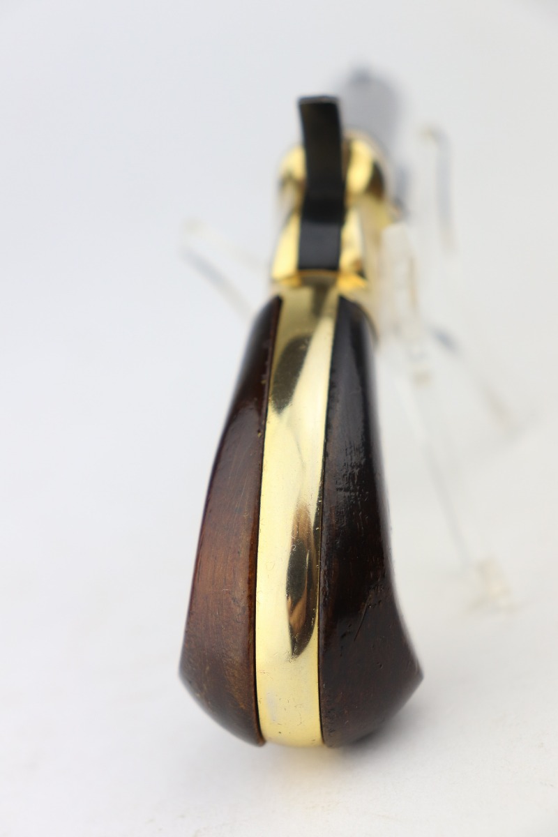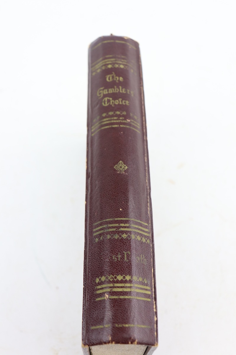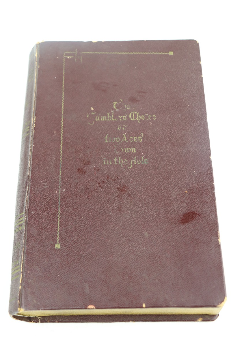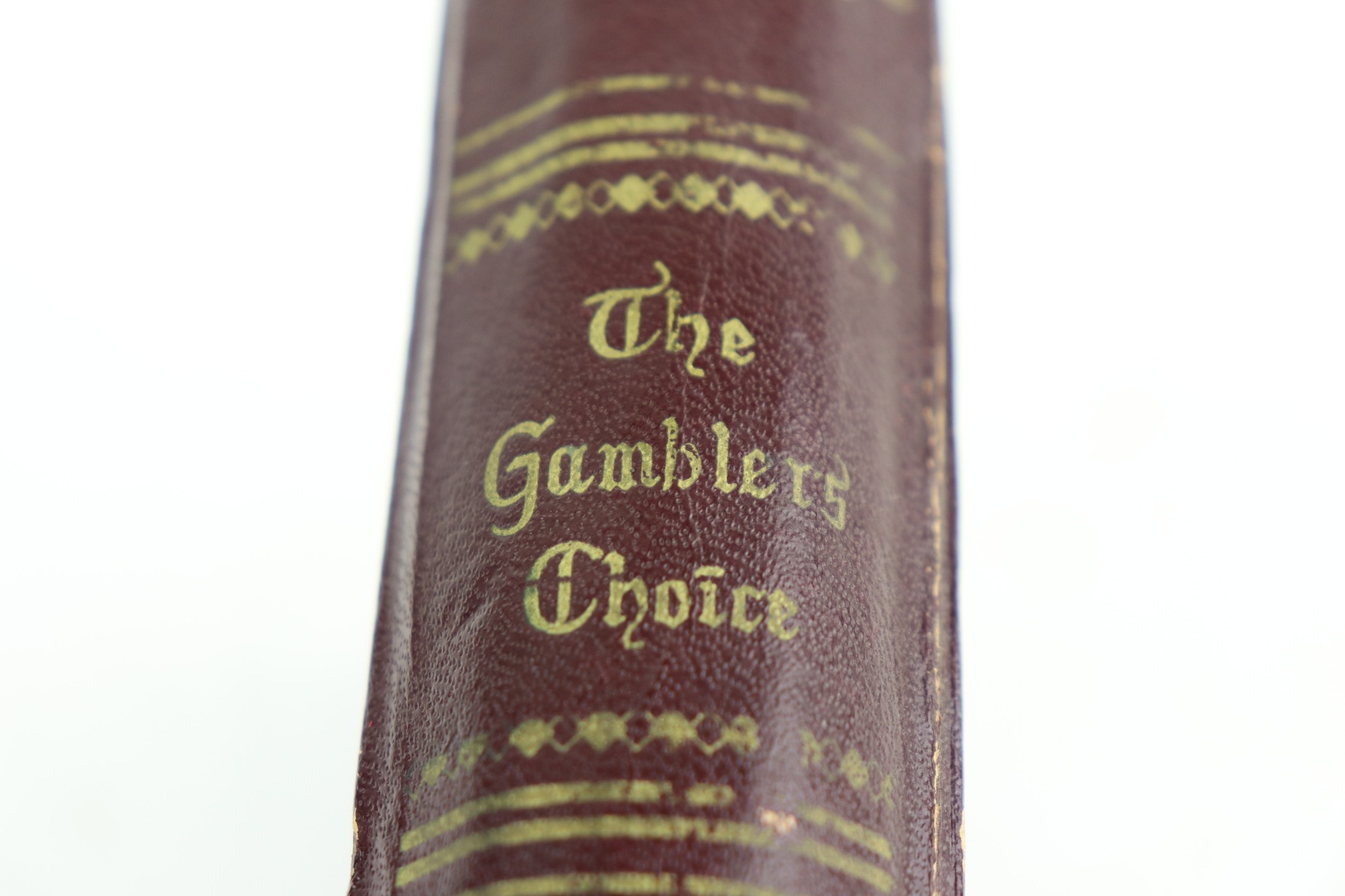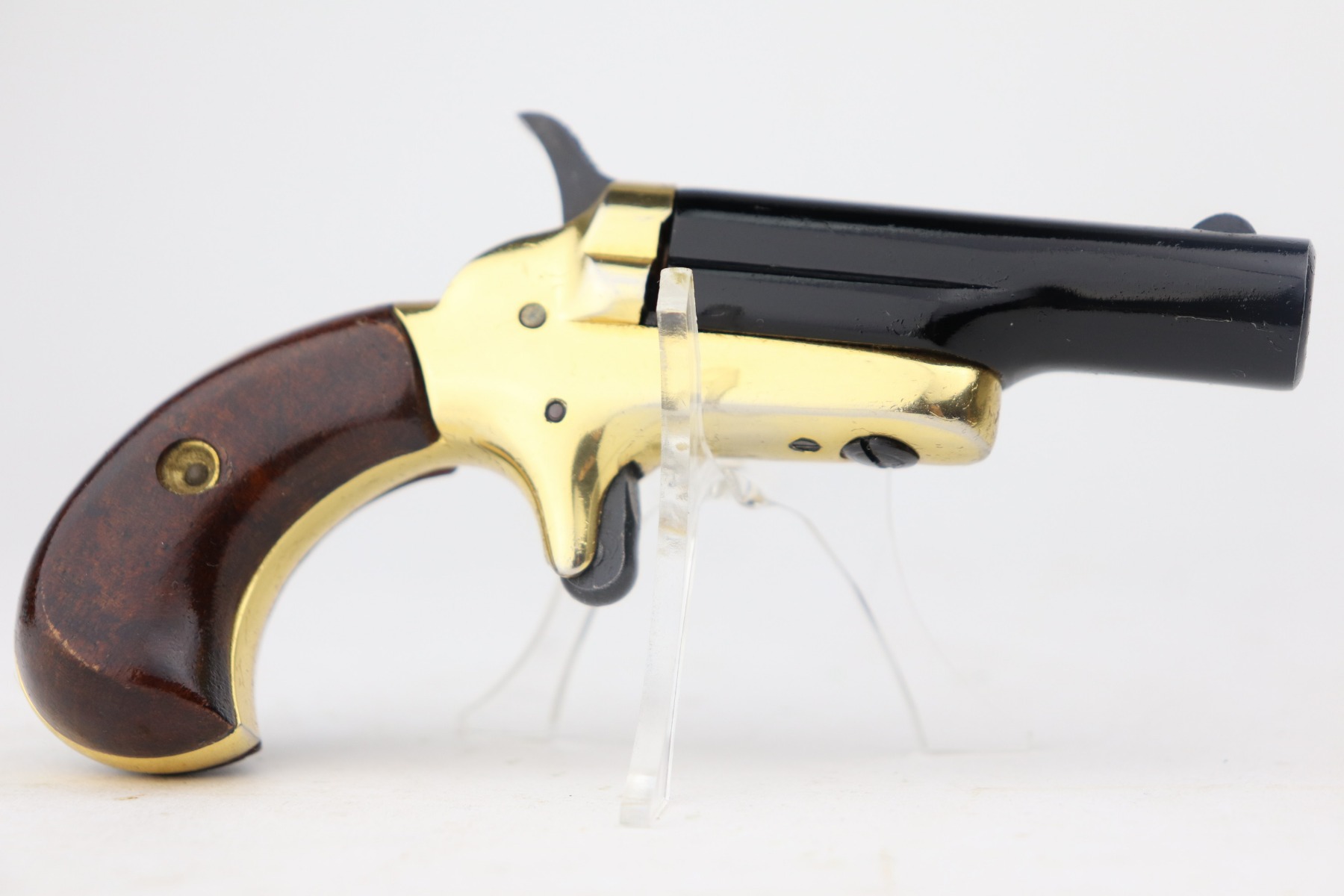 3/19/21 – This is an excellent dueling pair of Butler Derringer .22S single shot pocket pistols, manufactured in the 1950’s. The pistols come in a hidden “book box” lined with maroon velvet. The pistols are fully functional with very minimal wear – just a few marks near the muzzle and on the wood grips. The guns are in virtually identical condition. The frames have a nice gold wash finish and the barrels are black. The bores are excellent – shiny with strong rifling. The “book” is titled “The Gamblers Choice” – very fitting.