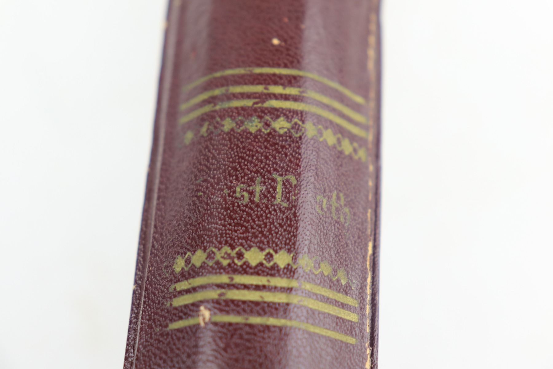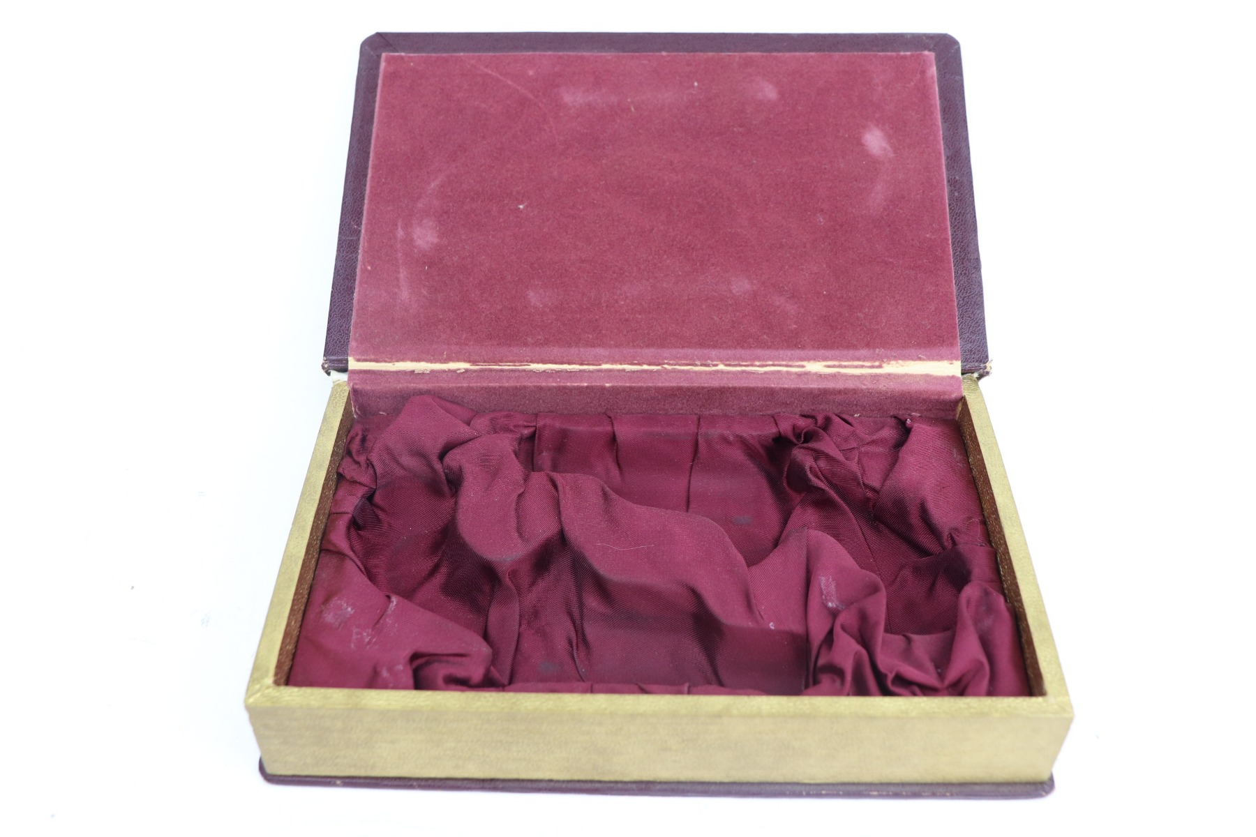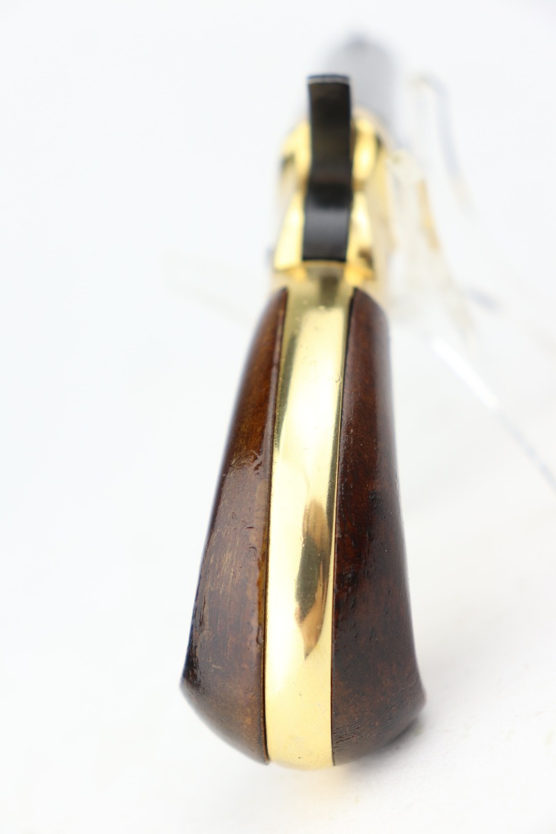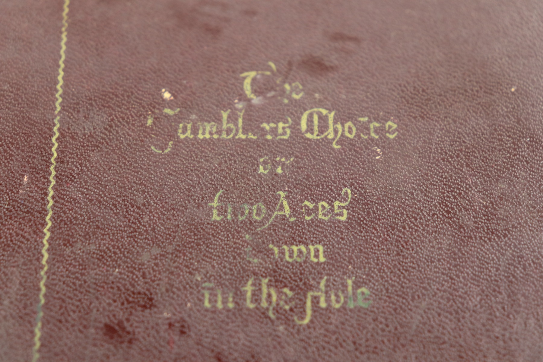 3/19/21 – This is an excellent dueling pair of Butler Derringer .22S single shot pocket pistols, manufactured in the 1950’s. The pistols come in a hidden “book box” lined with maroon velvet. The pistols are fully functional with very minimal wear – just a few marks near the muzzle and on the wood grips. The guns are in virtually identical condition. The frames have a nice gold wash finish and the barrels are black. The bores are excellent – shiny with strong rifling. The “book” is titled “The Gamblers Choice” – very fitting.