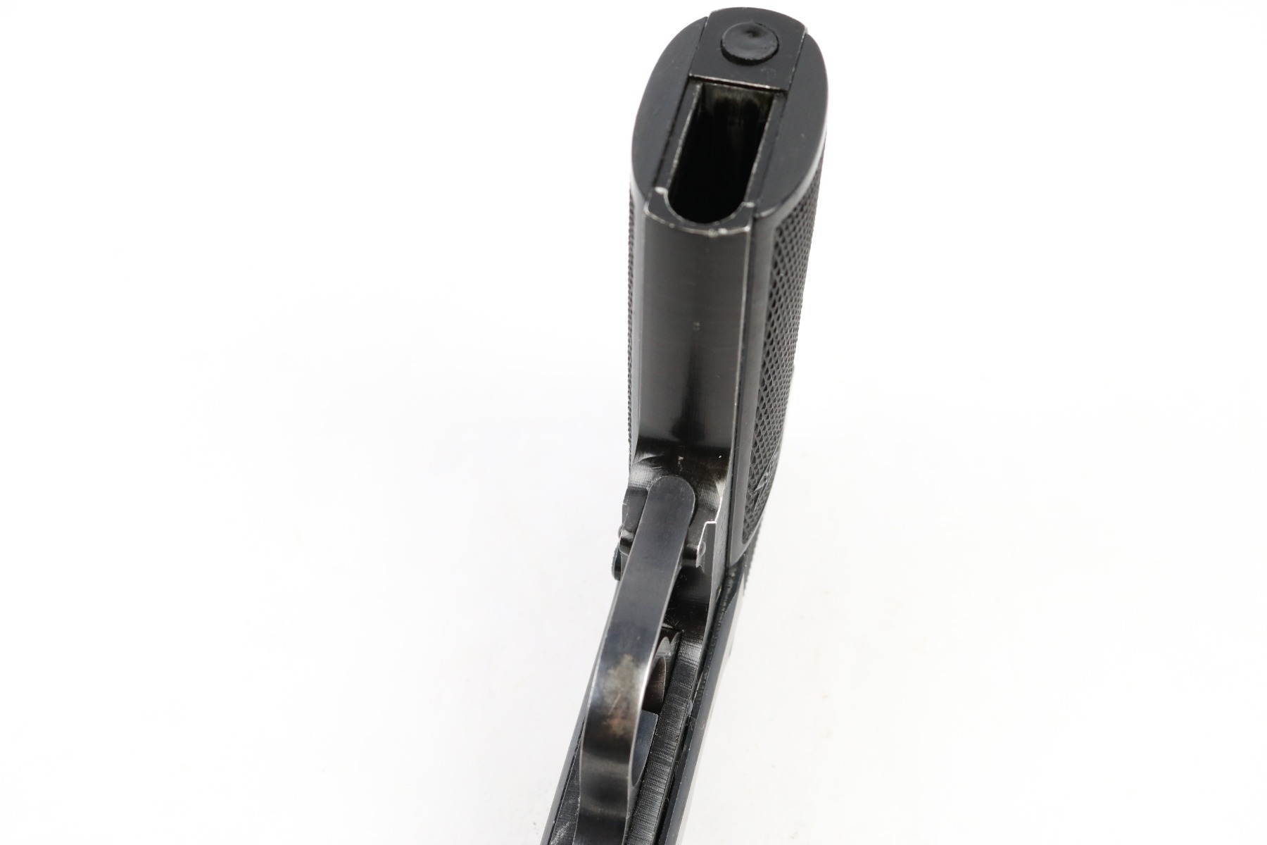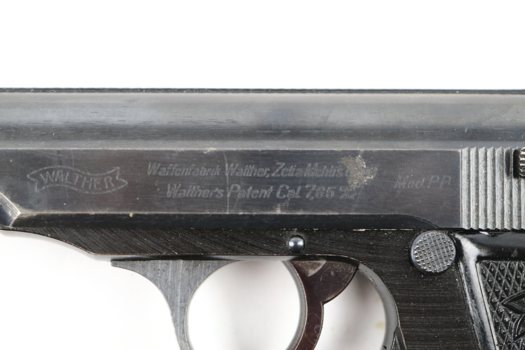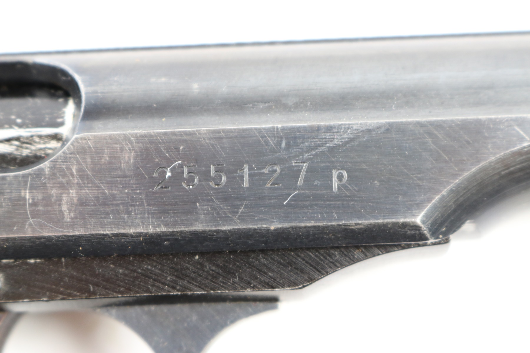 5/21/18 – This is an excellent Dural Walther PP pistol made during WW2. The pistol has a dull blued finish and duraluminum frame, making the pistol lighter than most. The dural frames are usually worth and scratched, as the metal was lighter it also was softer and often times looks beat up when found today. This one has a beautiful frame with minimal strap wear. The slide has a spot of patina at the end of the legend and normal edge wear/muzzle wear. The bore is excellent and clean with some signs of use – 9 out of 10 overall. The pistol is guaranteed original and authentic.