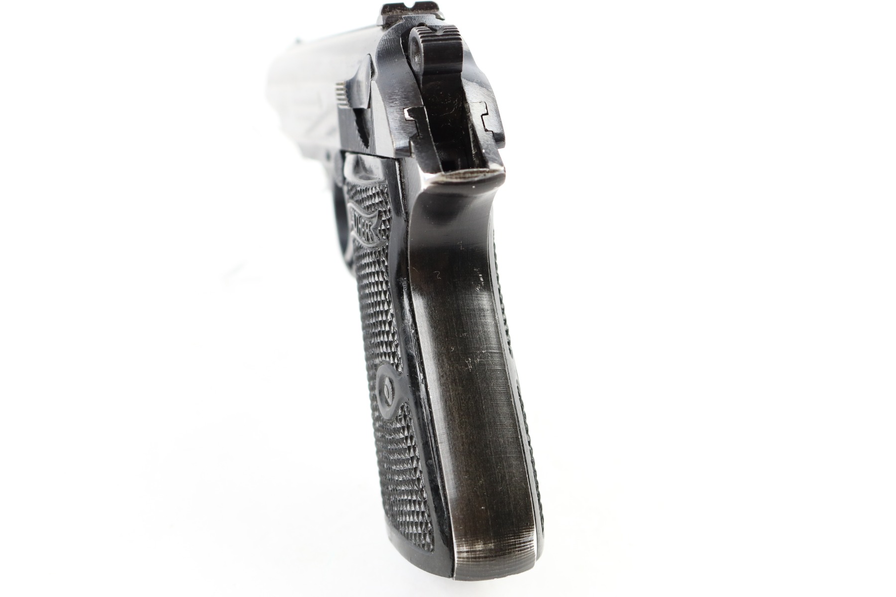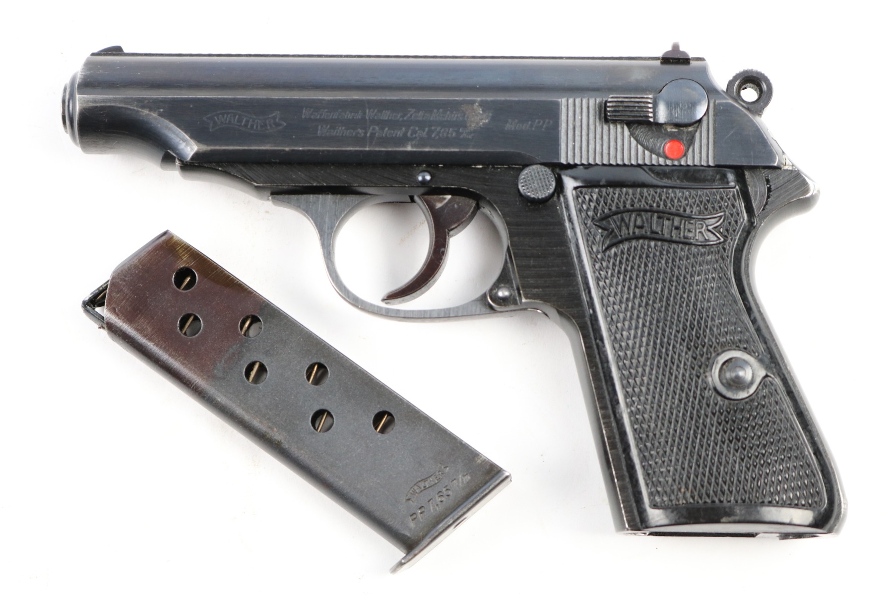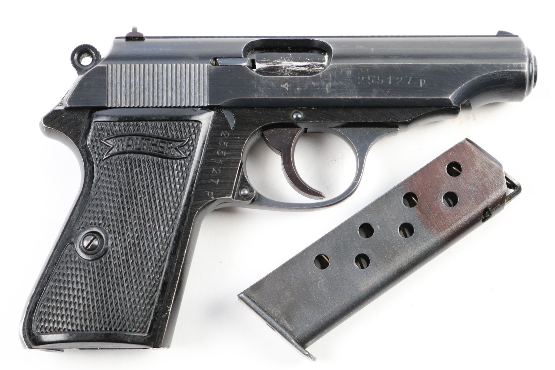 5/21/18 – This is an excellent Dural Walther PP pistol made during WW2. The pistol has a dull blued finish and duraluminum frame, making the pistol lighter than most. The dural frames are usually worth and scratched, as the metal was lighter it also was softer and often times looks beat up when found today. This one has a beautiful frame with minimal strap wear. The slide has a spot of patina at the end of the legend and normal edge wear/muzzle wear. The bore is excellent and clean with some signs of use – 9 out of 10 overall. The pistol is guaranteed original and authentic.
