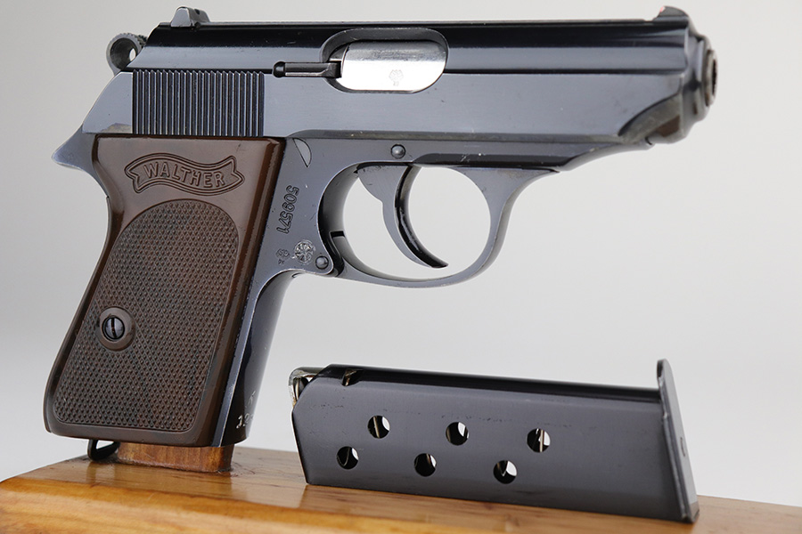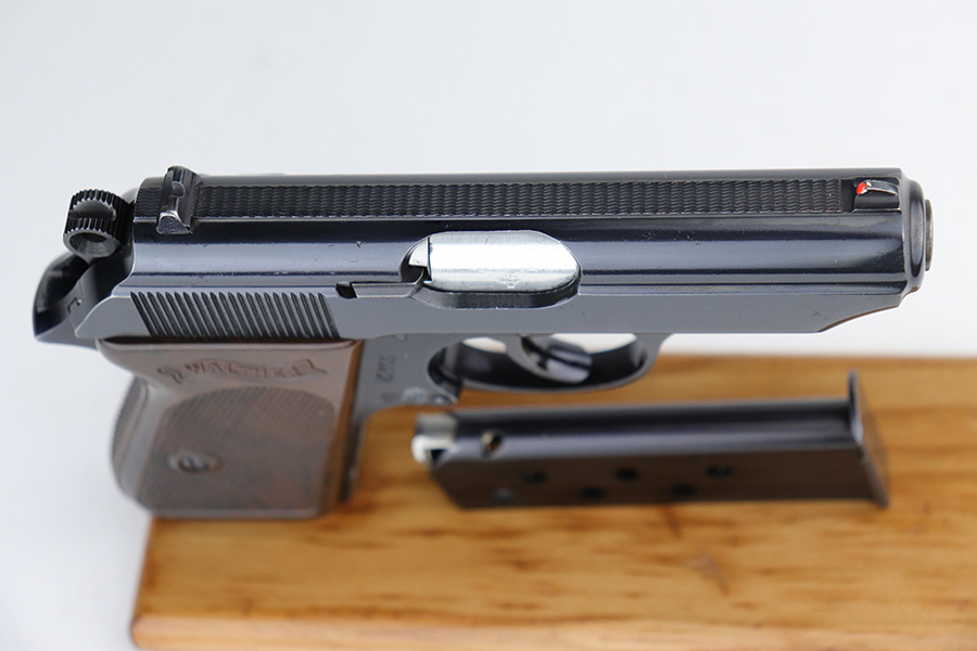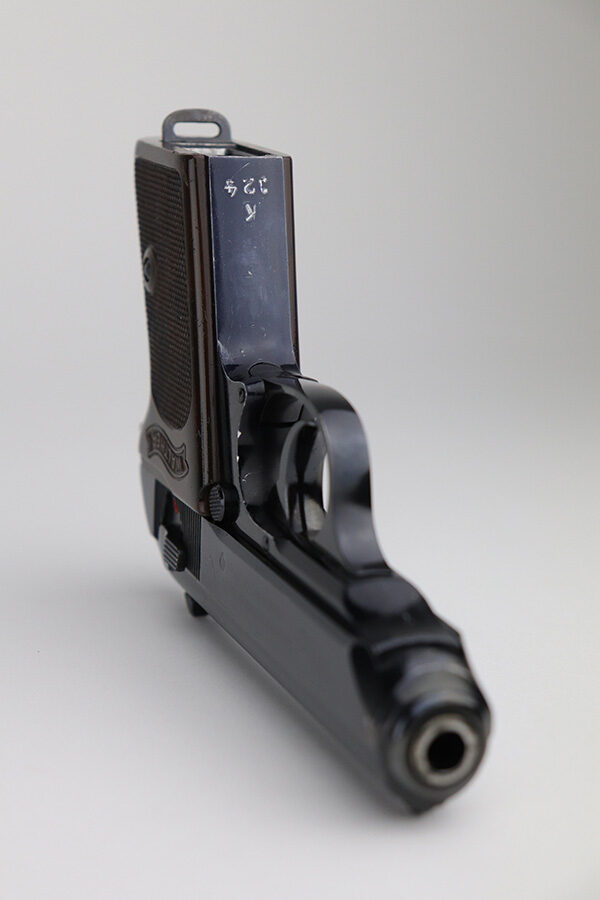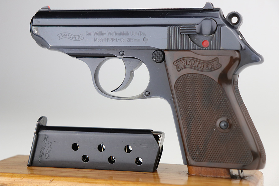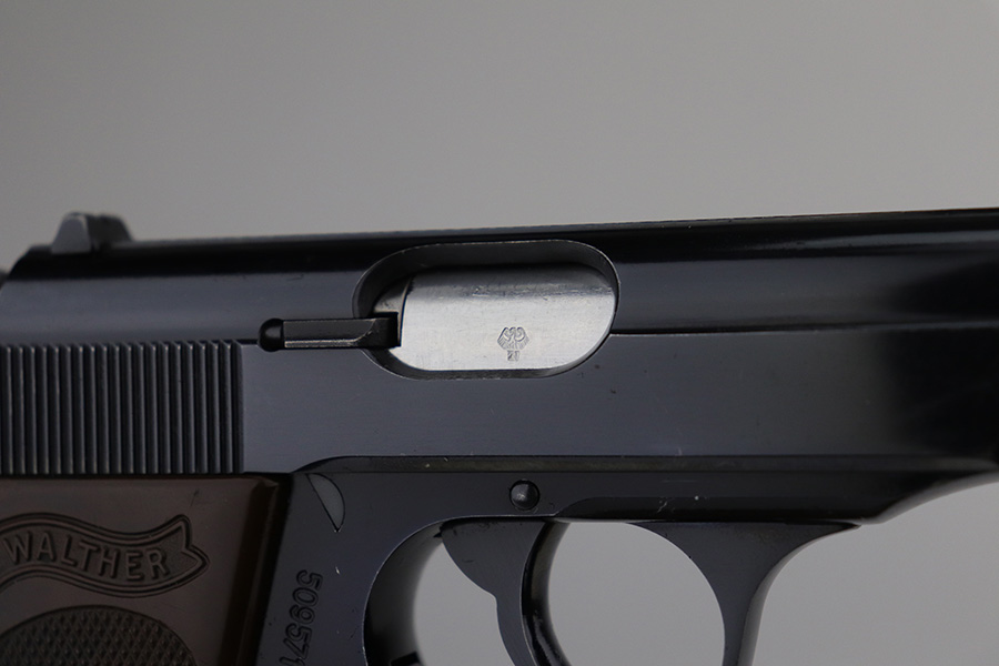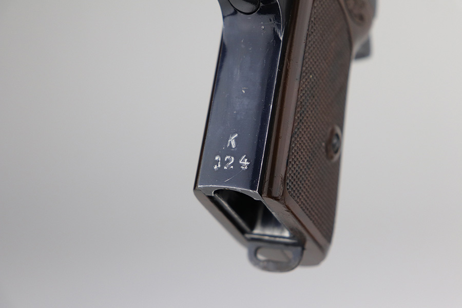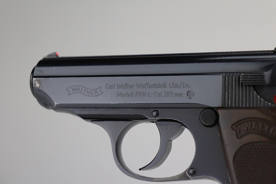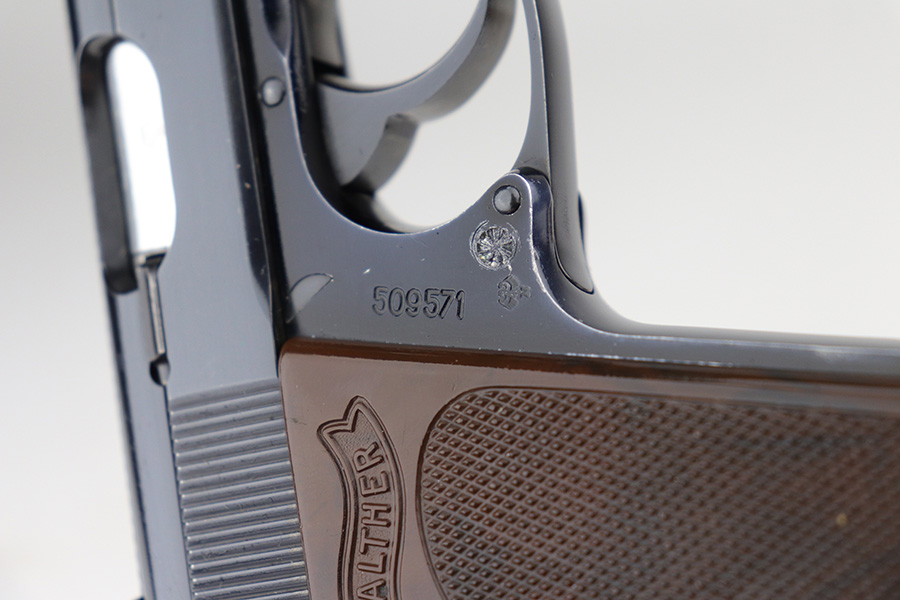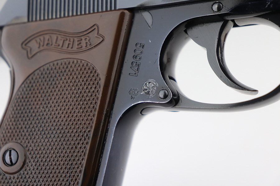 9/1/21 – This is a minty example of a rare Walther PPK-L manufactured in the 1950’s. These PPK-L guns are scarce and have a lightweight aluminum alloy frame. This one is especially rare because it has no import marks and is chambered in 7.65mm. We believe this one was issued to the Berlin police department. There appears to be a Berlin Rosette on the right side of the trigger guard and a police unit marking on the front strap. It has retained about 98% of its original finish. There is very minor wear around the muzzle and some light handling marks on the underside of the frame and on the front strap. Comes with an excellent grip and a proper magazine. Mint bore.