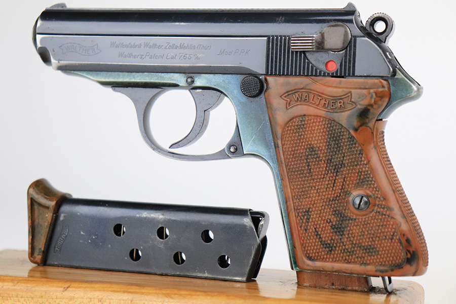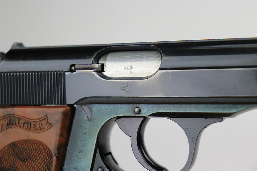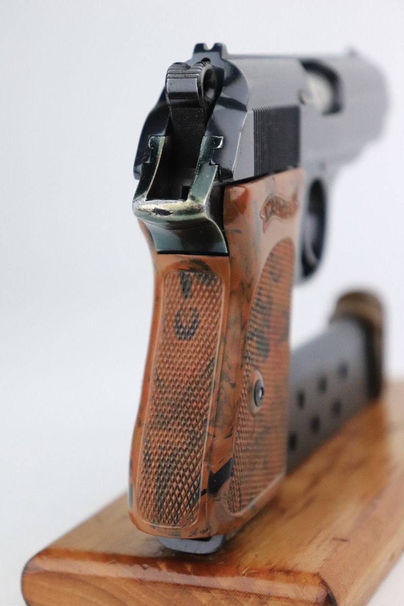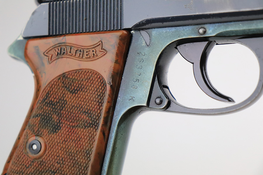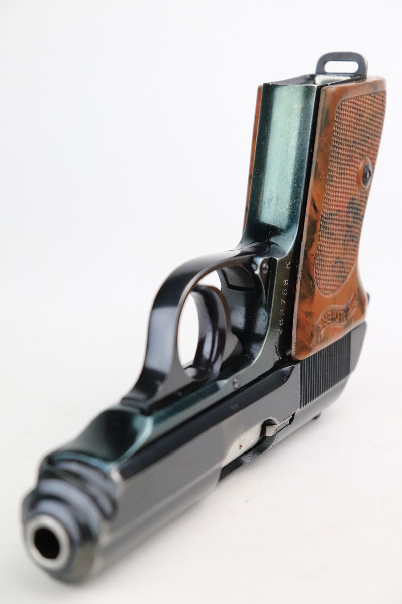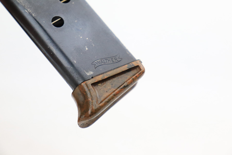 6/14/22 – This is a very nice example of a Walther PPK sold in the commercial market in 1940. This one is special because it has a lightweight duraluminum frame. It is all matching and has the proper “Eagle N” commercial proofs. It comes as a rig with a generic un-marked tan leather holster, a Walther banner-only finger extension magazine, and one flat-bottom wartime magazine. It has retained roughly 85% of its original finish. There is minor thinning on the front strap and near the edges of the frame. There is also minor muzzle wear and some light spotty wear along both sides of the slide, concentrated mostly around the high edges. Comes with an excellent period-correct brown Walther grip. Minty bore.