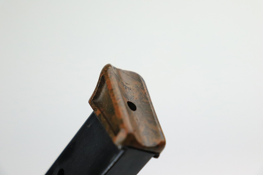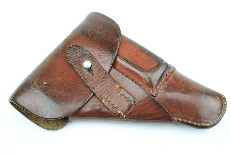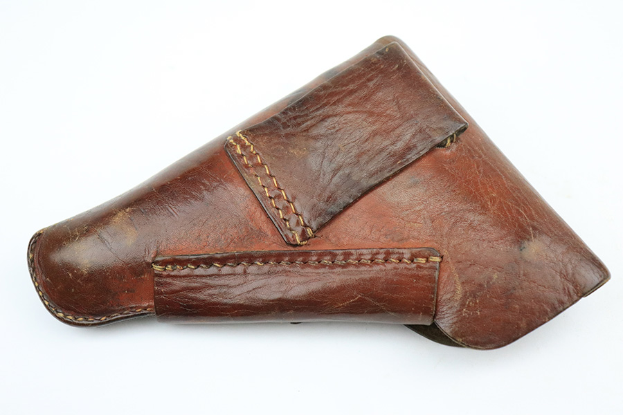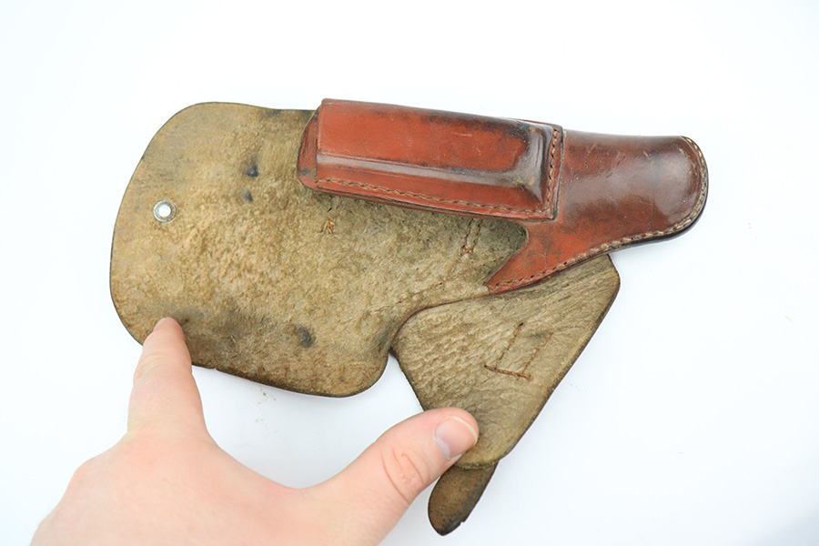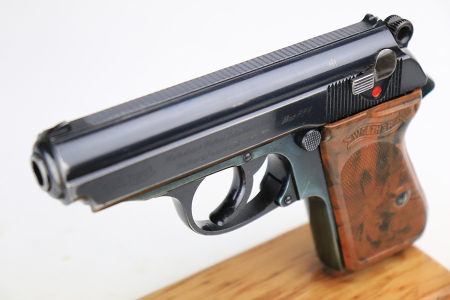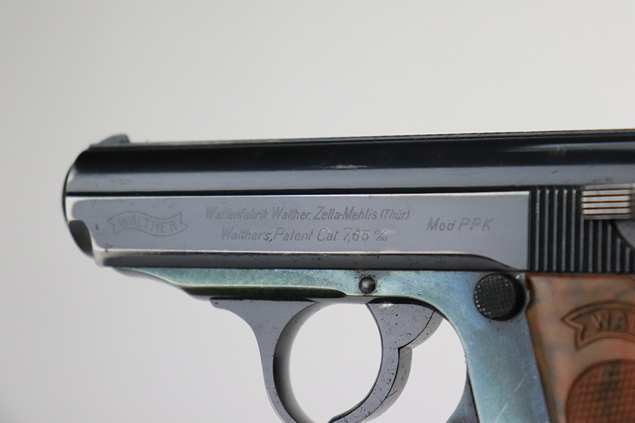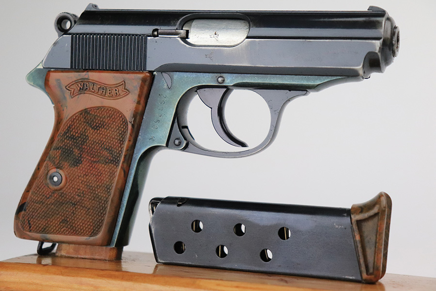 6/14/22 – This is a very nice example of a Walther PPK sold in the commercial market in 1940. This one is special because it has a lightweight duraluminum frame. It is all matching and has the proper “Eagle N” commercial proofs. It comes as a rig with a generic un-marked tan leather holster, a Walther banner-only finger extension magazine, and one flat-bottom wartime magazine. It has retained roughly 85% of its original finish. There is minor thinning on the front strap and near the edges of the frame. There is also minor muzzle wear and some light spotty wear along both sides of the slide, concentrated mostly around the high edges. Comes with an excellent period-correct brown Walther grip. Minty bore.