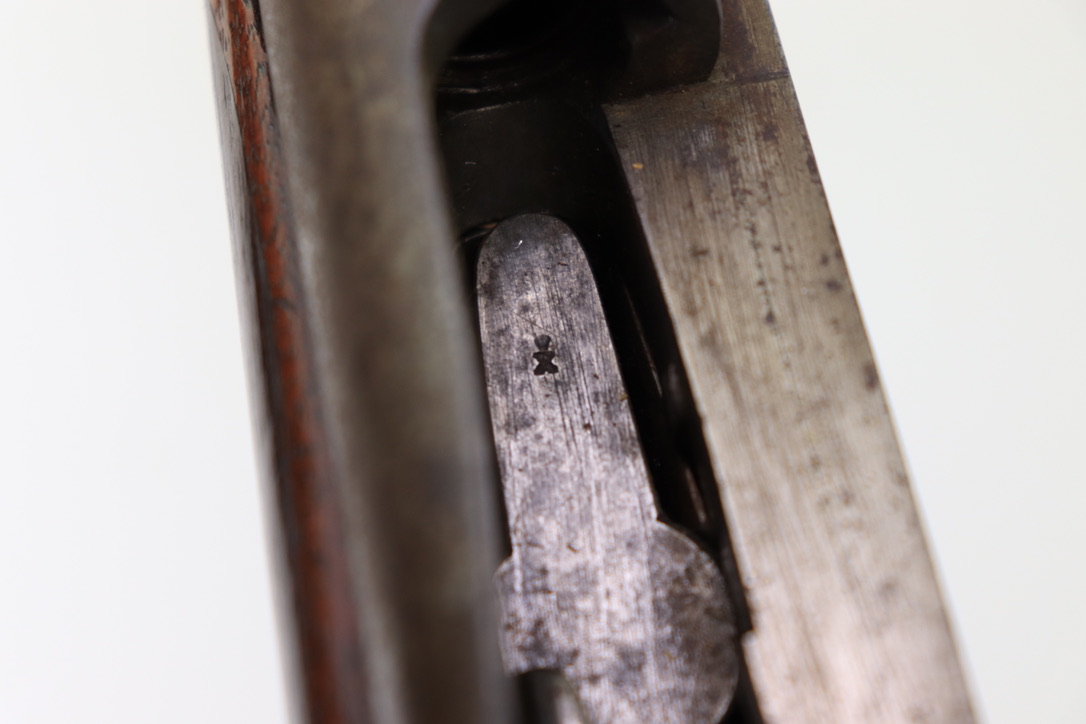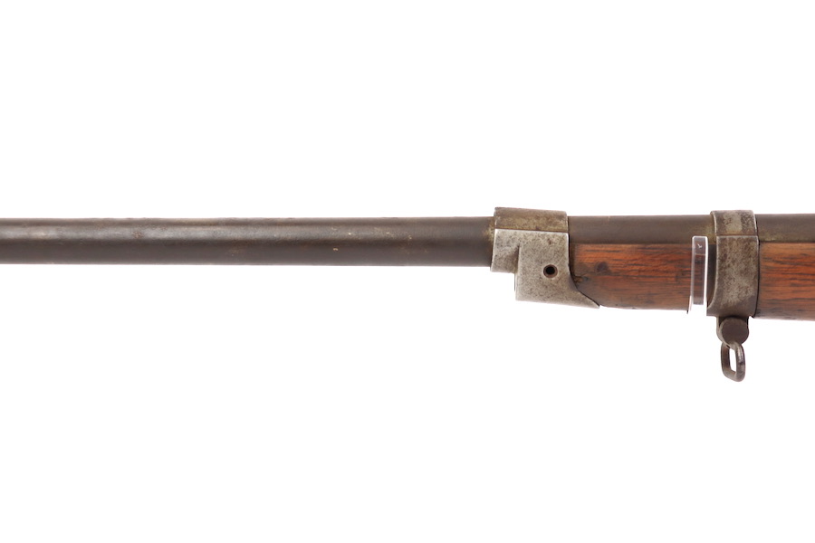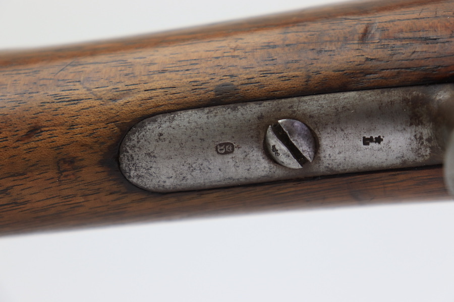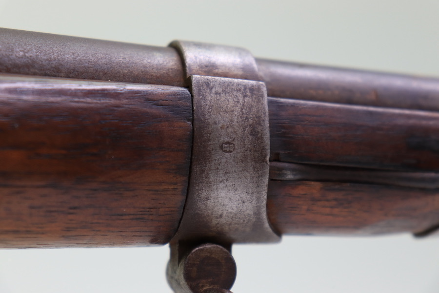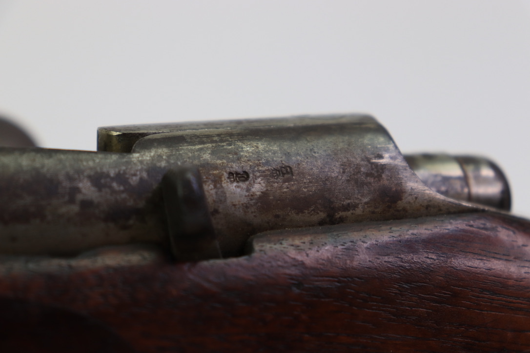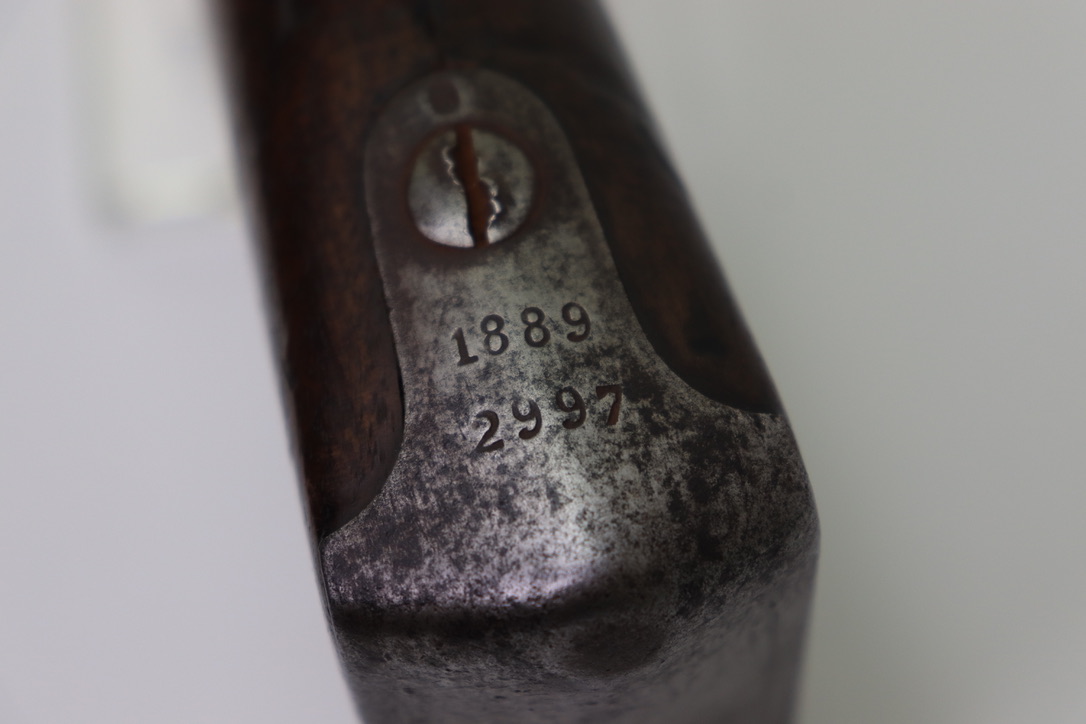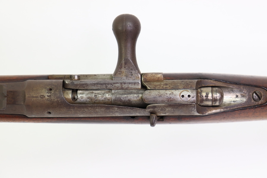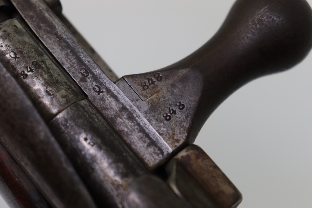 8/24/23 – This is an original Dutch Beaumont rifle Model 1871/88. A heavy patina is present down the length of the barrel, as well as most of the action and magazine. There’s no rust or pitting despite this patina, with the exception of the front sight blade. The bore rates 7.5/10 with strong rifling considering age; however, the bore does suffer from pitting, likely due to corrosive ammo. All moving parts function as they should, and there is a magazine disconnect on the left side of the gun. Two things to note: there is a screw missing from the outermost barrel band, and two good size gouges are on the right side of the stock near the butt plate. The gun is all matching, including the bolt, barrel, and magazine follower.